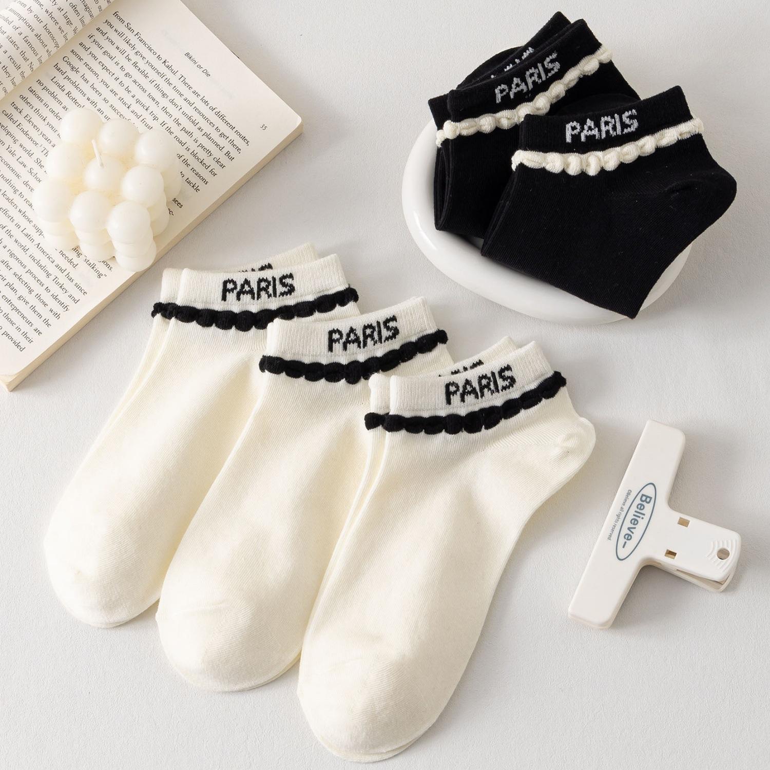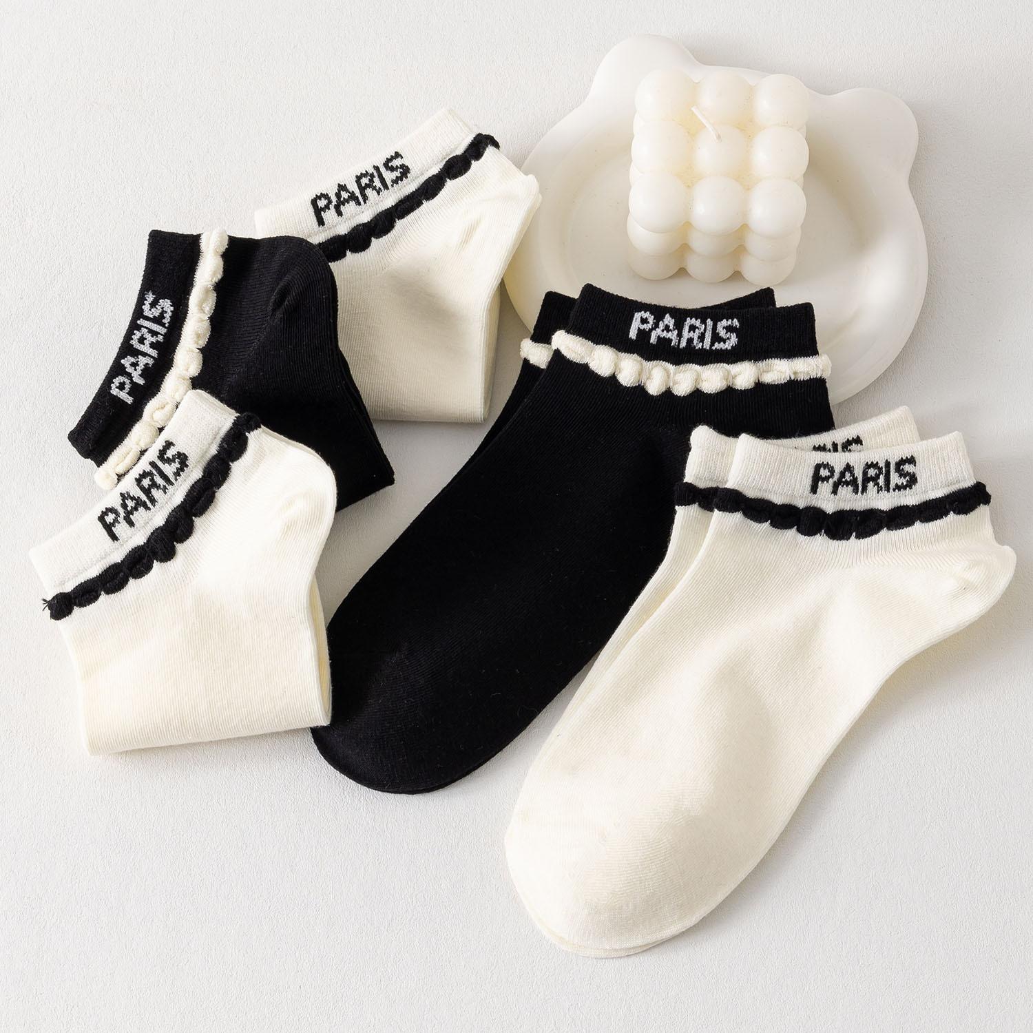 Meias Finas de Verão Meias Femininas Boca Rasa Respiráveis Meias de Algodão Letras Fofas Doce Preto e Branco Meias Sapatilha Estudante Estilo Verão