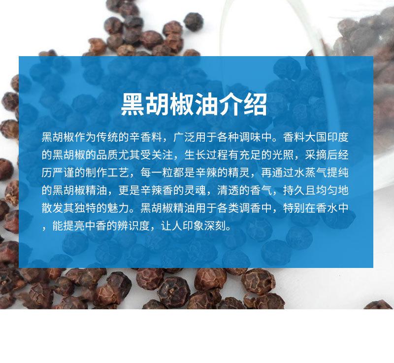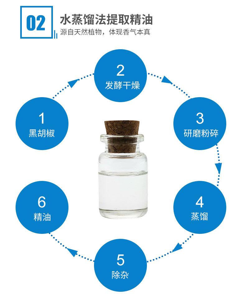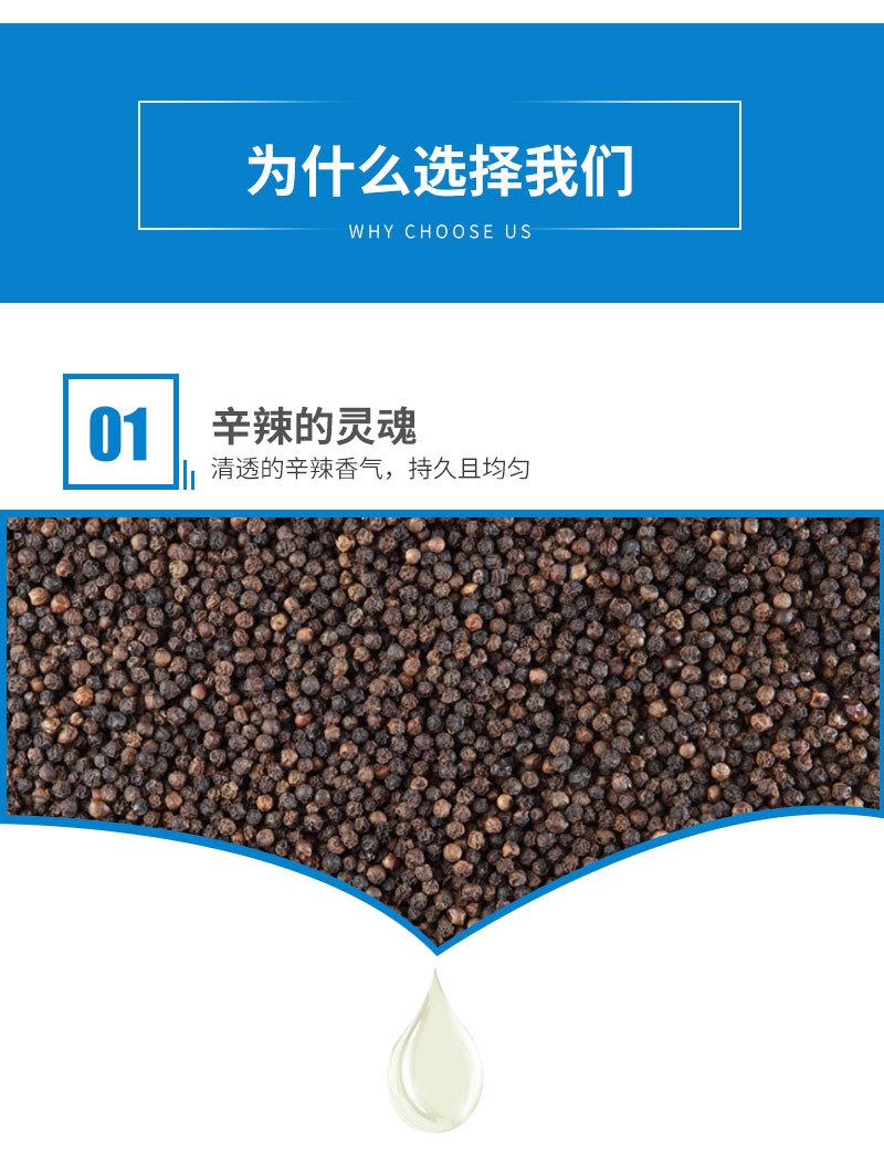 2. O óleo de pimenta preta é usado em fórmulas de sabor e tempero de alimentos. É usado para aroma de pimenta preta fresca, recém-moída, tempero para rosbife, intensificador de sabor modulador, notas aromáticas salgadas e herbais, tequila, etc.