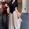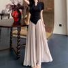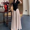 Novo Terno Estilo Nacional Chinoiserie para Mulheres 2025 Novo Top Preto Assimétrico Calças de Cintura Alta Drapeadas de Perna Larga Saia Conjunto de Duas Peças