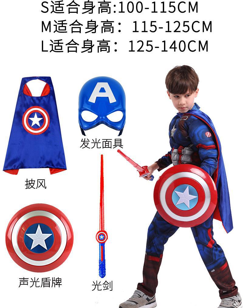 Capa infantil do Capitão América, máscara de escudo luminoso, espada de som e luz, pulseira, cinto, roupas de performance de Halloween, terno