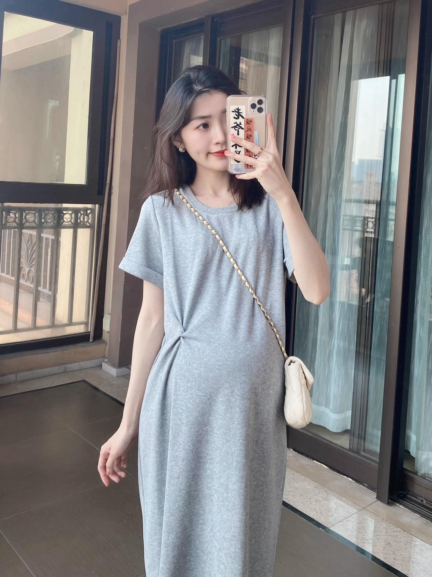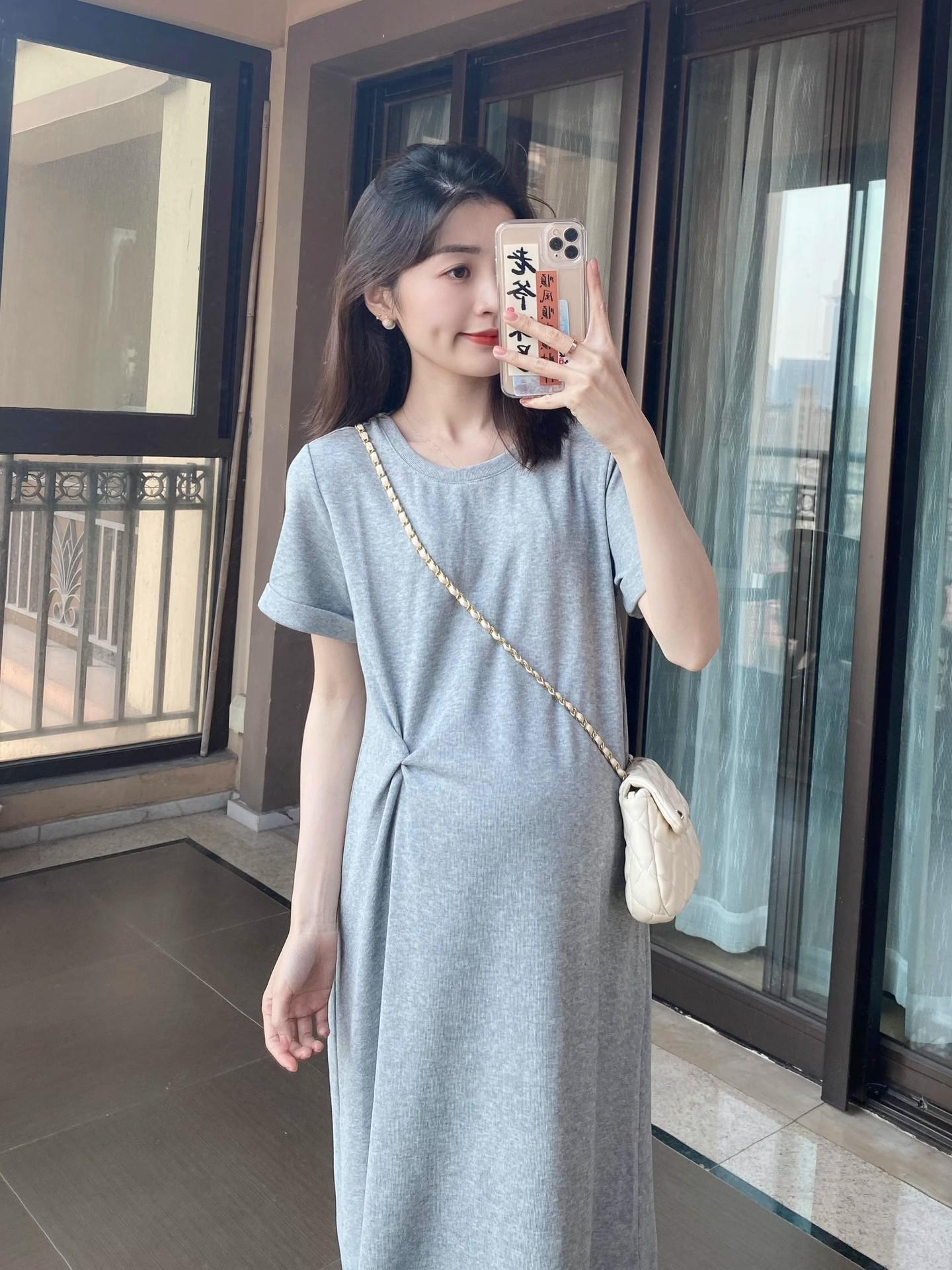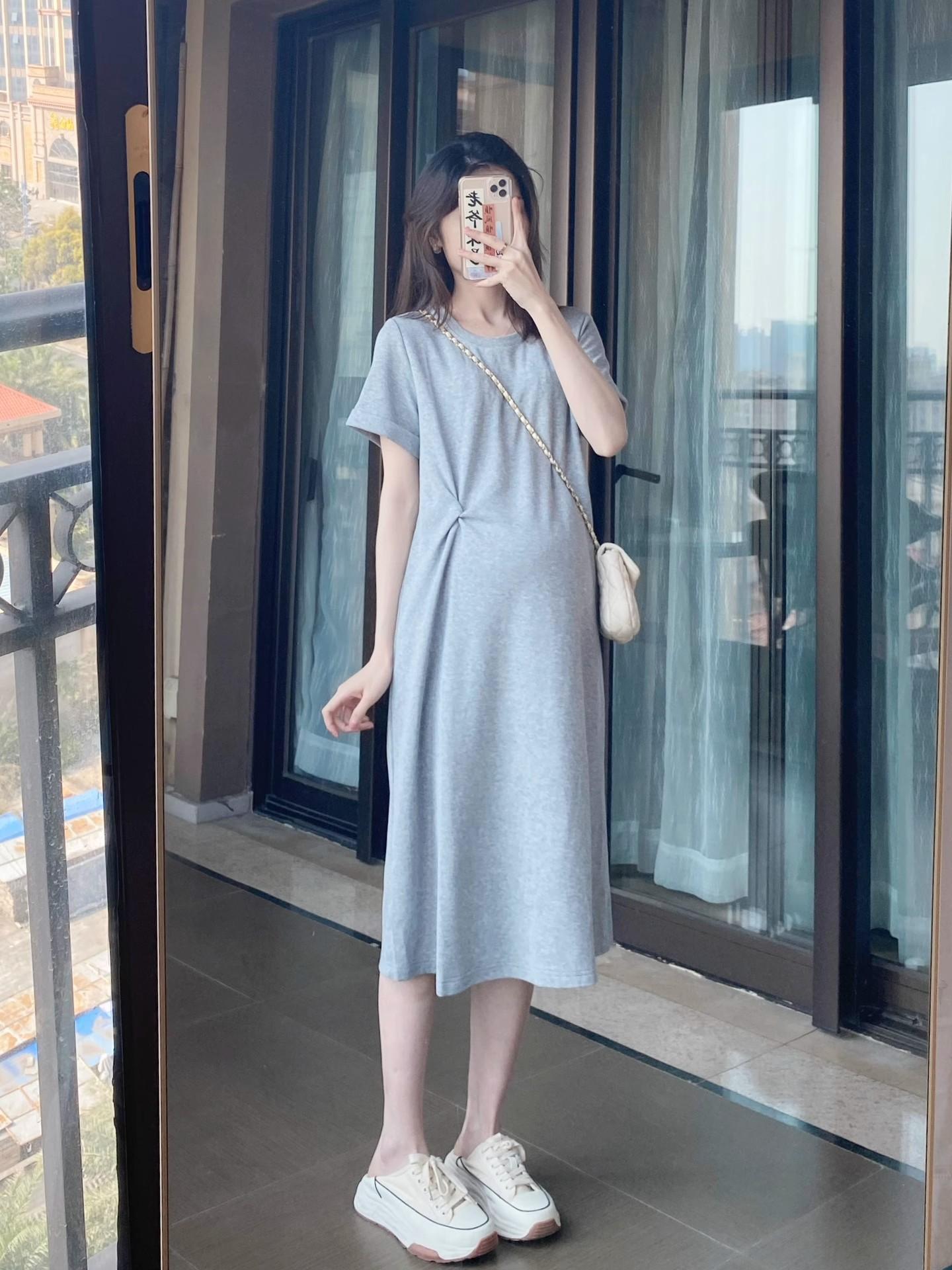 Vestido de Maternidade Verão 2025 Novo Estilo Coreano Casual Emagrecimento Solto Gola Redonda Manga Curta Saia Roupa de Maternidade Vestido de Verão