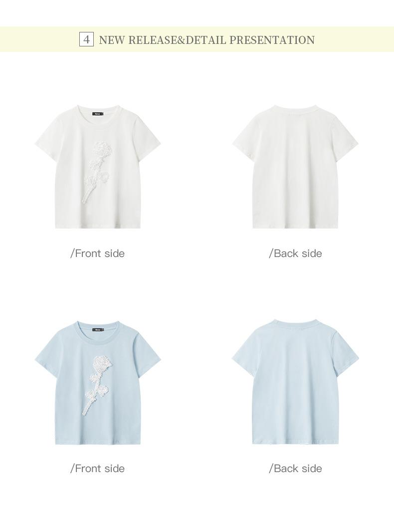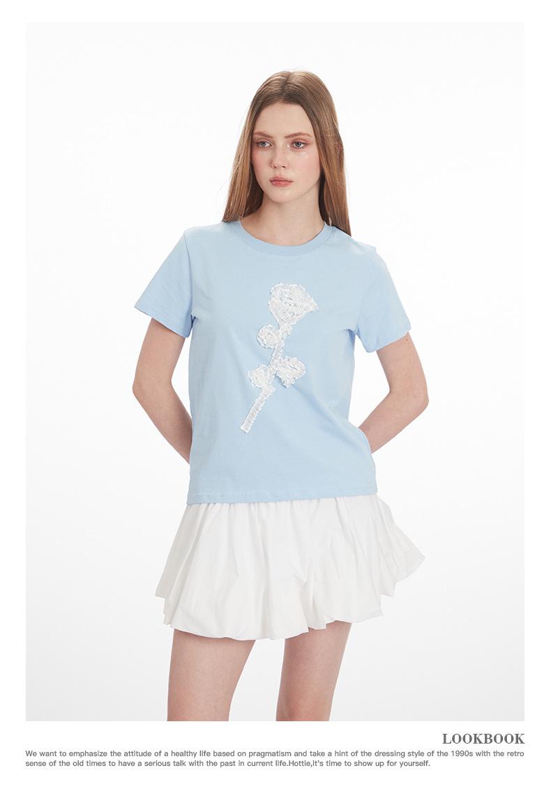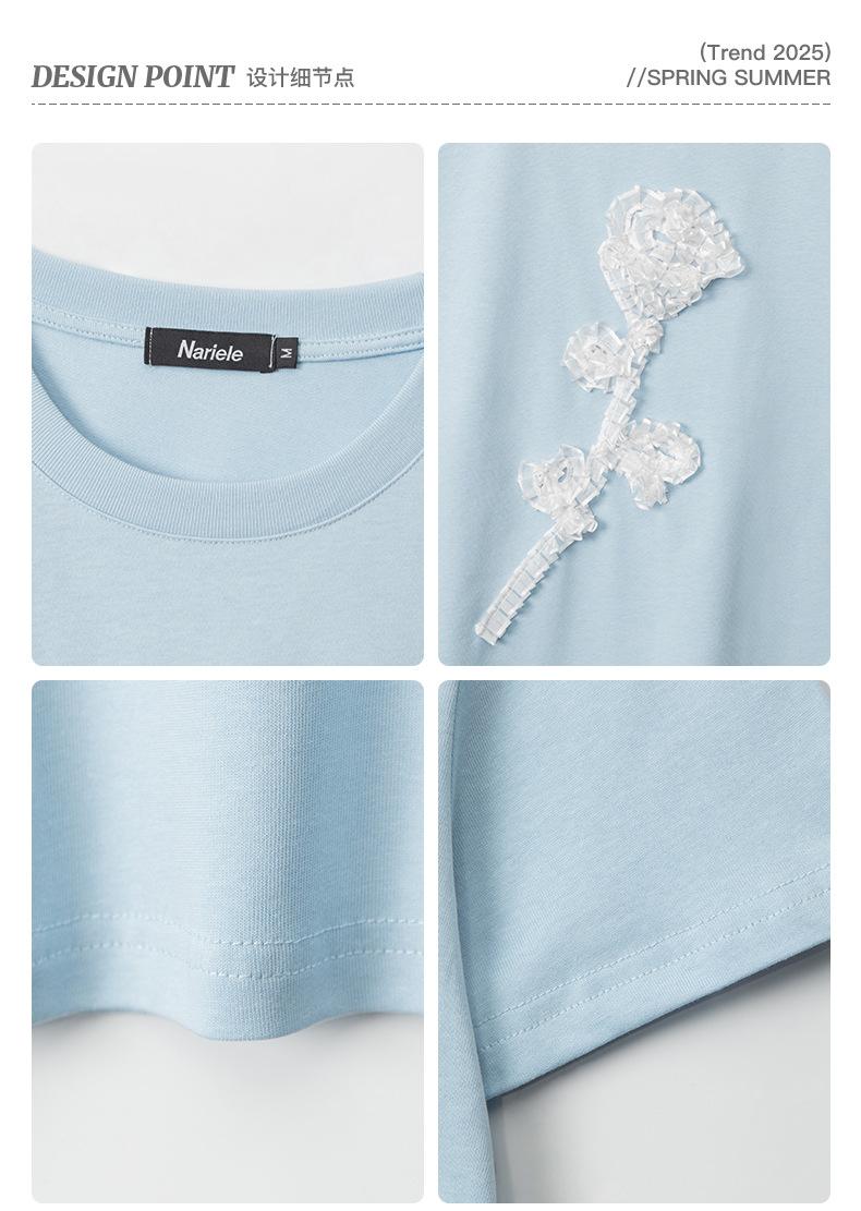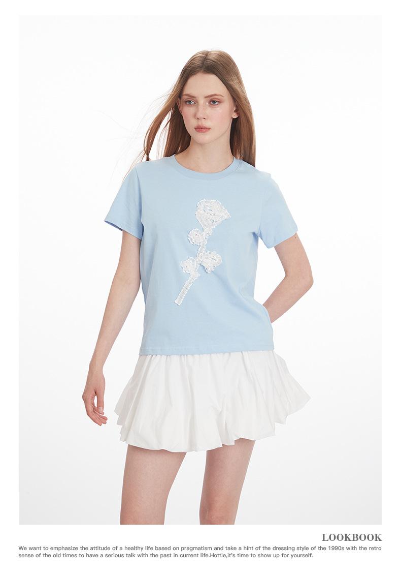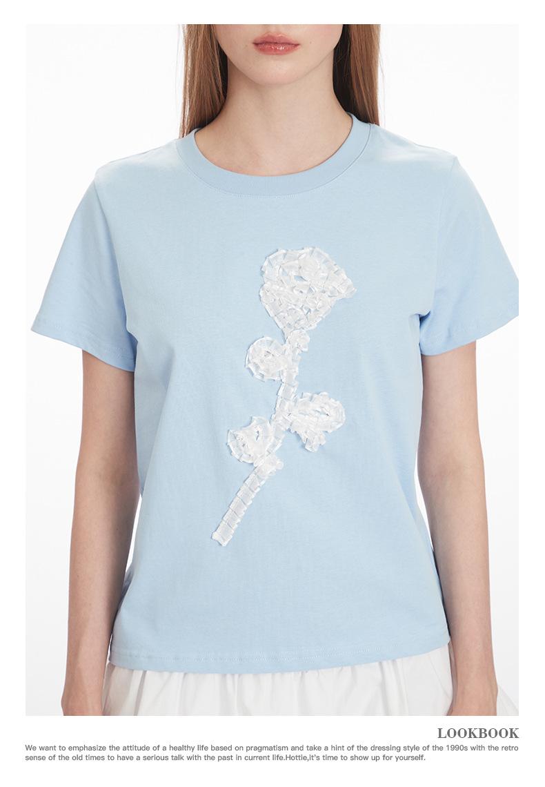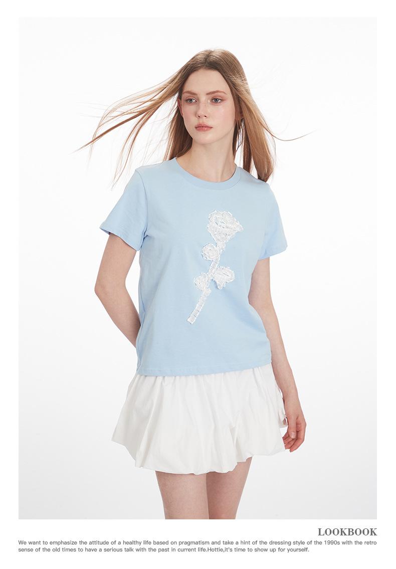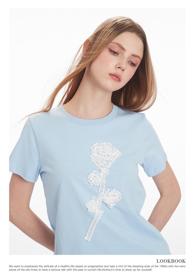 HeyHenry 2025 Camiseta Retrô Estilo Americano de Manga Curta Feminina Algodão Puro Design de Flor na Mão Roupa de Ombro para o Verão