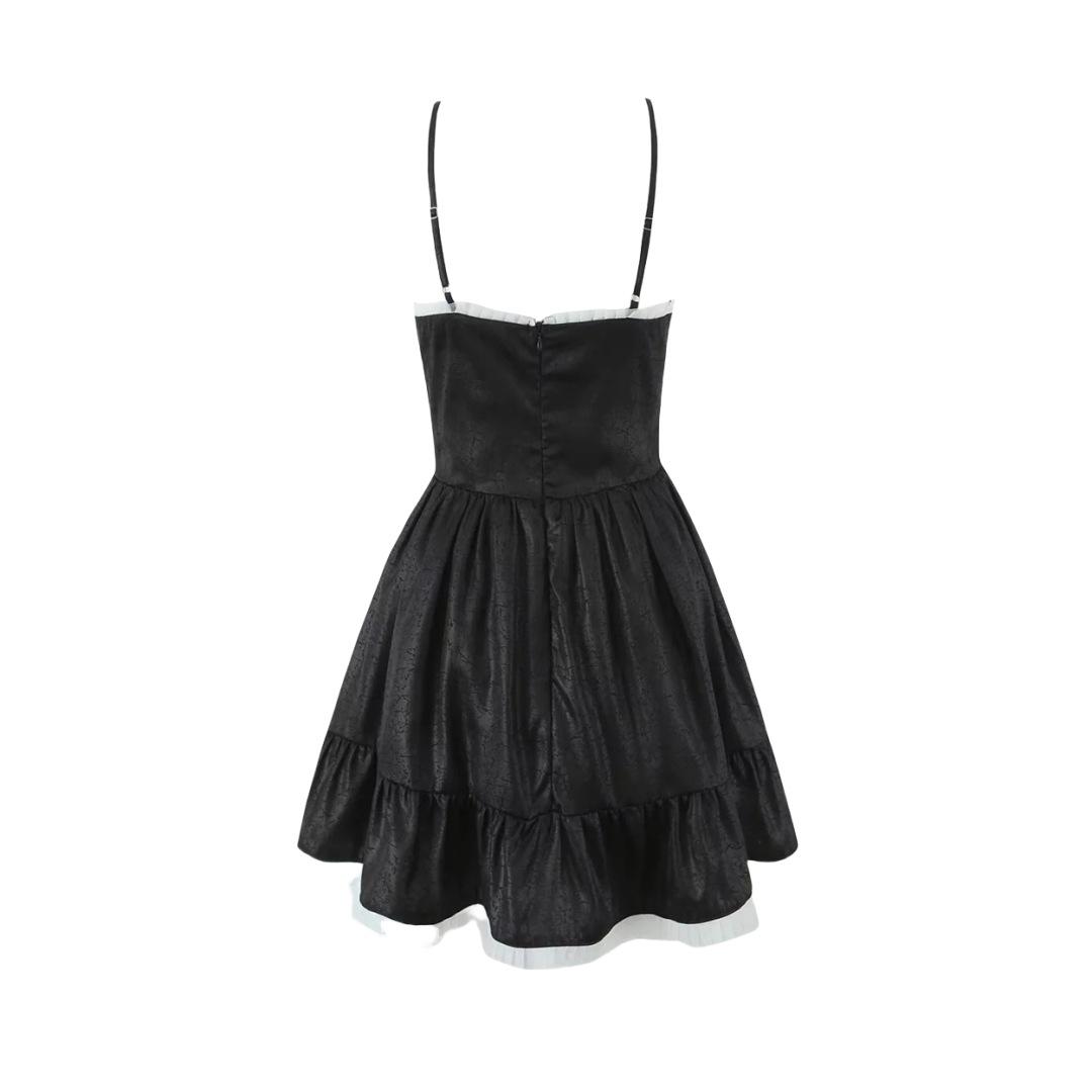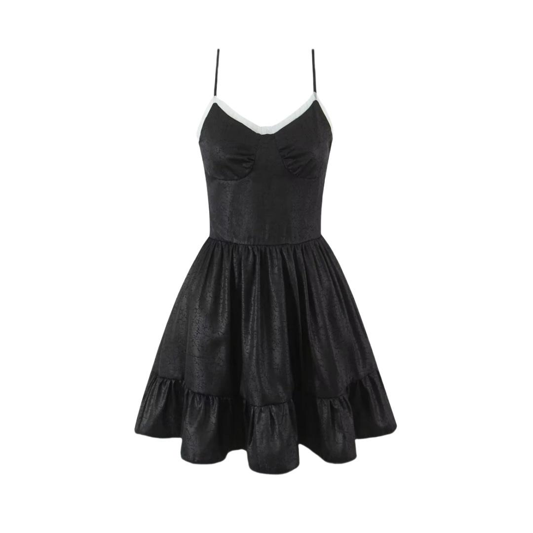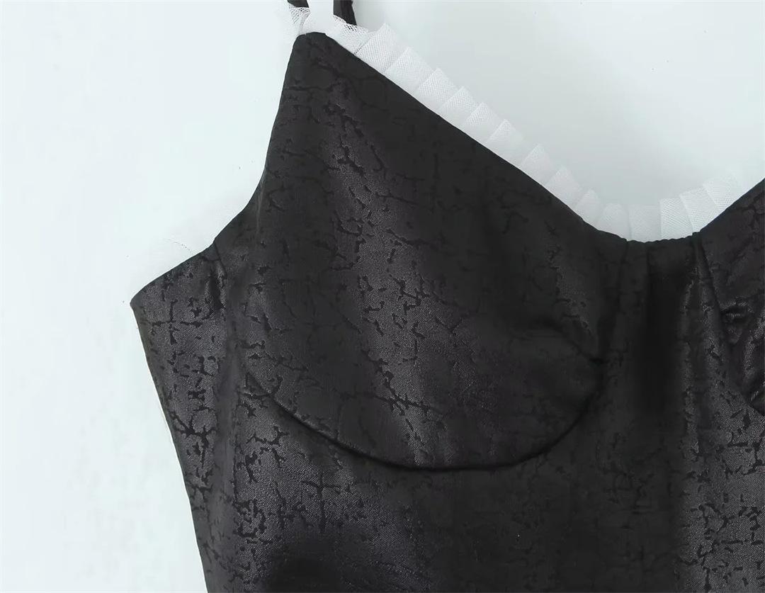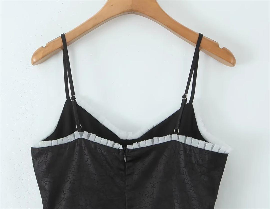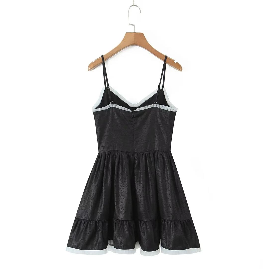 Vestido Francês Decote V Renda Contrastante Alças Finas, Feminino Cintura Justa Babados Saia Tutu Princesa