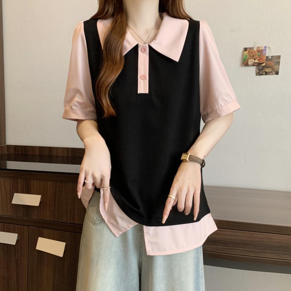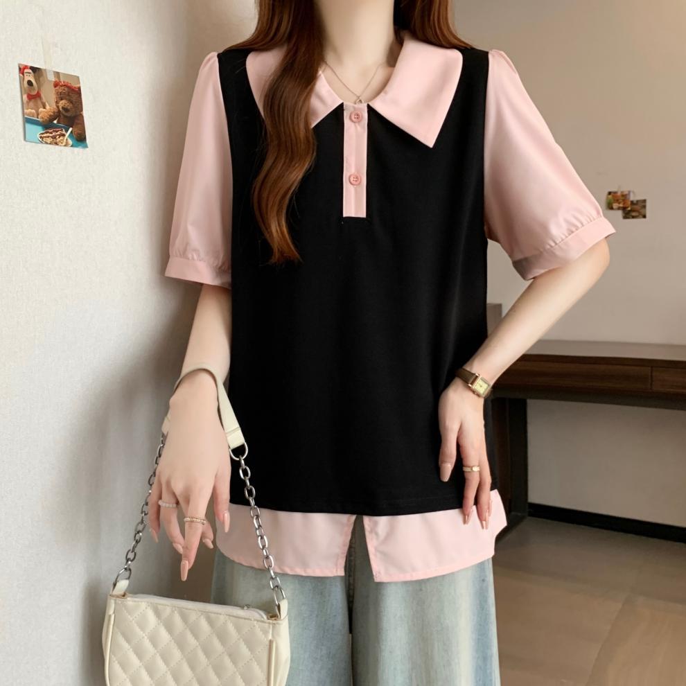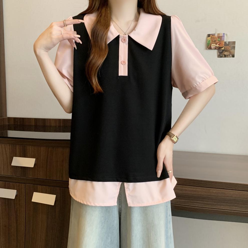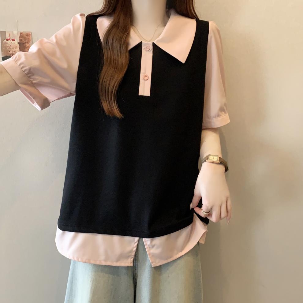 Tamanho plus Costura Falsa de Duas Peças Camisa Elegante menina gordinha Verão Novo Solto Emagrecimento Fino Doce Redutor de Idade Top Feminino