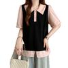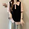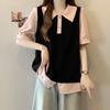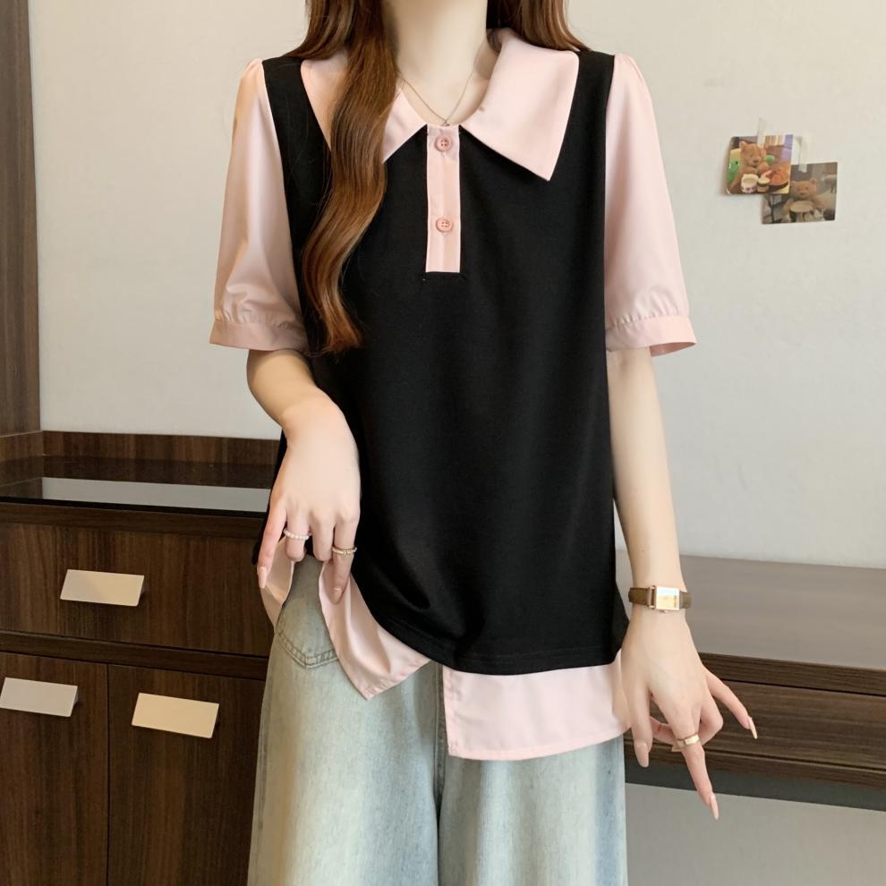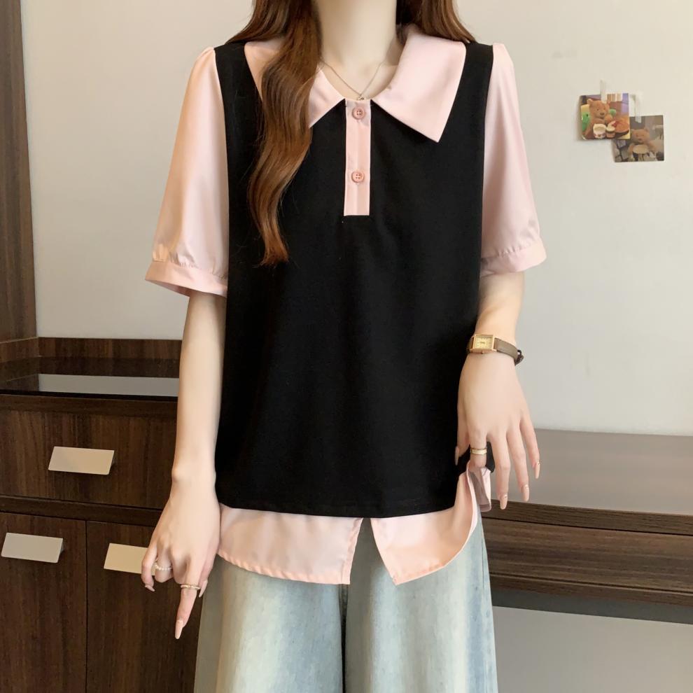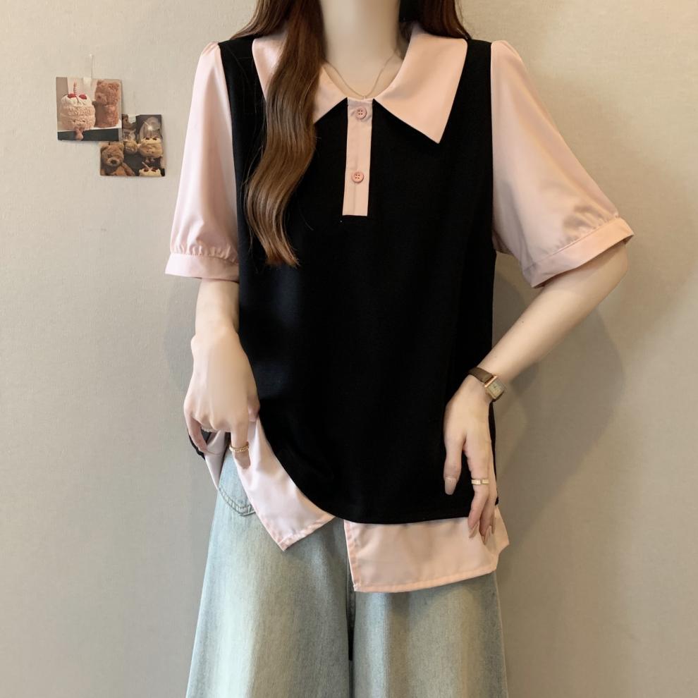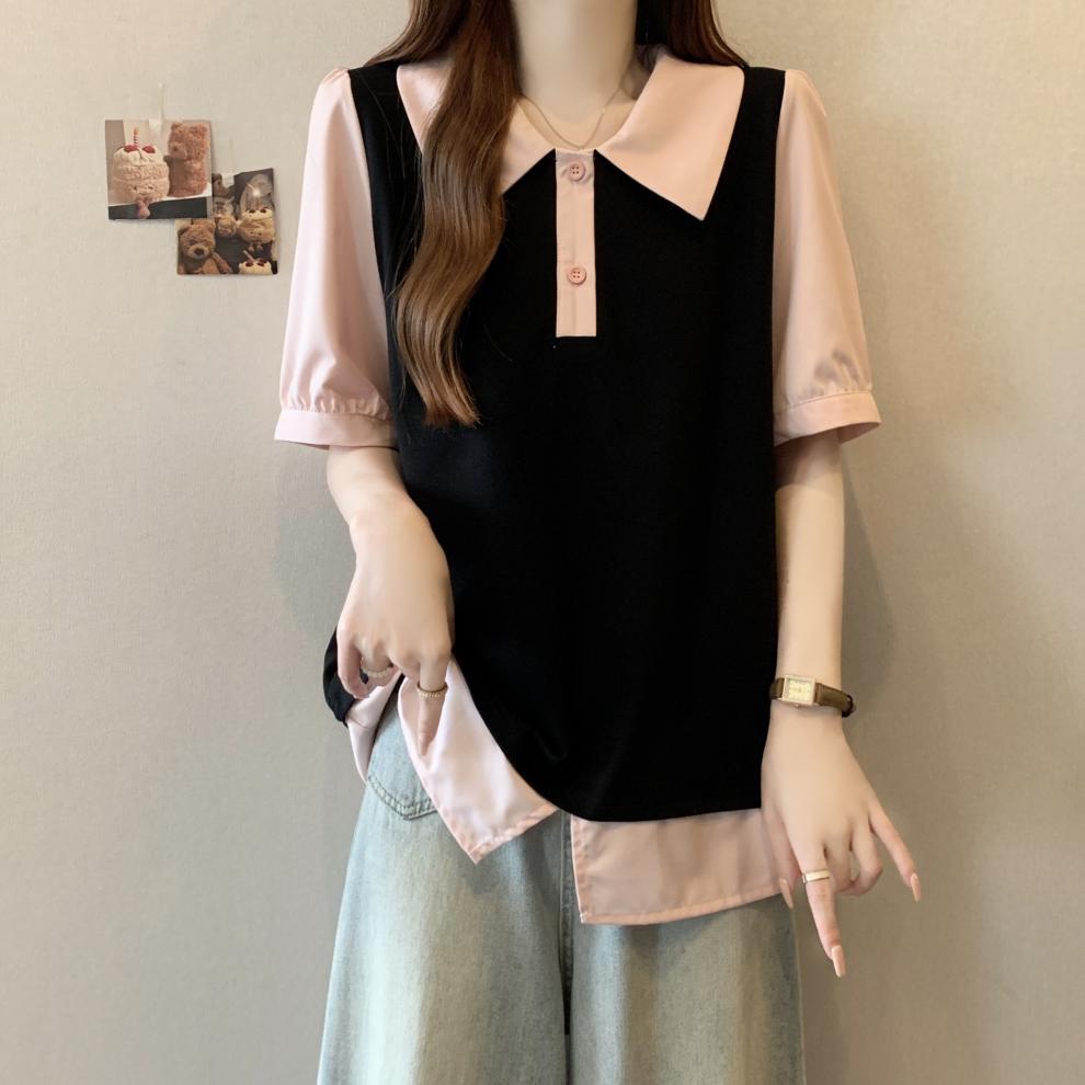 Tamanho plus Costura Falsa de Duas Peças Camisa Elegante menina gordinha Verão Novo Solto Emagrecimento Fino Doce Redutor de Idade Top Feminino