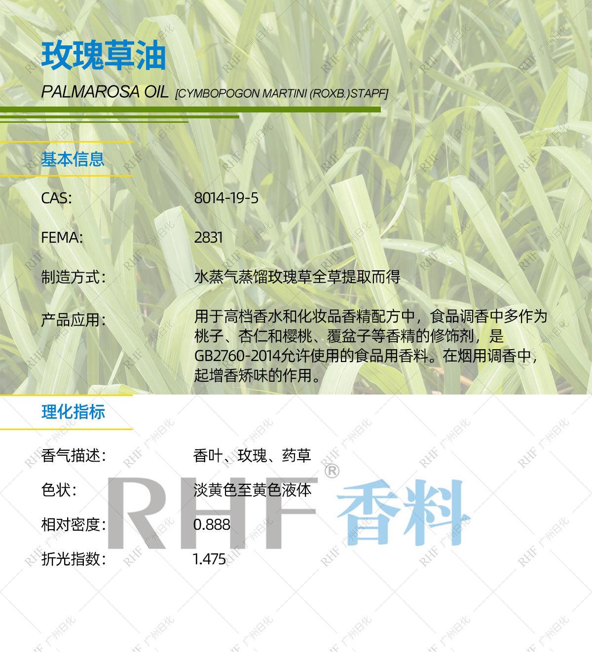 1. Óleo de palmarosaÉ um aromatizante alimentar permitido para uso de acordo com o padrão alimentar nacional GB2760-2014.