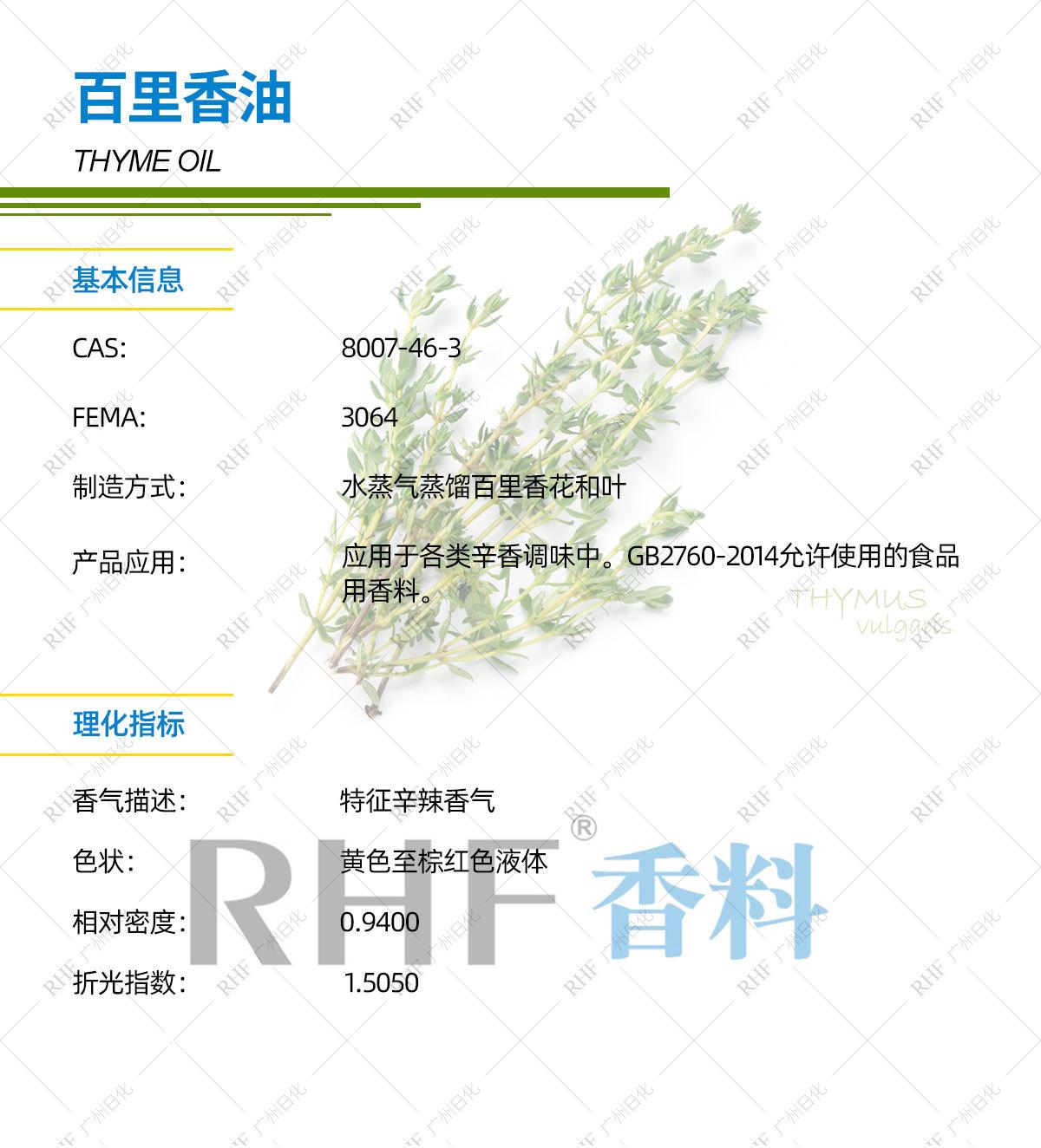 2. Óleo de tomilho podeUsado para aromatizar bebidas, doces, produtos aquáticos, carnes, sopas, bebidas, queijo, molhos, batatas fritas e pós para tempero;