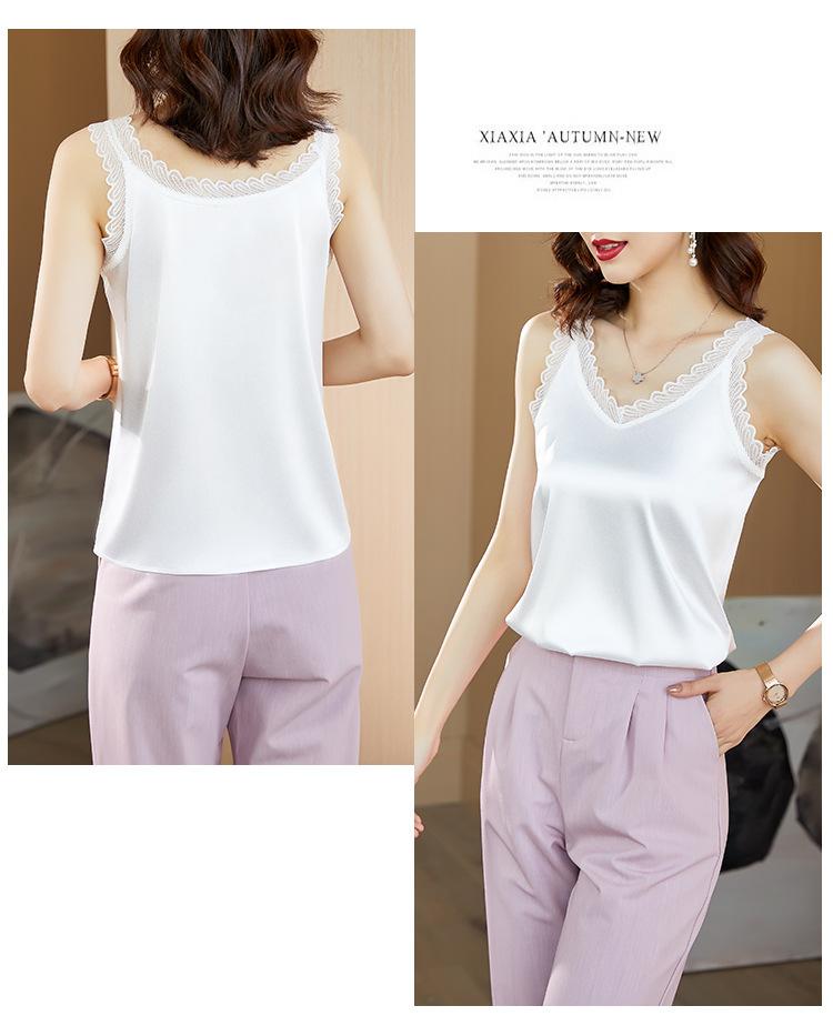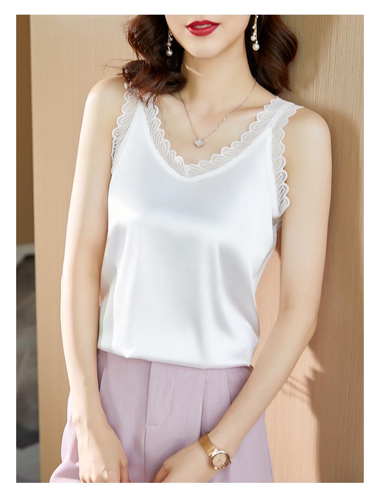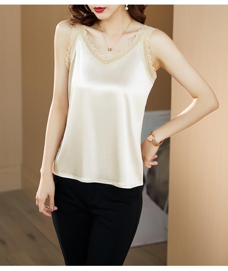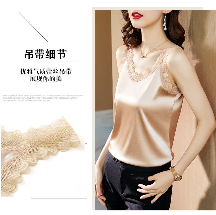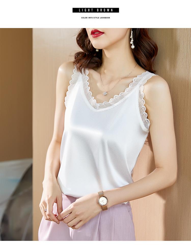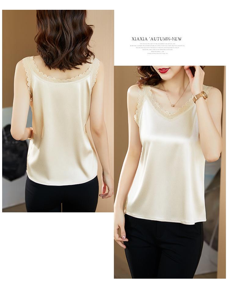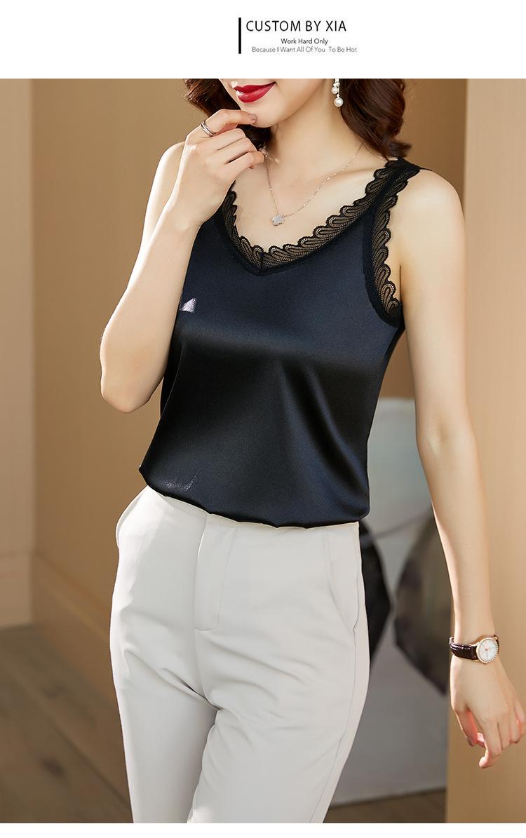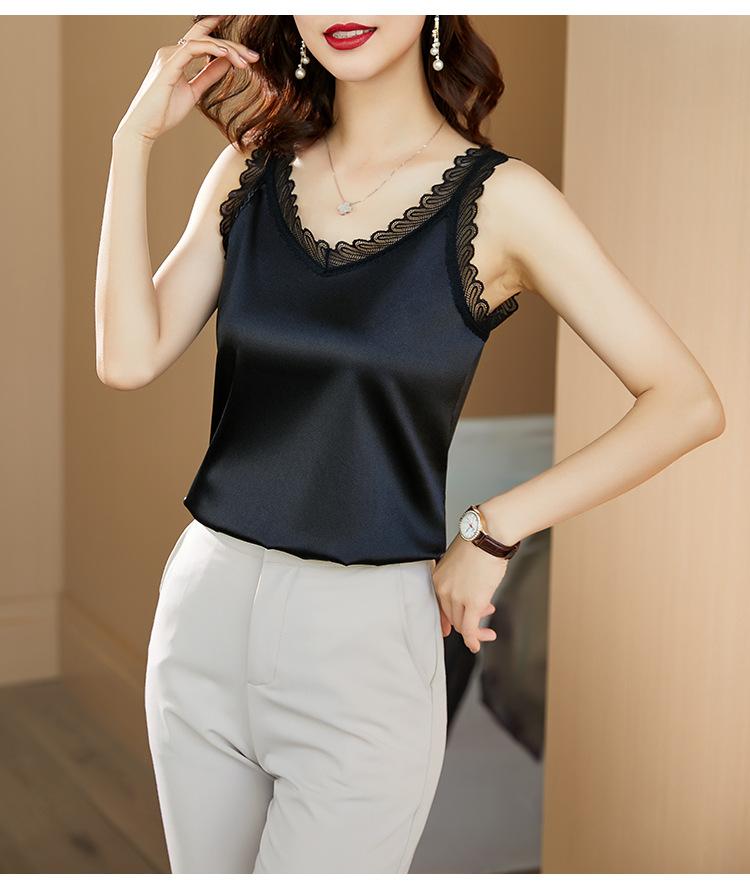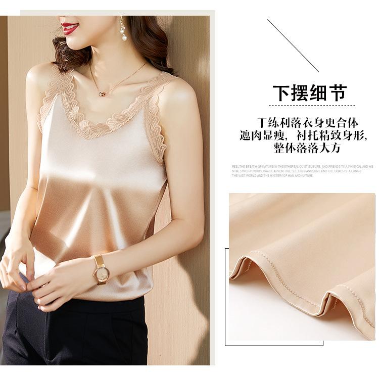 Camisola Feminina de Cetim de Seda Gelo da Mamãe com Lindas Costas Abertas Top de Verão de Seda Roupa Íntima Camiseta Básica de Renda Fashion