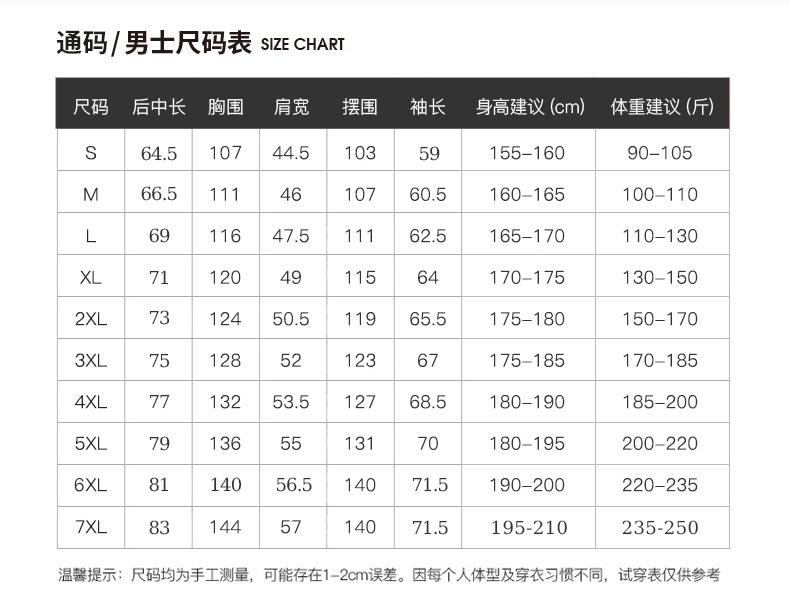 S, M, L, XL, 2XL, 3XL, 4XL, 5XL, 6XL, 7XL