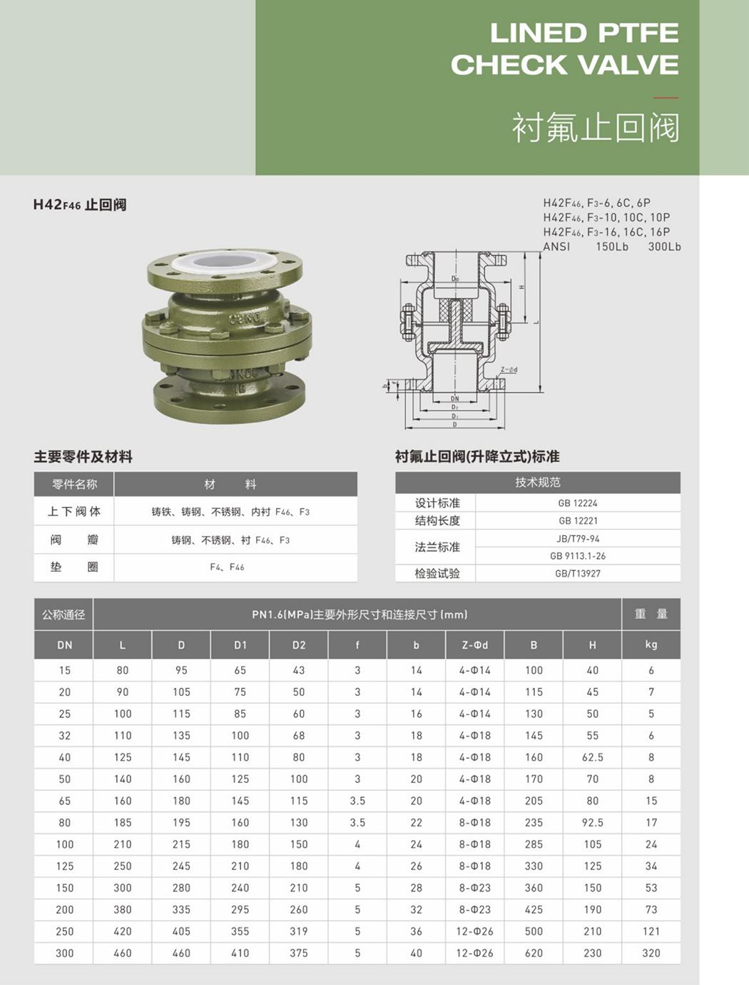 Válvula de retenção vertical com flange H42F46-16C revestida com flúor resistente à corrosão, a ácidos e álcalis, válvula de retenção unidirecional revestida com PTFE