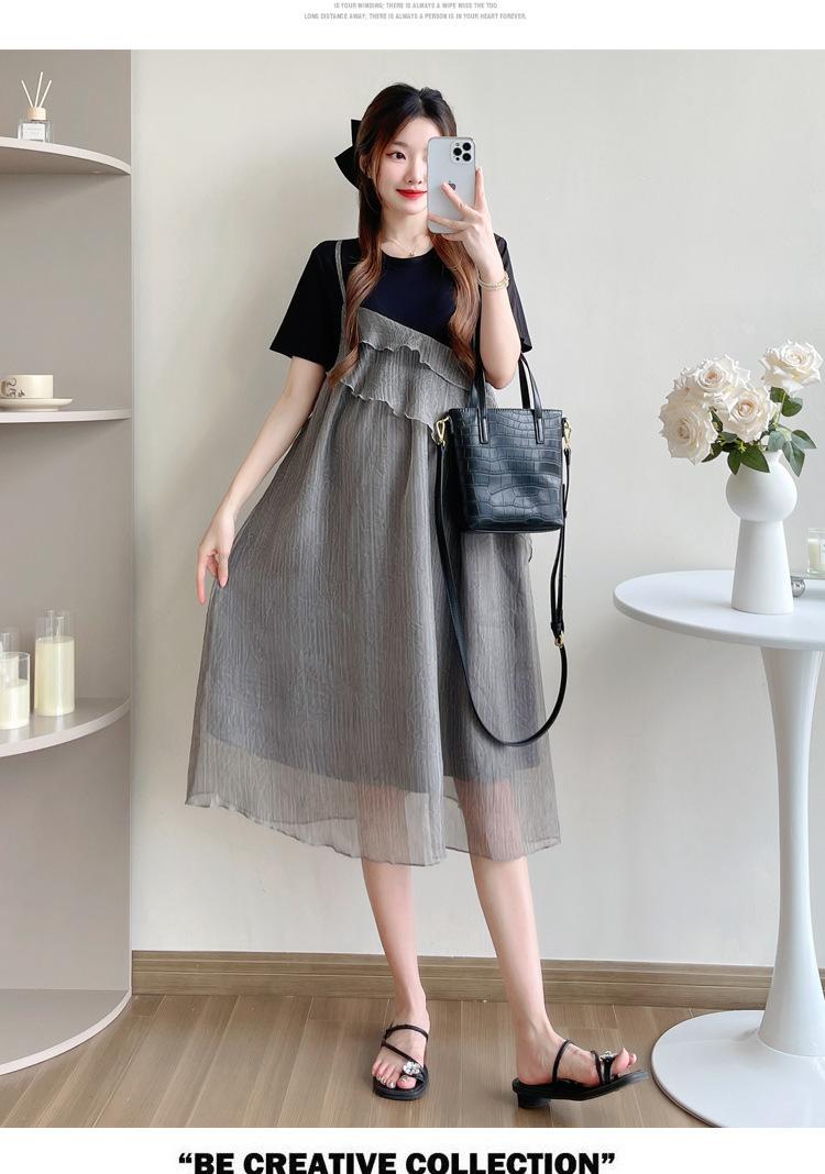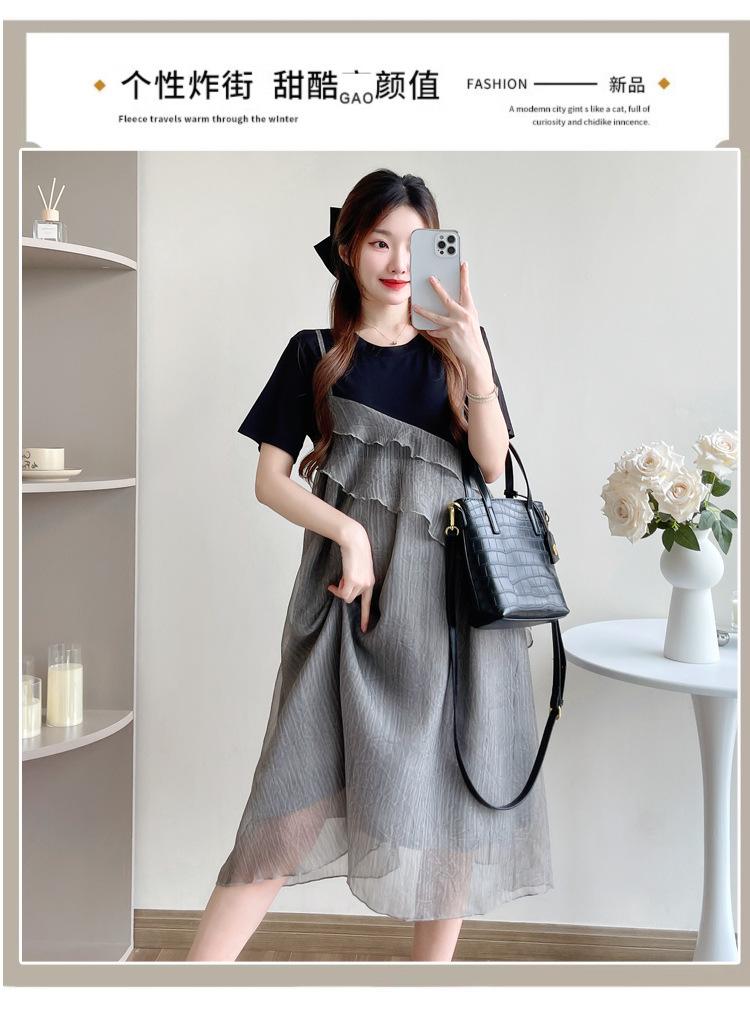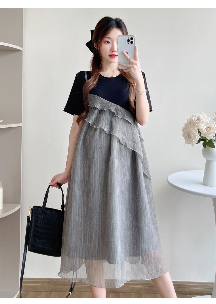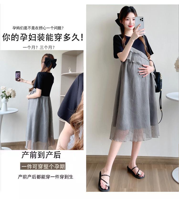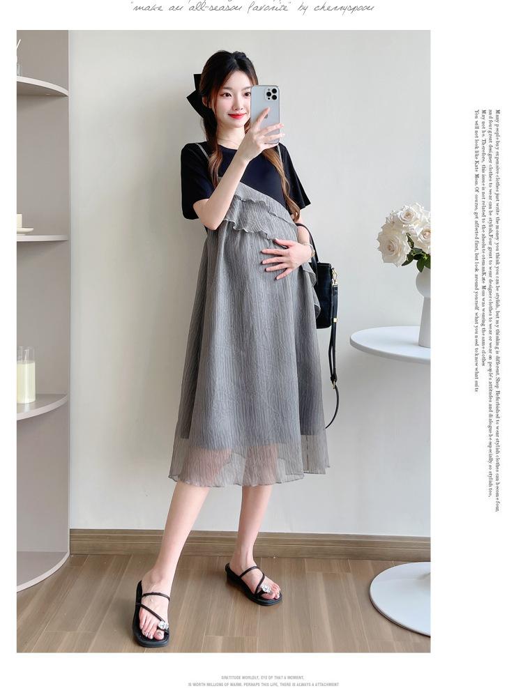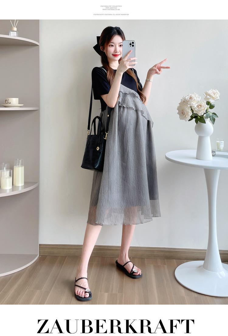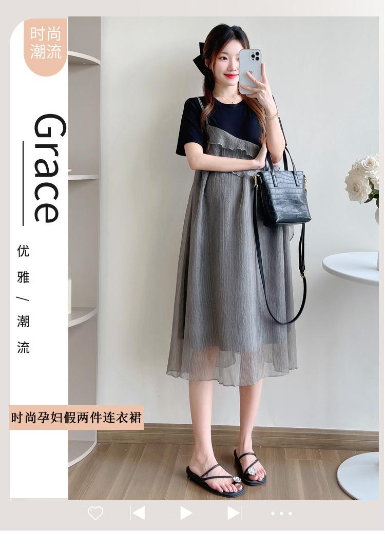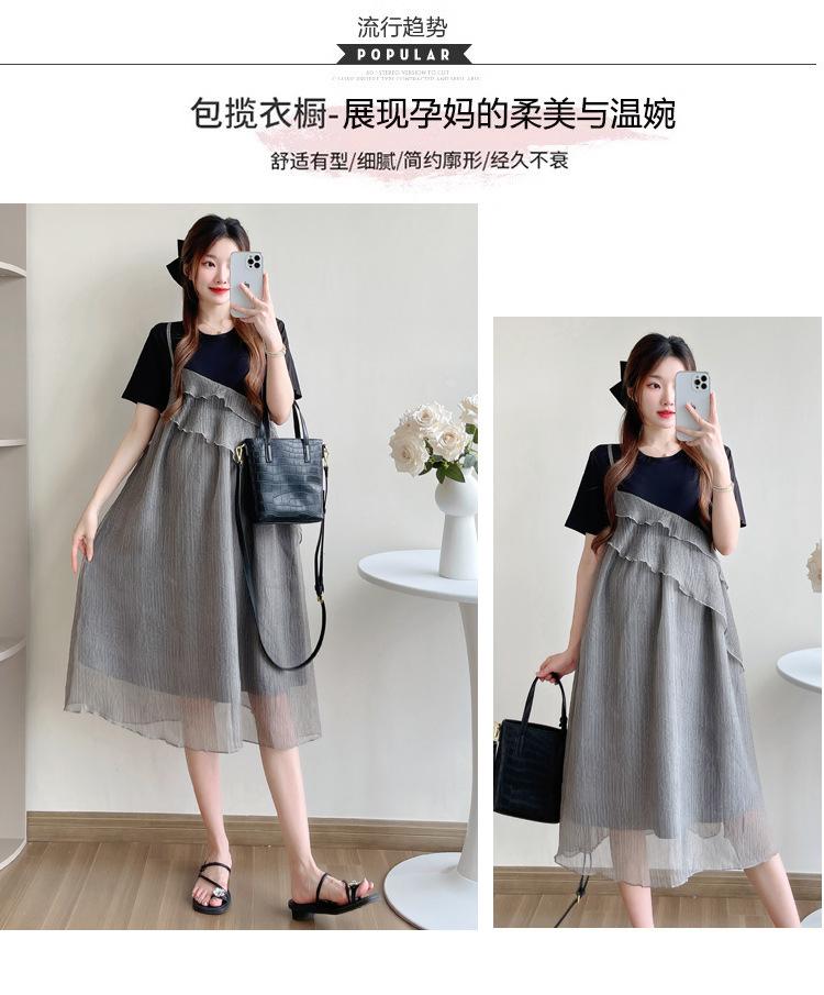 Roupa de Maternidade 2025 Verão Nova Moda Look Emagrecedor Falso Duas Peças Spliced a Versão Solta Tamanho Grande Vestido de Maternidade