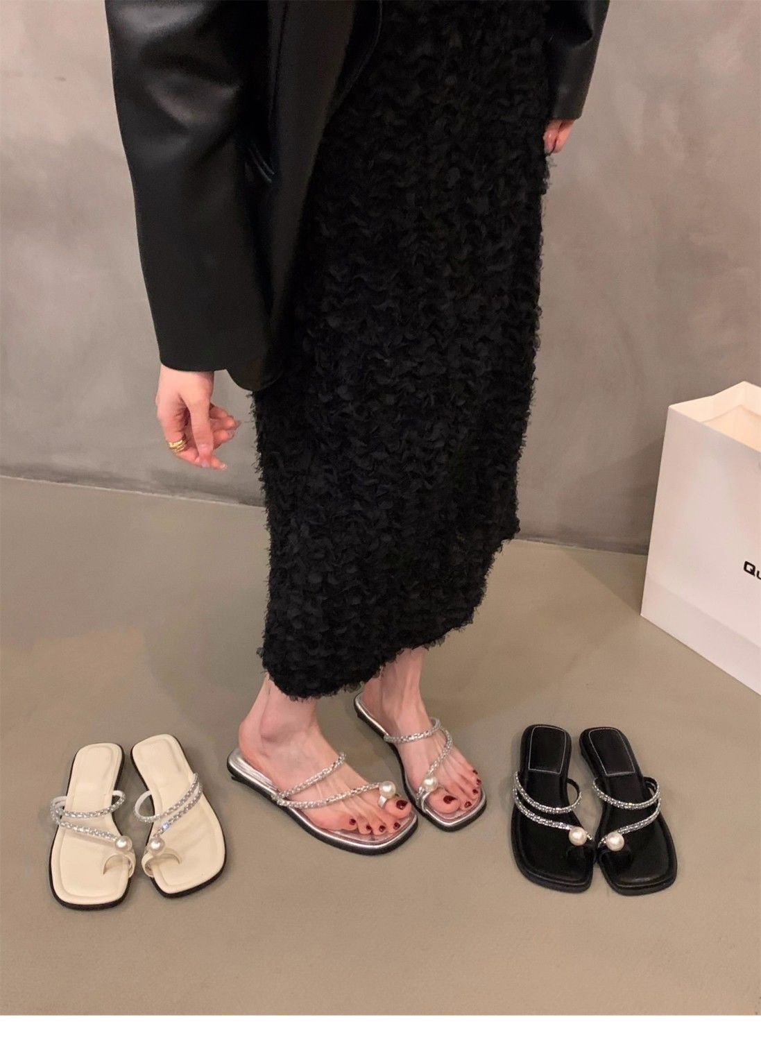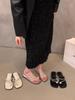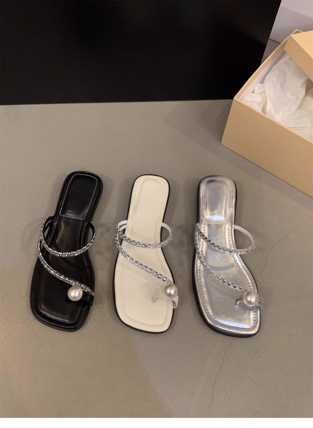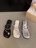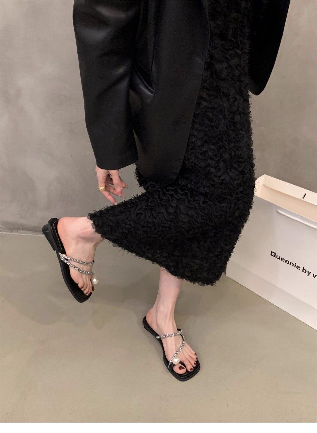 2024 Novo Estilo Francês Elegante Chinelos de Strass Femininos Verão Uso Externo Estilo Fada Dedo do Pé Exposto Sandálias de Uso Externo