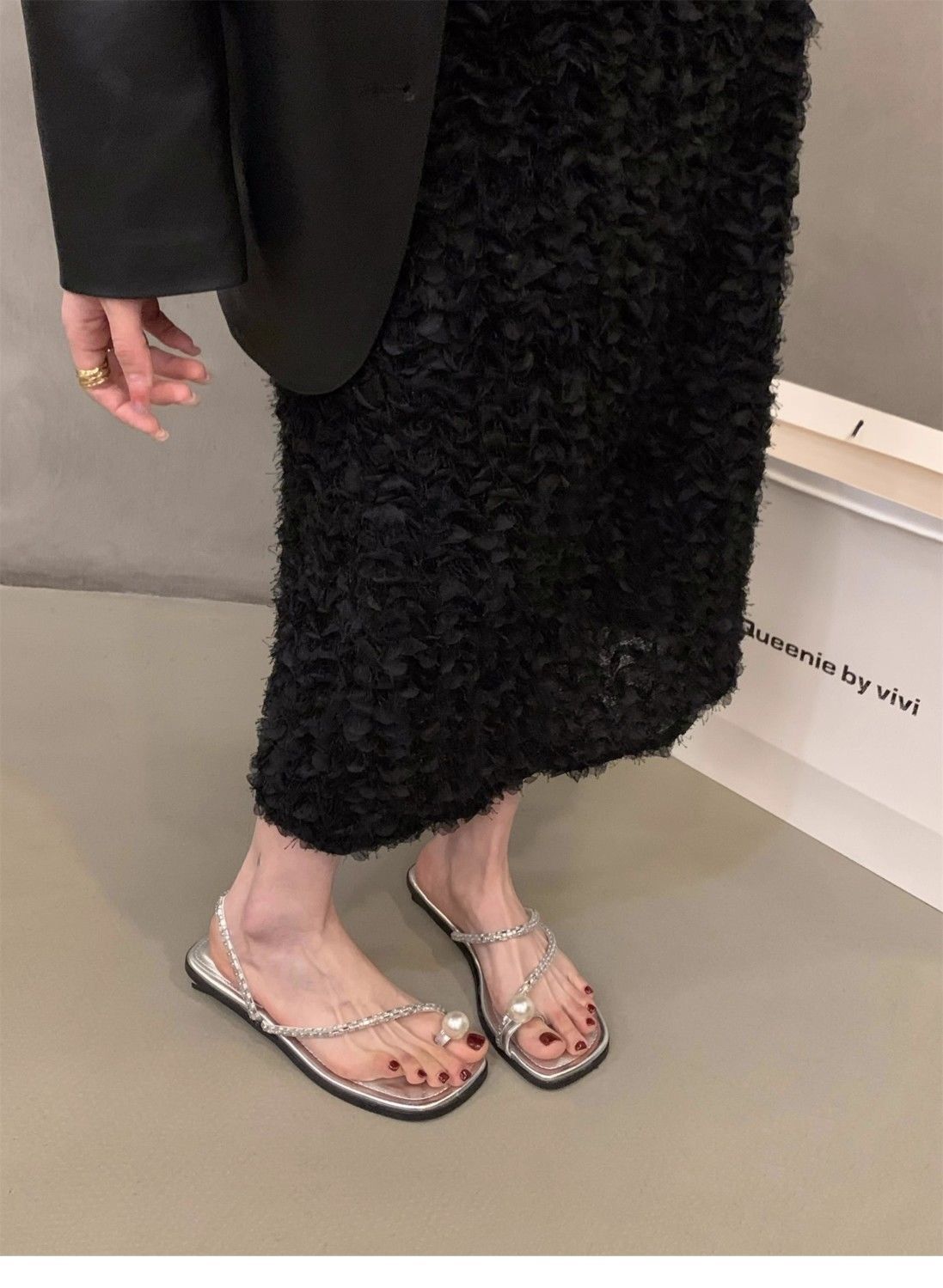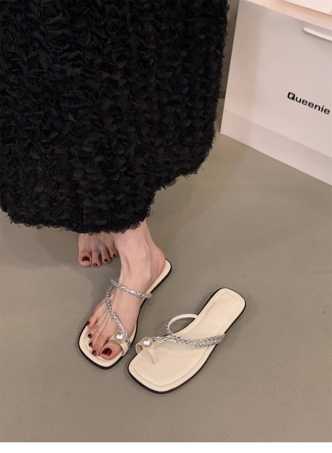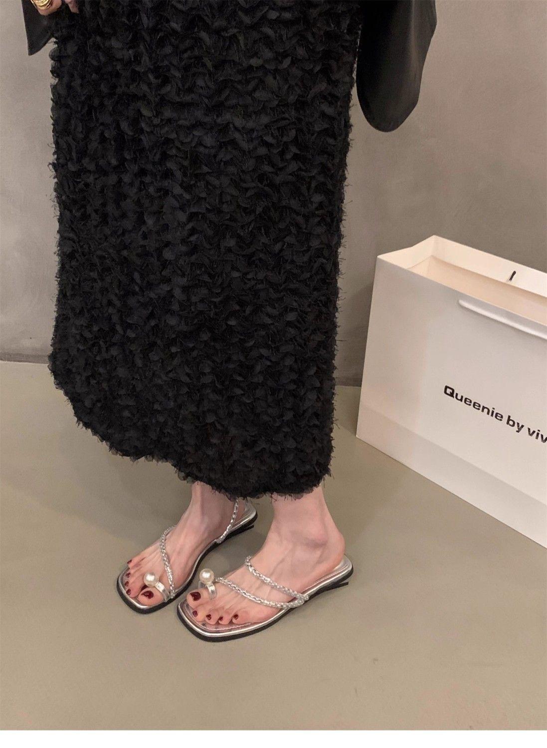 2024 Novo Estilo Francês Elegante Chinelos de Strass Femininos Verão Uso Externo Estilo Fada Dedo do Pé Exposto Sandálias de Uso Externo