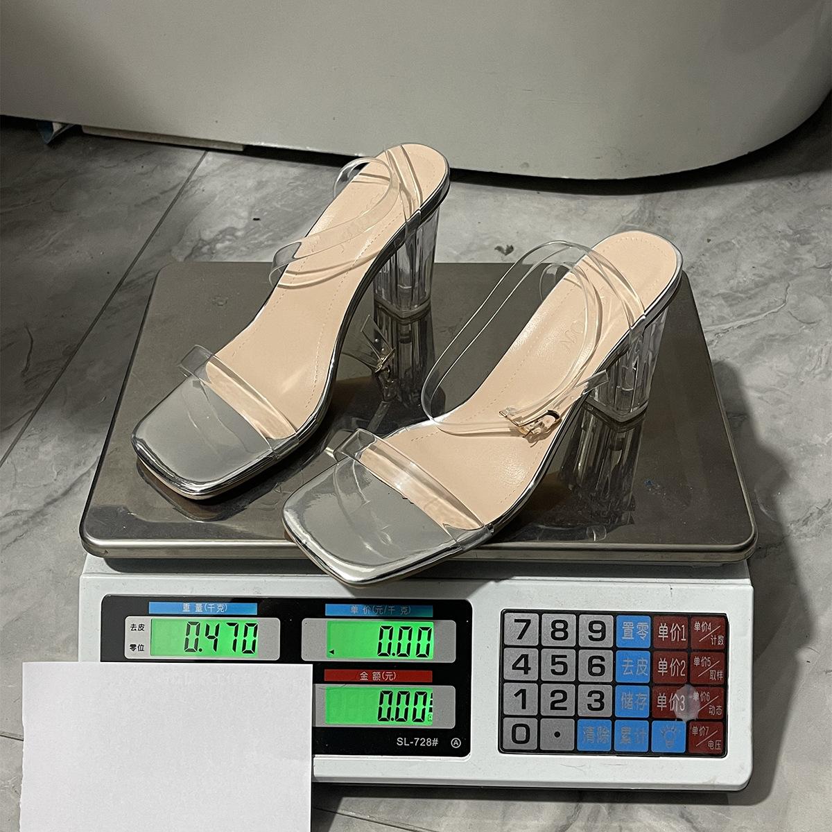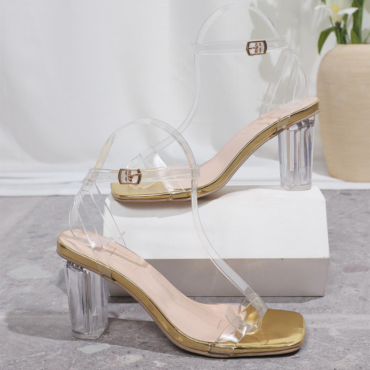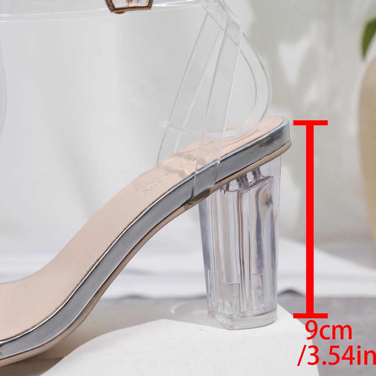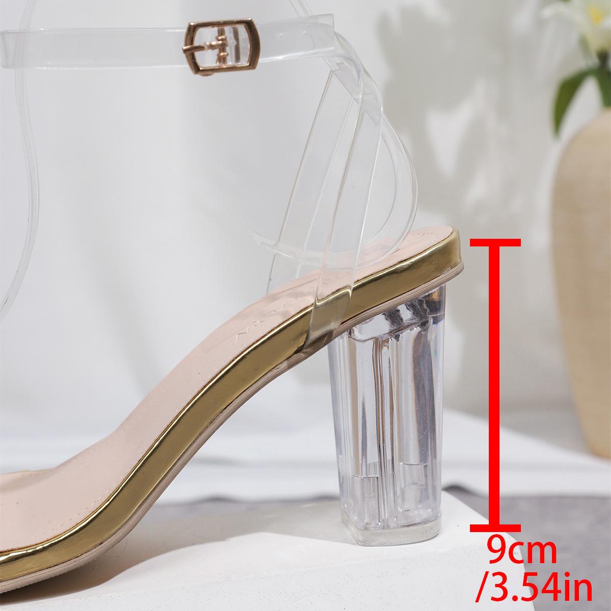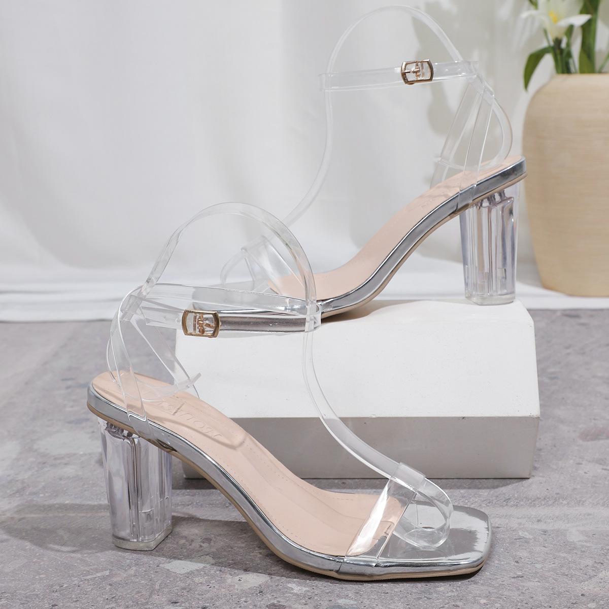 Sandálias transparentes europeias e americanas de salto alto, comércio exterior, tamanho grande, sandálias de salto grosso, moda casual, bico quadrado, fivela, sapatos de comércio exterior