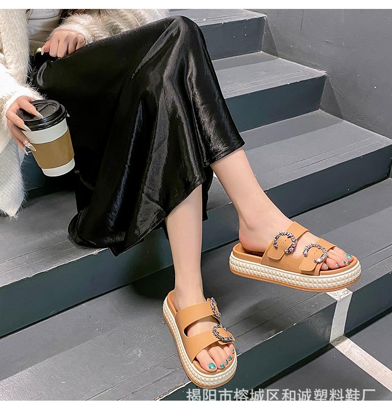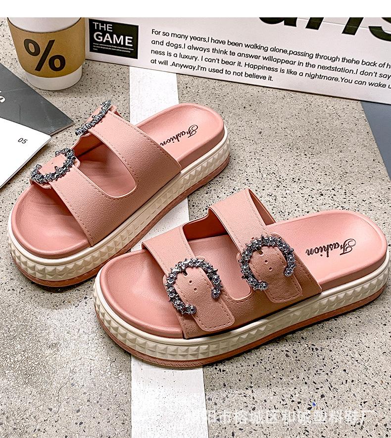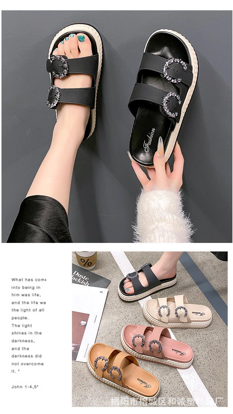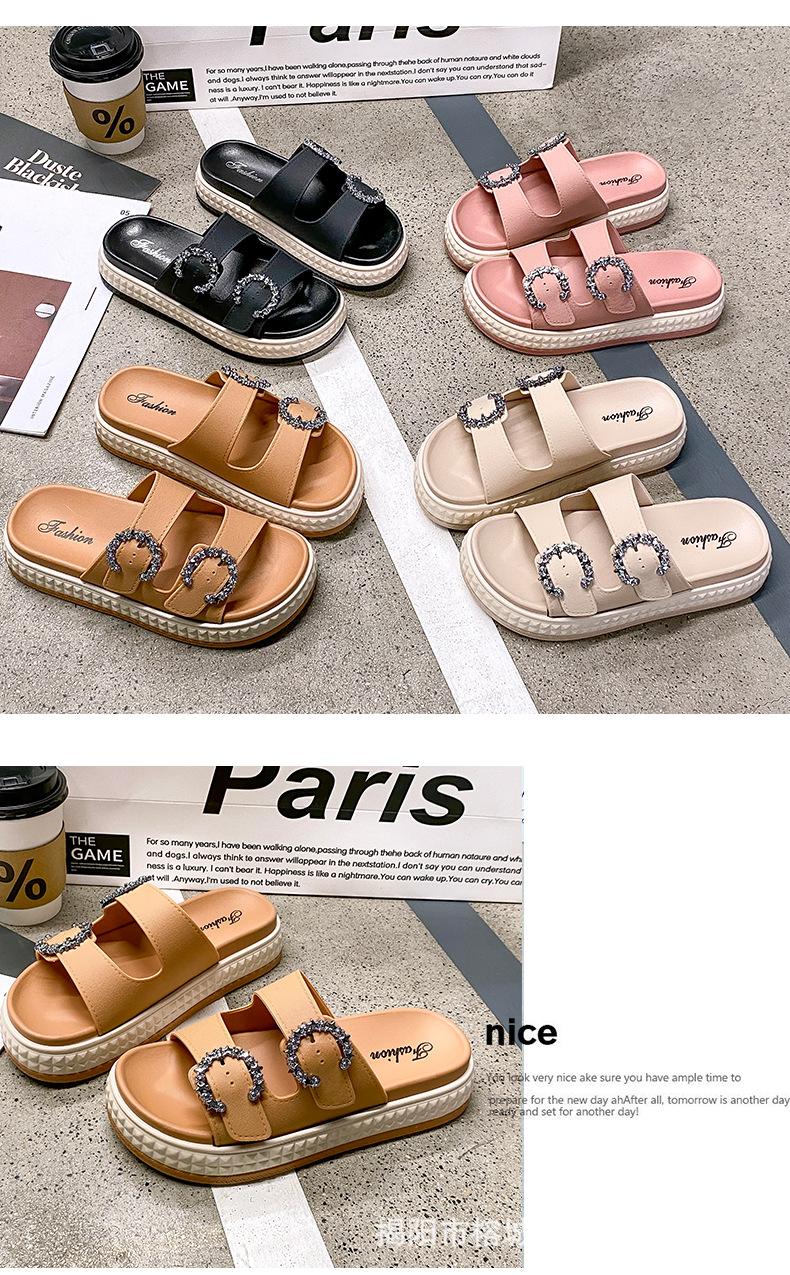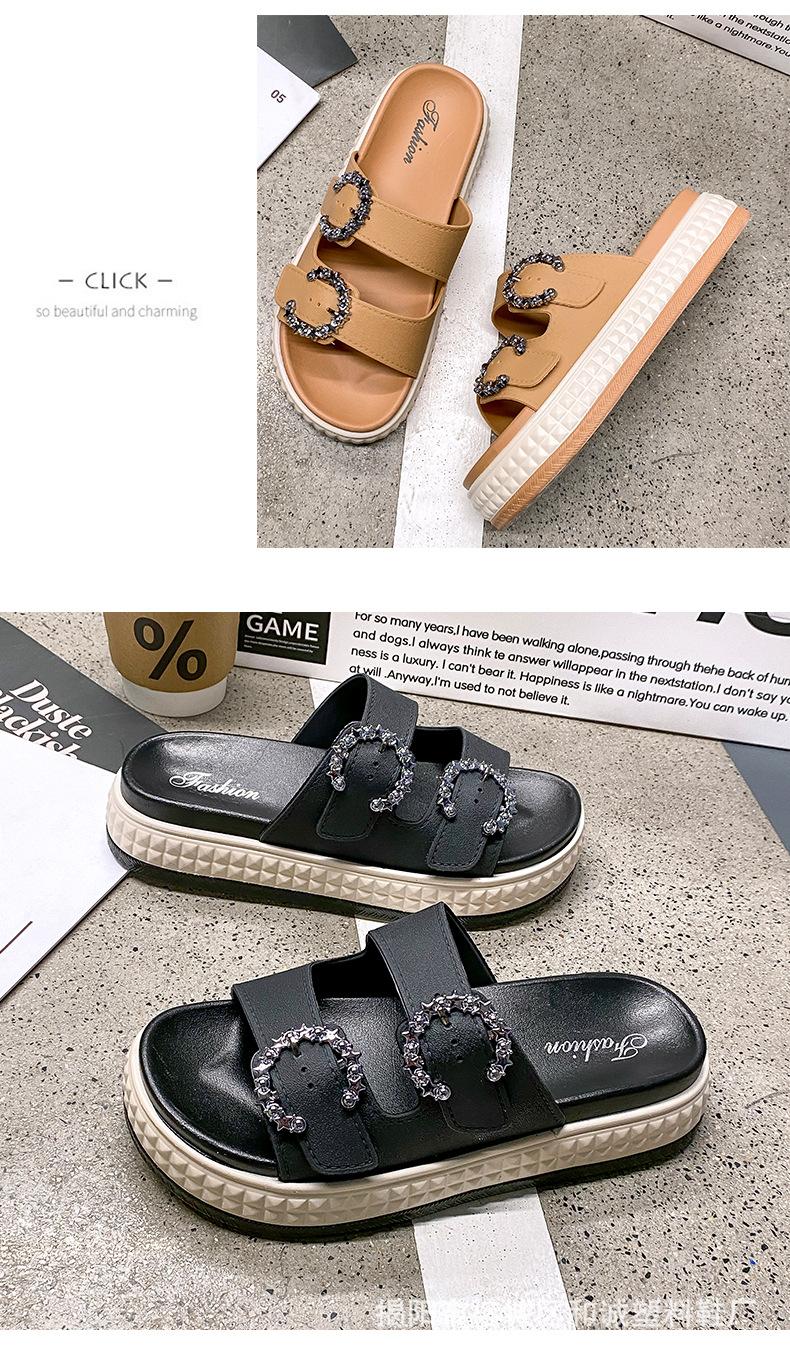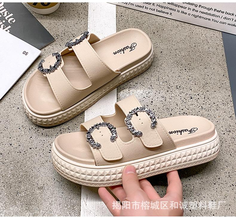 Chinelos Grossos de Verão Transfronteiriços Femininos para Uso Externo Novos Sandálias Rasteirinhas de Fivela da Moda Estilo Coreano Sandálias de Bico Redondo e Bico Aberto
