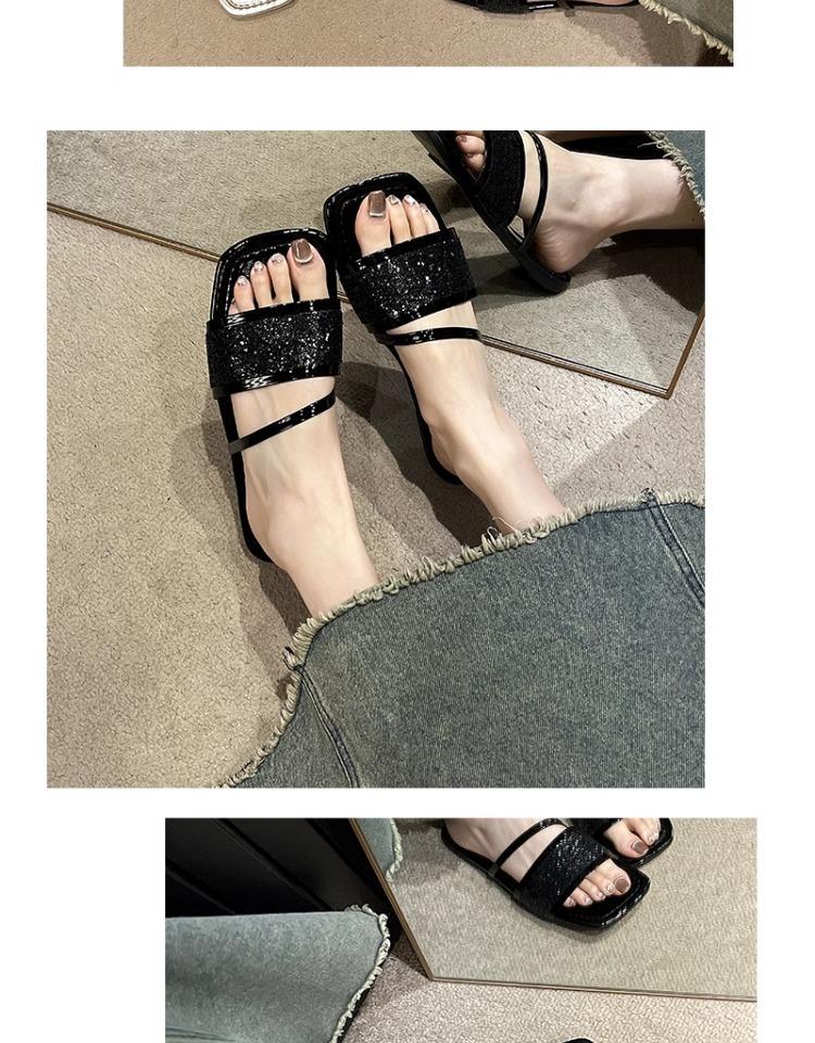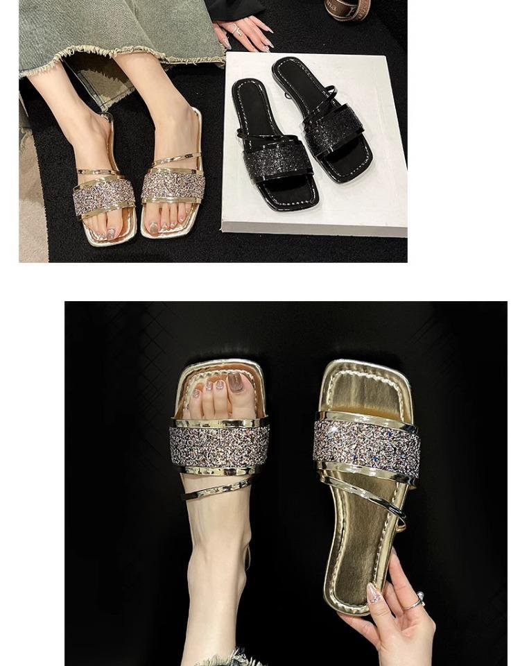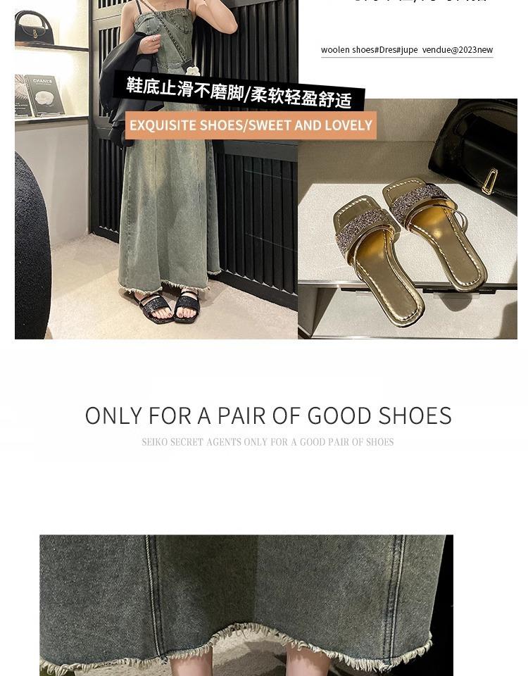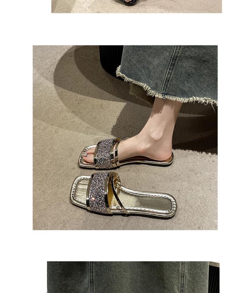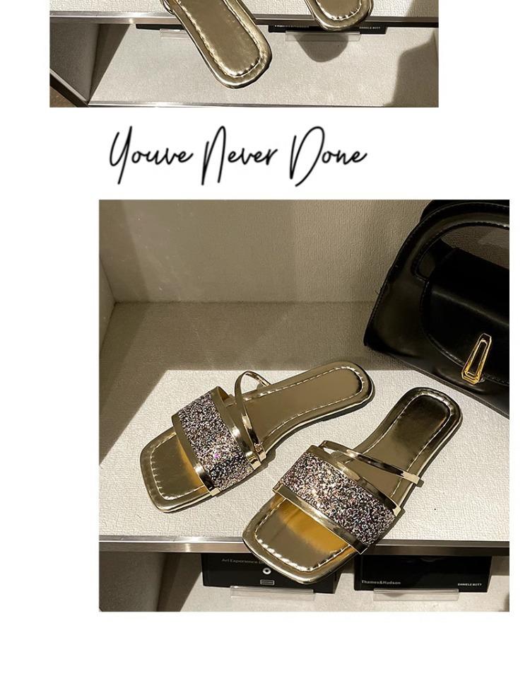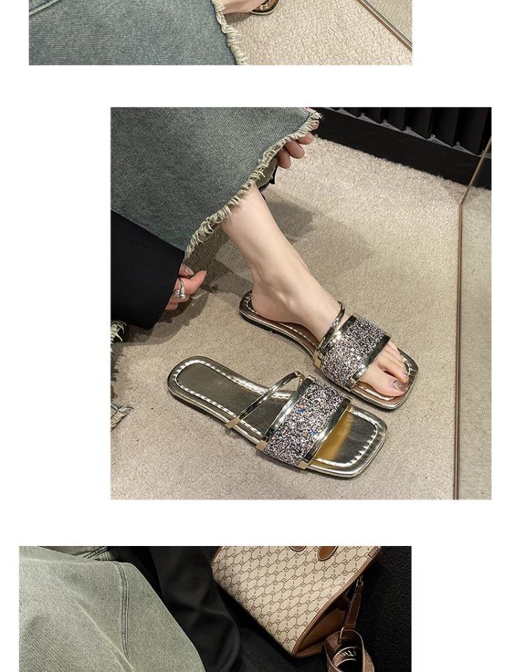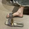 Sandálias Prateadas Novas 2024, Chinelos de Strass da Moda, Calçado de Verão Feminino para Uso Externo, Flats Bico Quadrado Elegantes