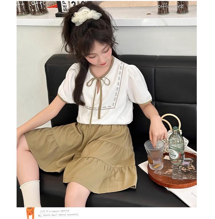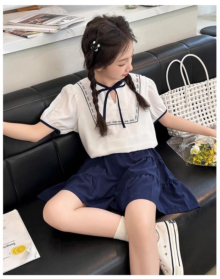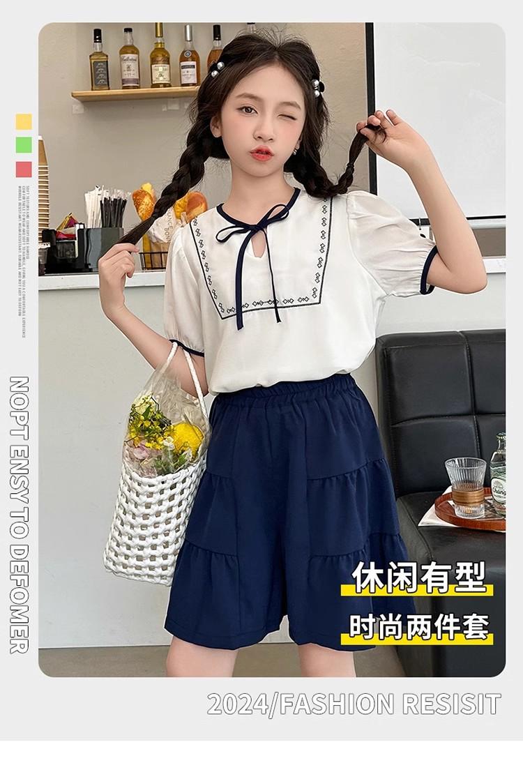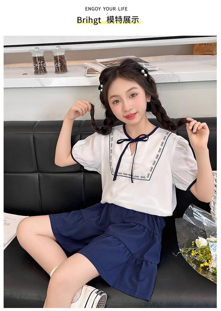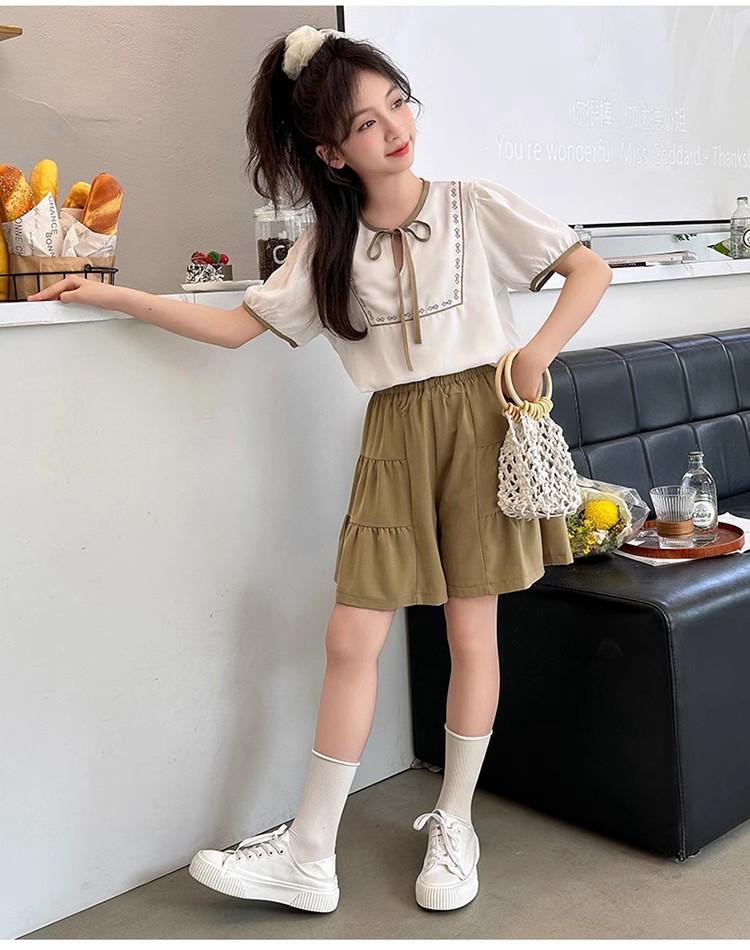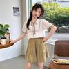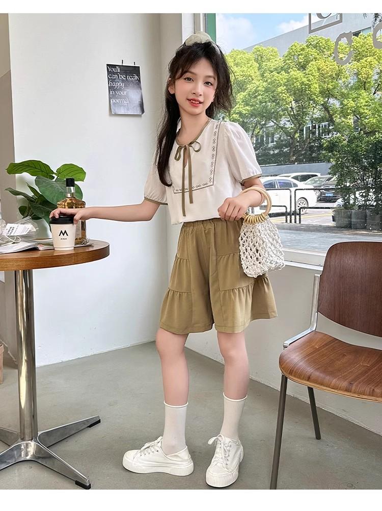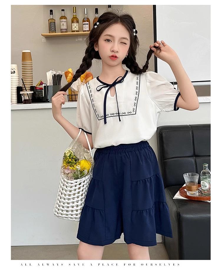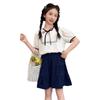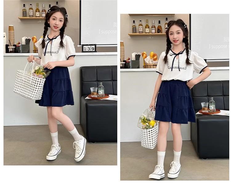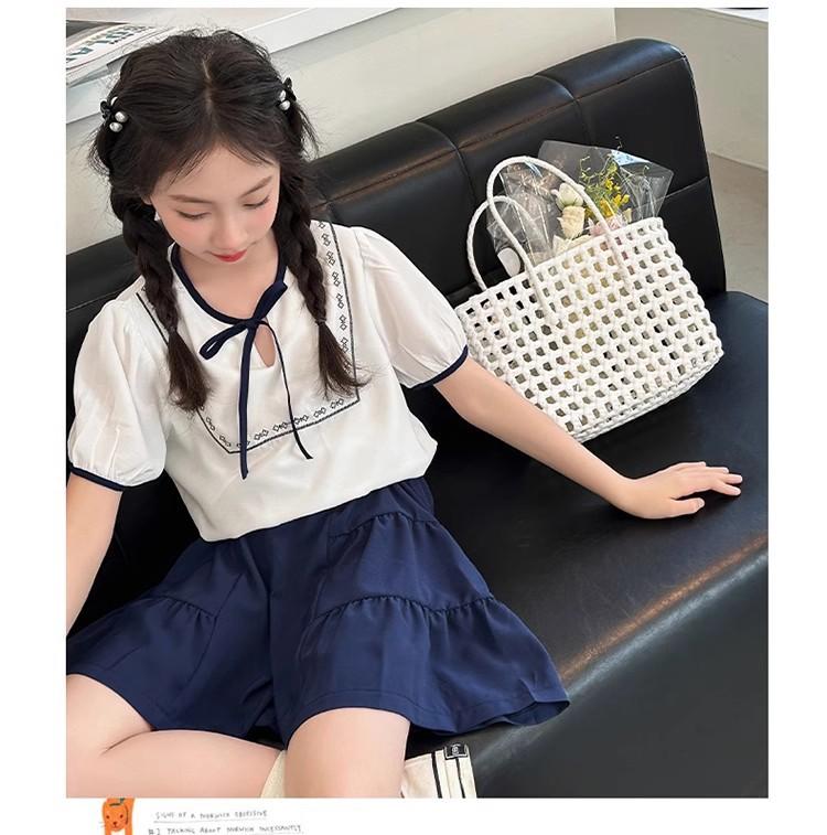 Terno Fino Estilo Faculdade para Bebês Meninas, Novo Estilo Verão Infantil, Conjunto de Duas Peças de Camisa de Bebê com Cadarço e Shorts