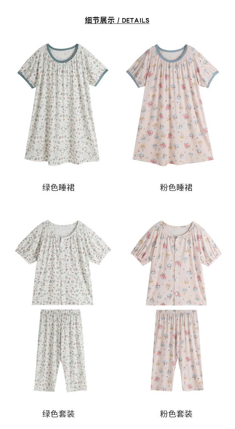 Pink nightgown, Green nightgown, Pink suit, Green suit