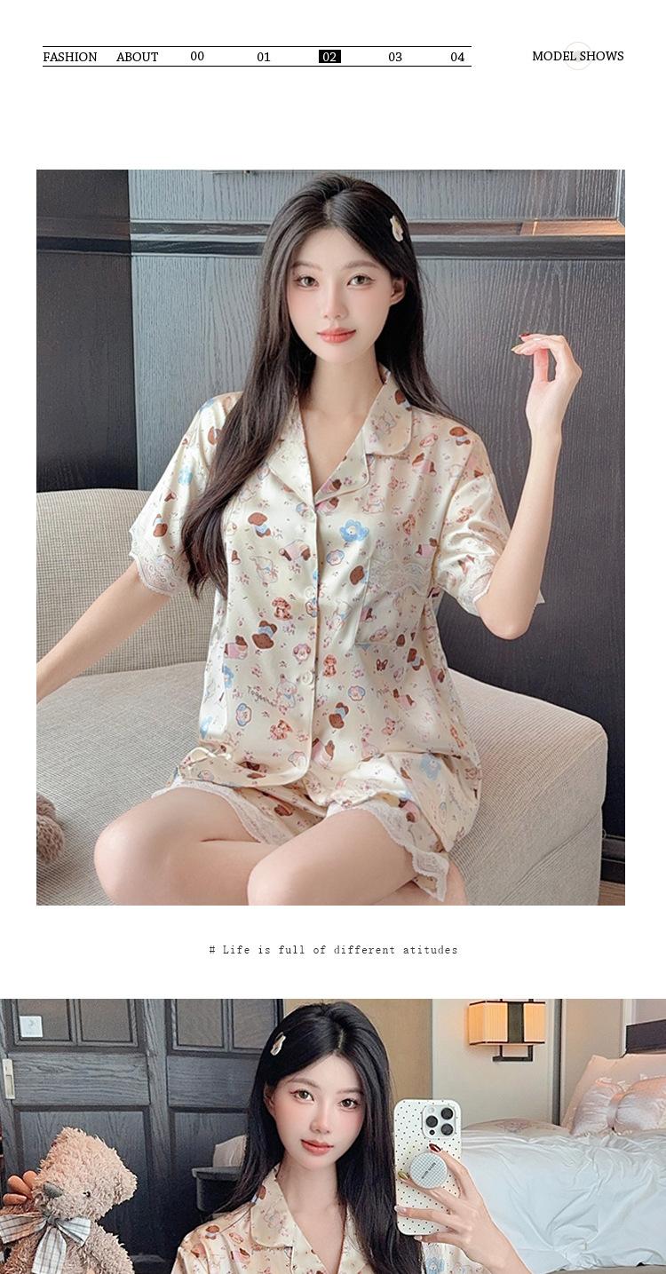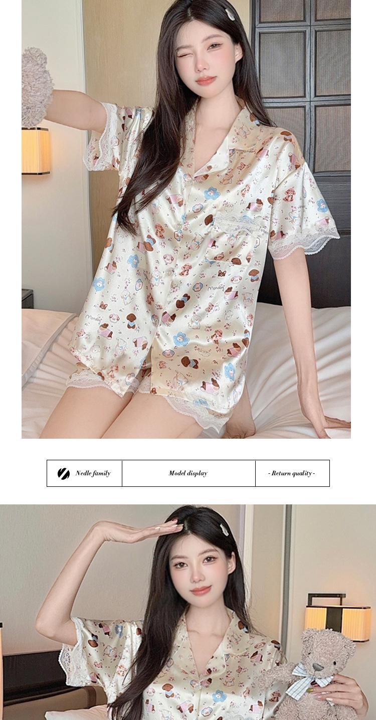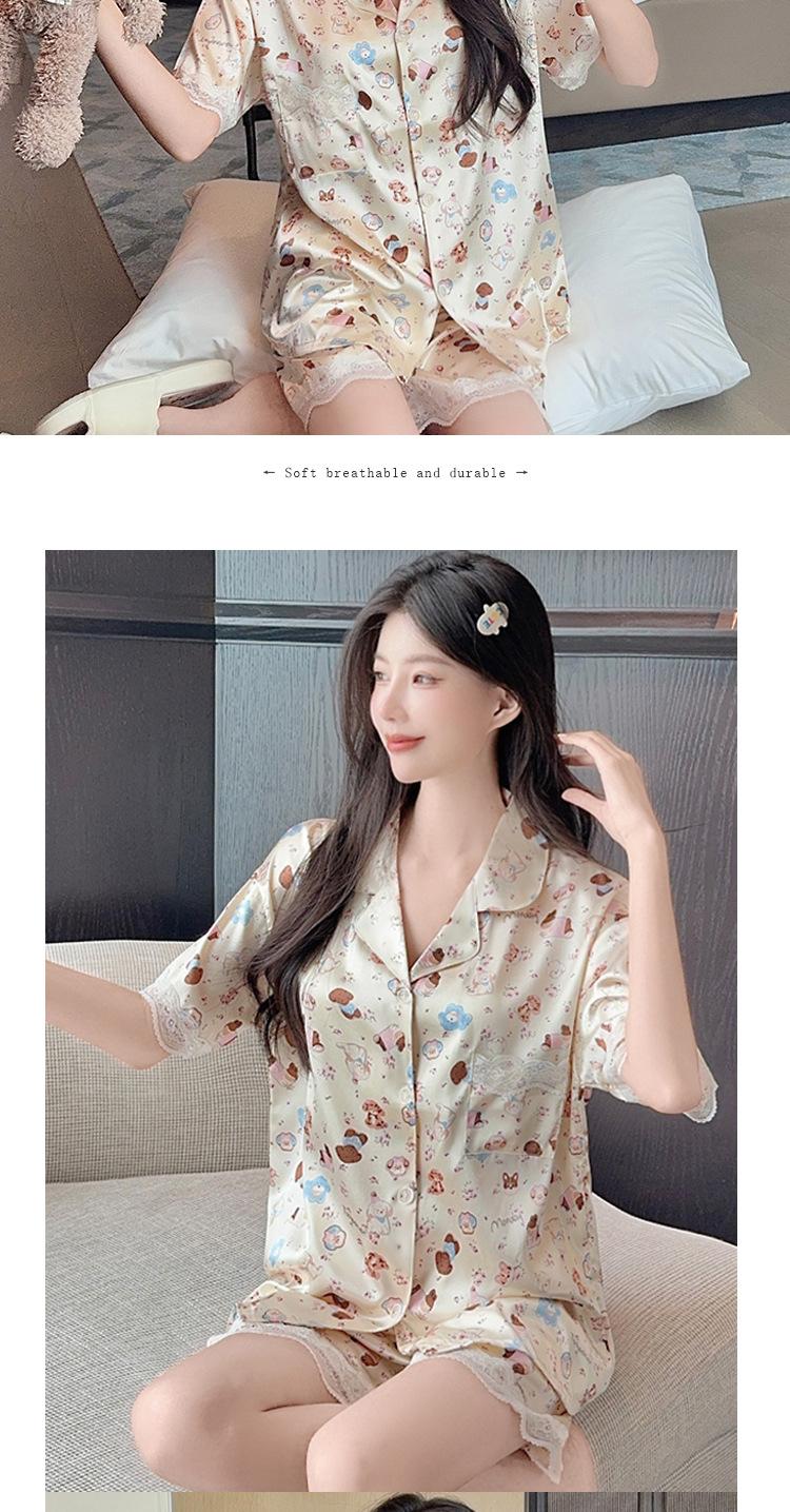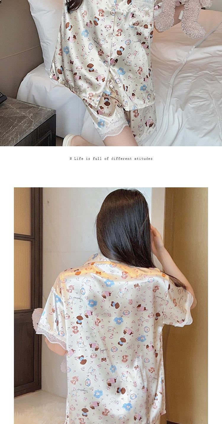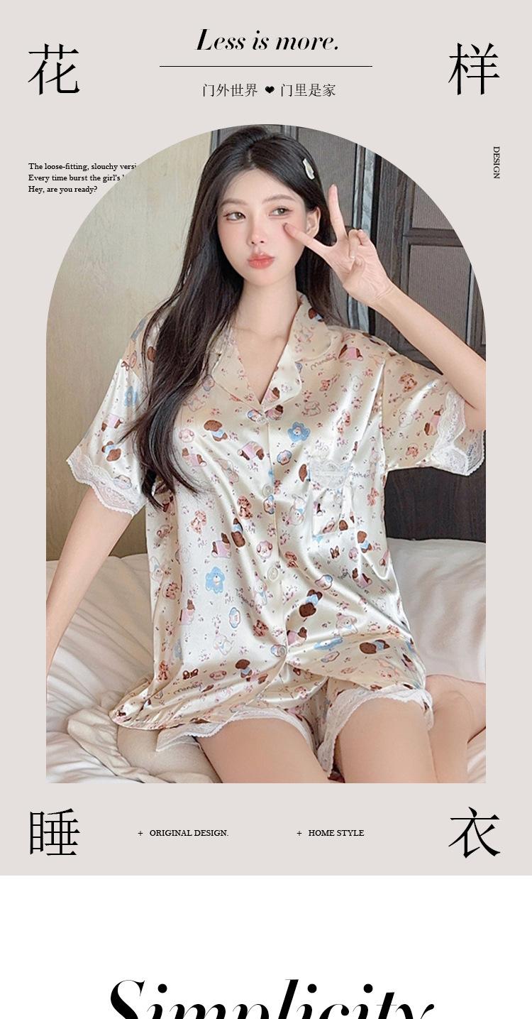 Pijama de Seda Gelo para Mulheres Verão Estilo Luxo Leve de Alta Qualidade Floral Cachorrinho Renda Manga Curta Conjunto de Roupa de Casa Atacado