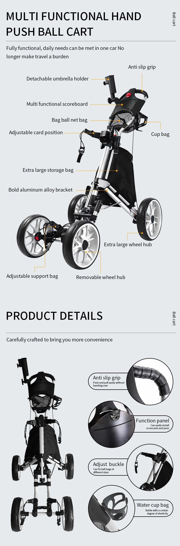 Carrinho de Golfe de Quatro Rodas, Carrinho de Golfe Dobrável, Carrinho Portátil de Empurrar-Puxar para Adultos e Adolescentes, Carrinho para Bolsa de Golfe