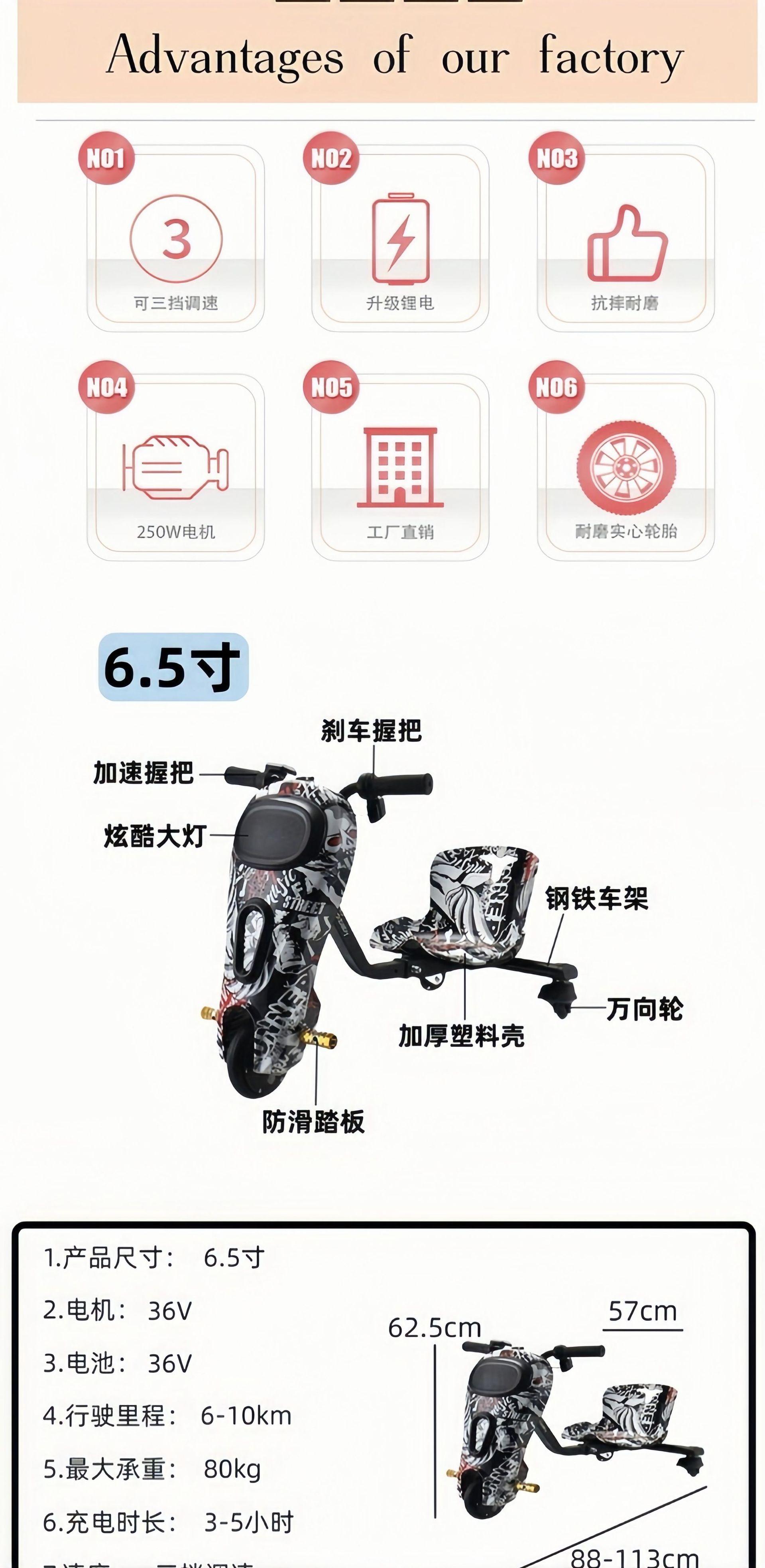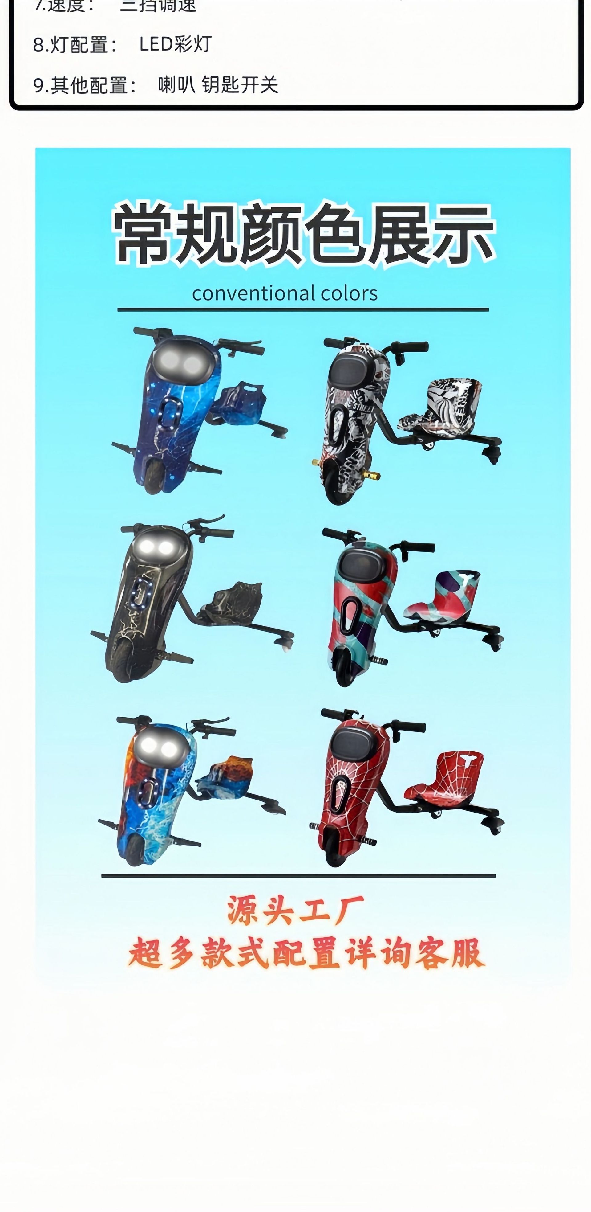 Carrinho de Drift Elétrico Infantil de 6,5 polegadas Recarregável Kart com Balanço da Cauda Sensível ao Movimento, Veículo Elétrico de Três Rodas, Kart Elétrico