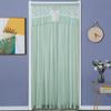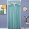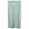 A imagem abaixo é uma cortina de renda verde clara com um laço.