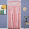 A imagem abaixo é uma cortina de renda rosa com um laço