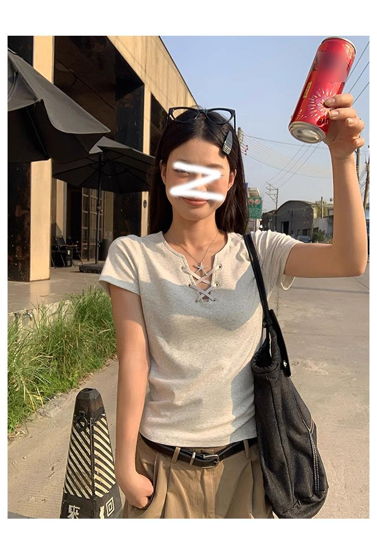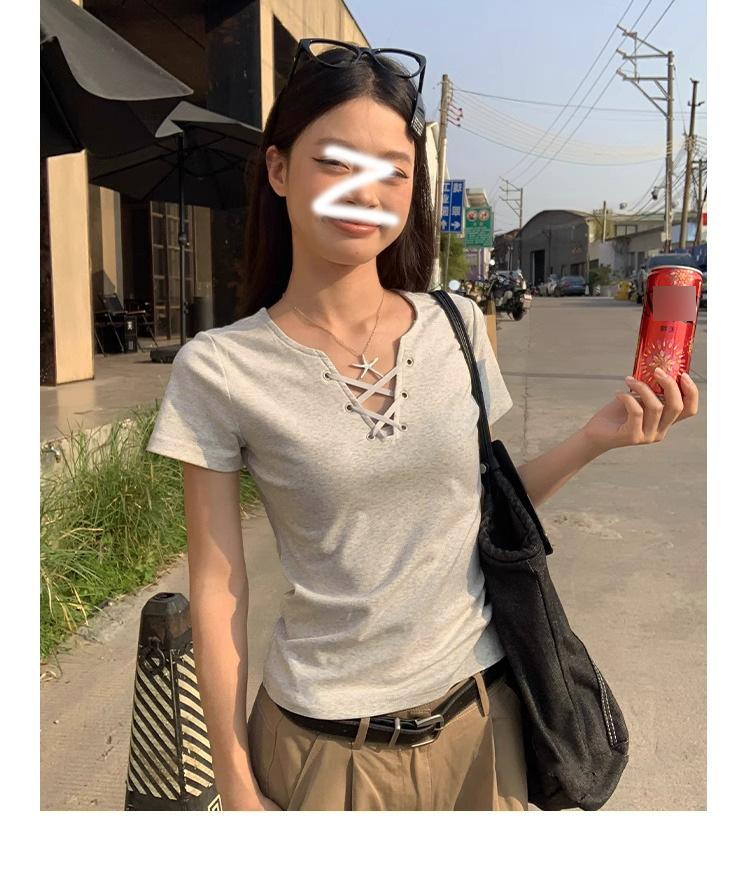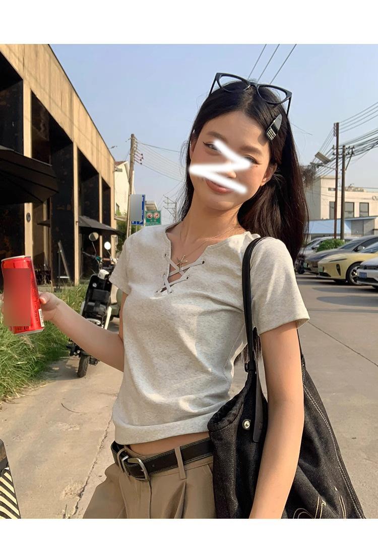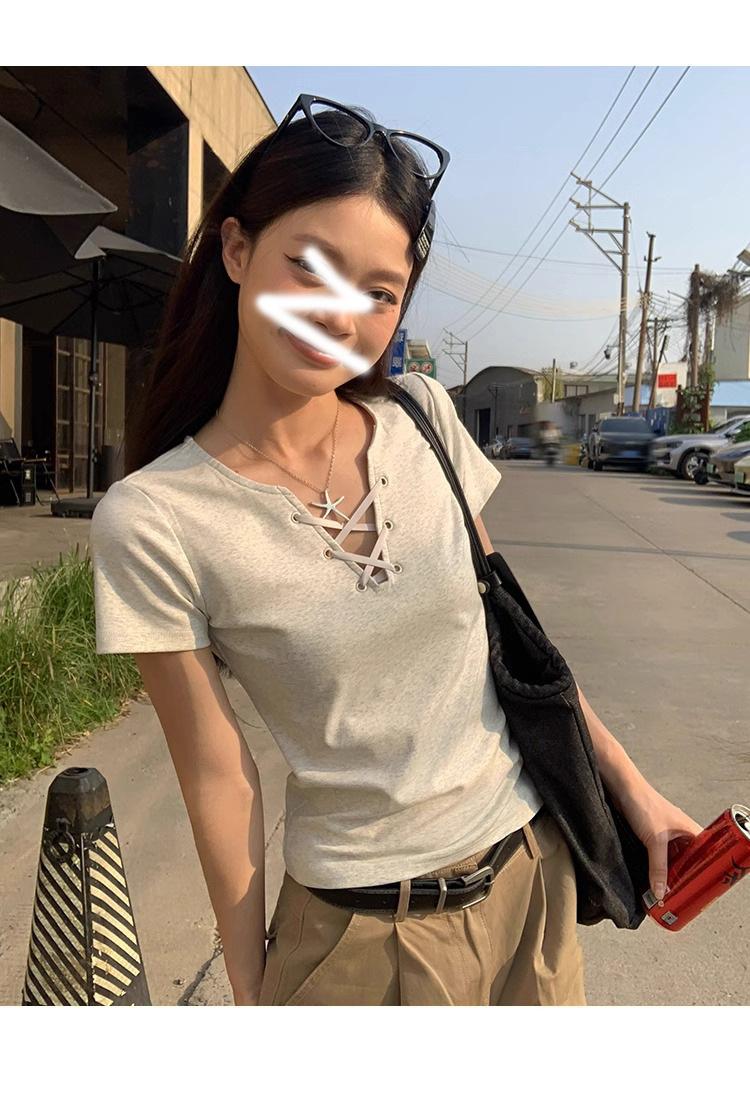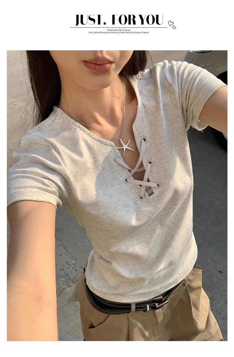 Camiseta Feminina de Manga Curta com Design de Alça Decote V High-End para o Verão Novo Estilo Ajuste Slim Doce e Picante Lindo Top com Aparência Emagrecedora