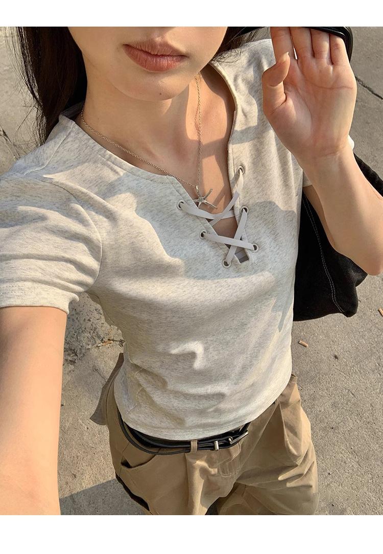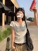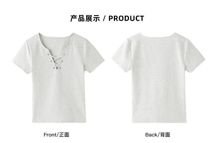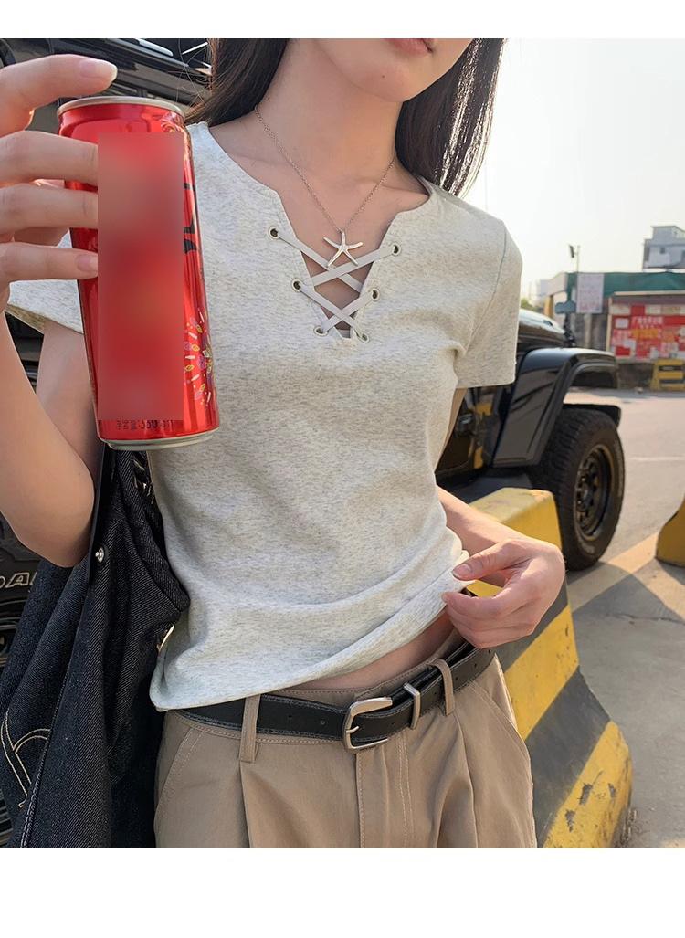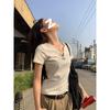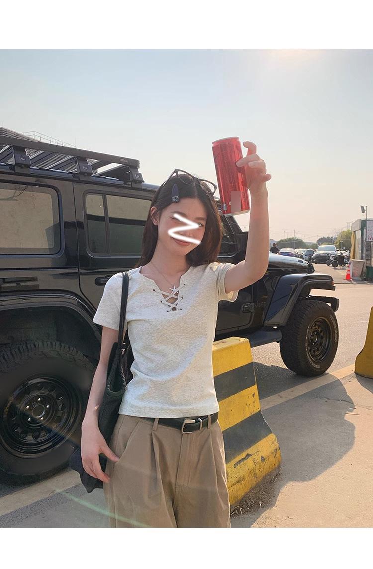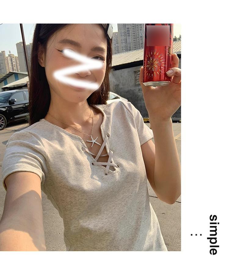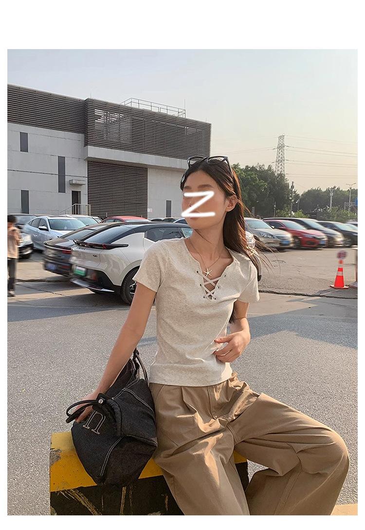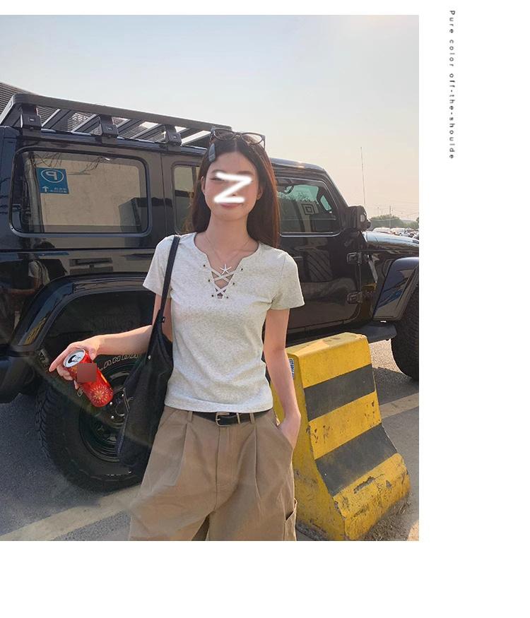 Camiseta Feminina de Manga Curta com Design de Alça Decote V High-End para o Verão Novo Estilo Ajuste Slim Doce e Picante Lindo Top com Aparência Emagrecedora