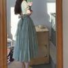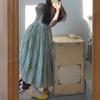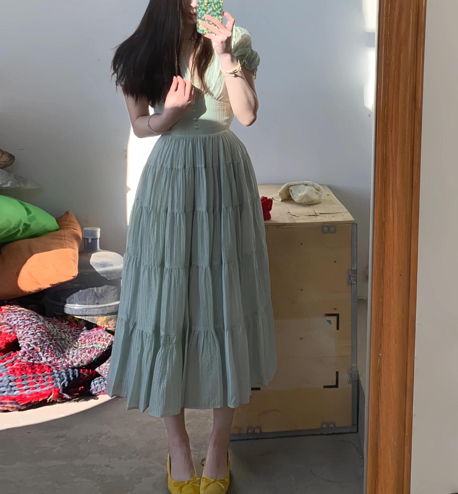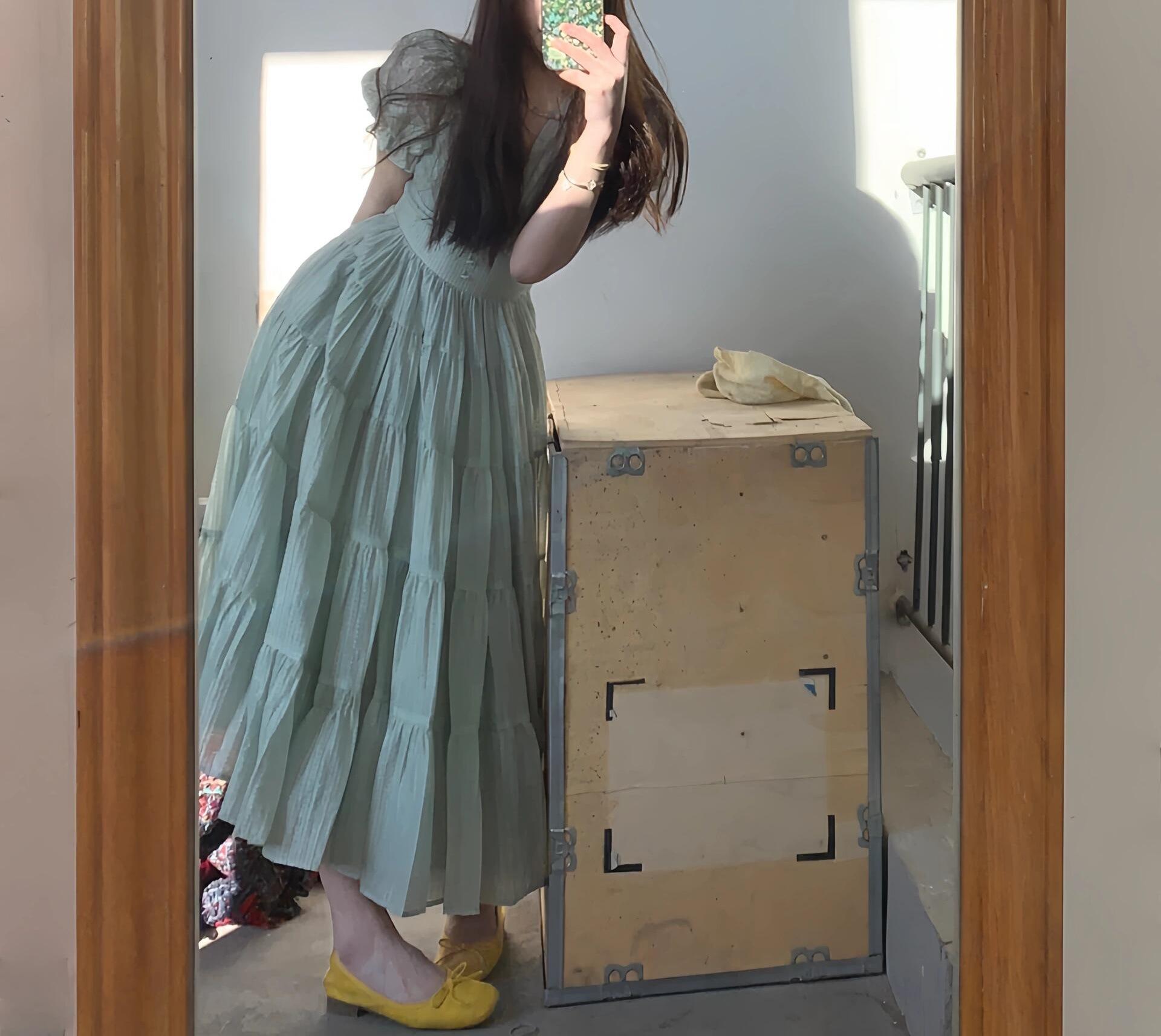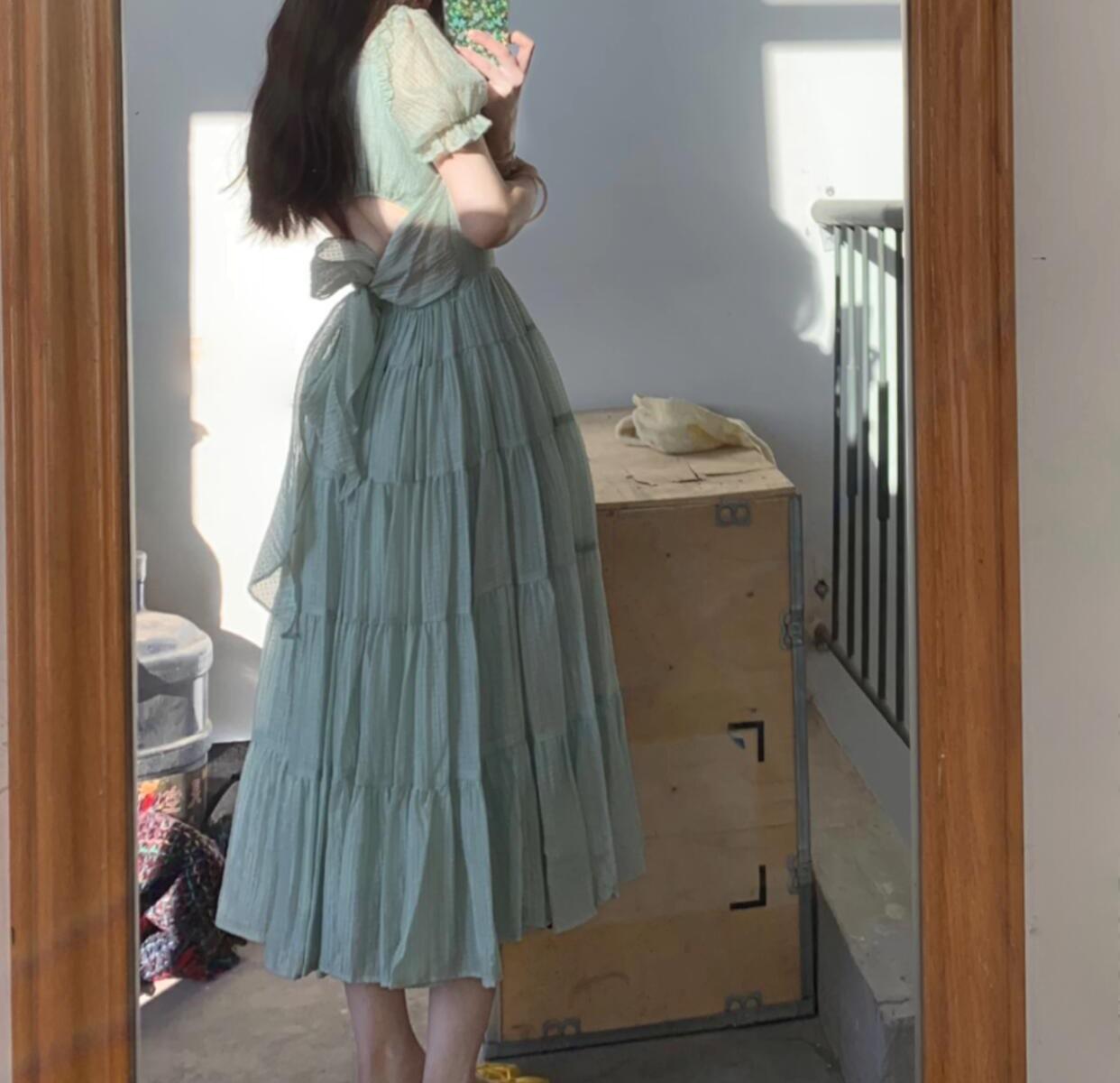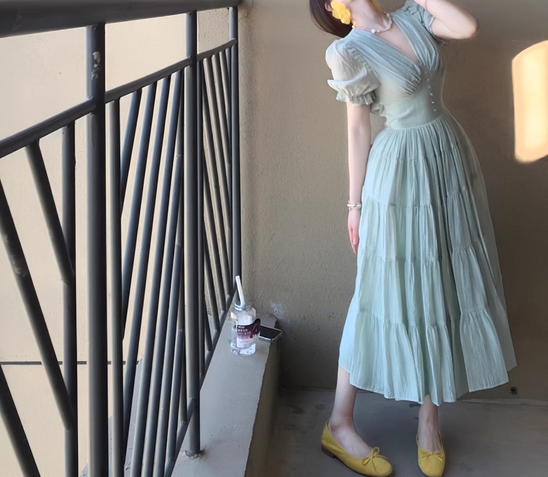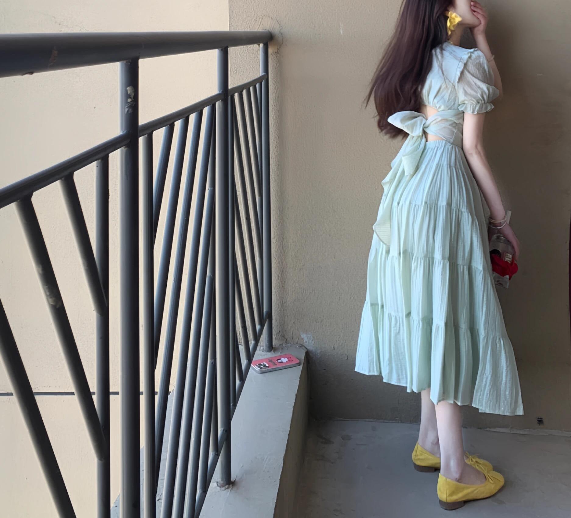 Vestido Suave de Decote V Estilo Francês de Manga Curta Roupa Feminina Verão Nova Chegada Design Vazado Cintura Emagrecedora Saia Longa