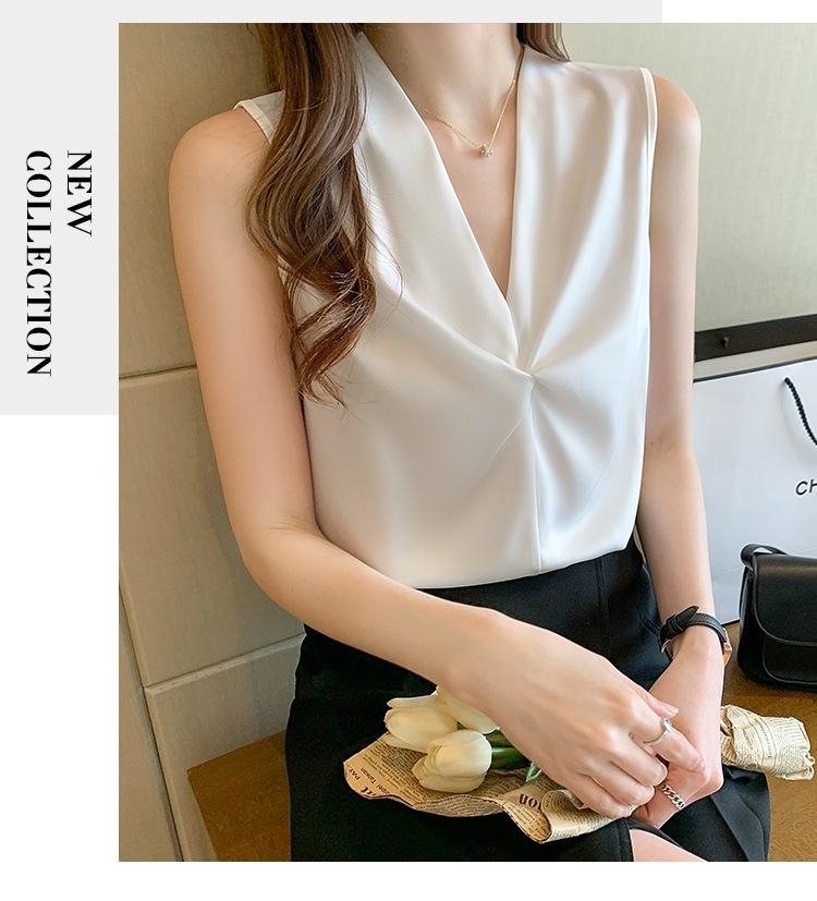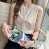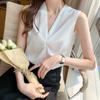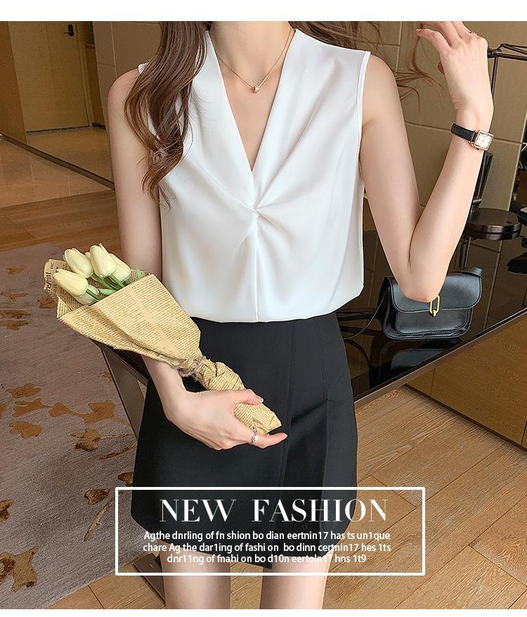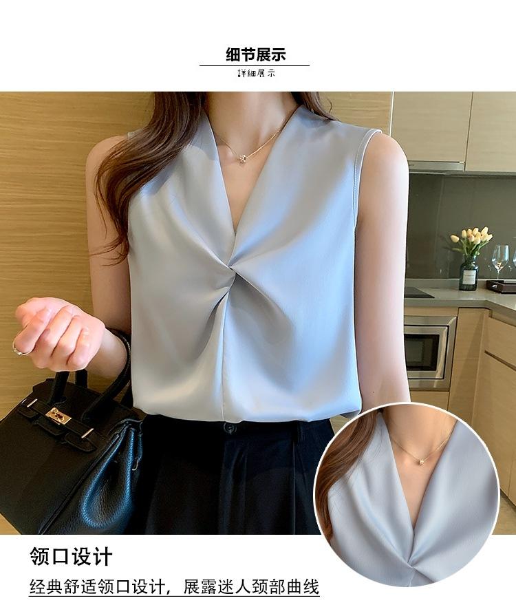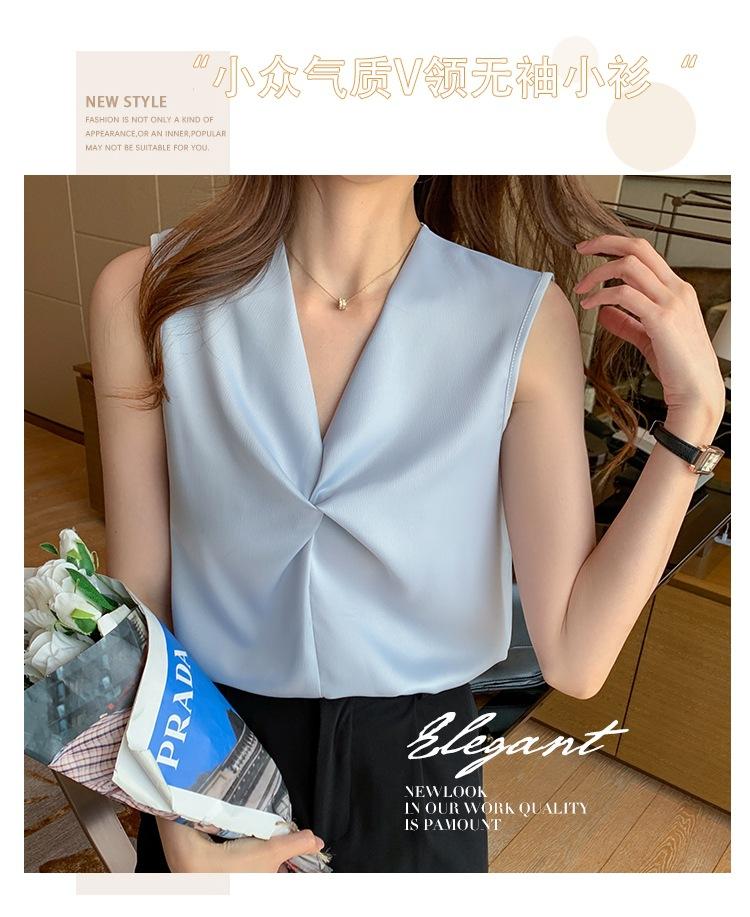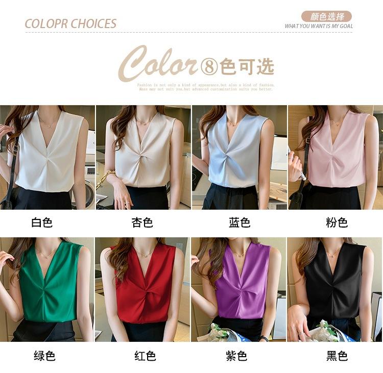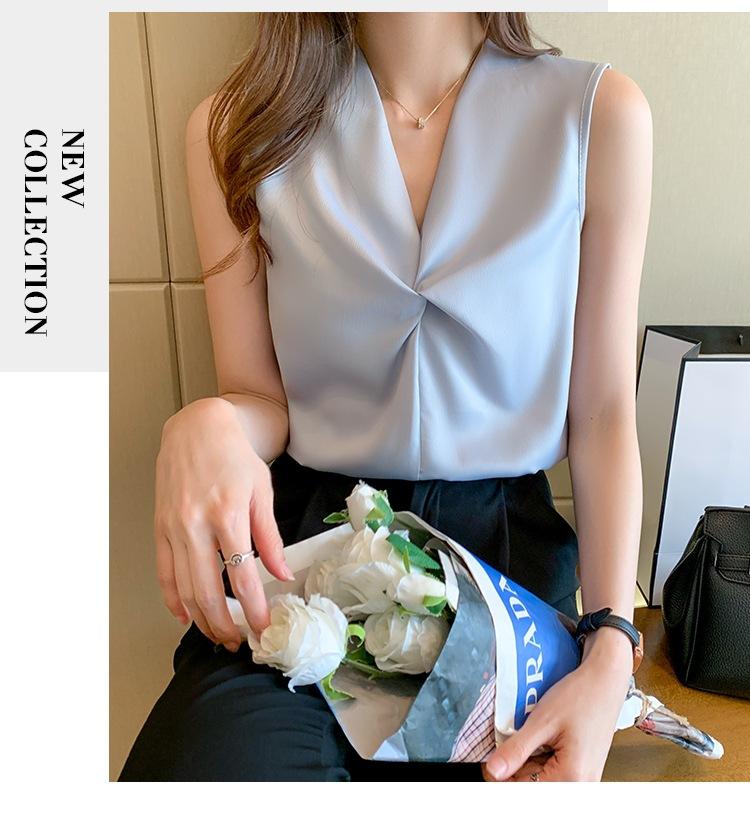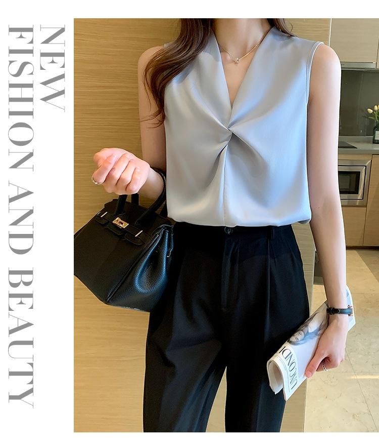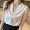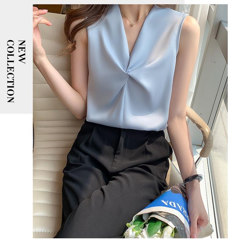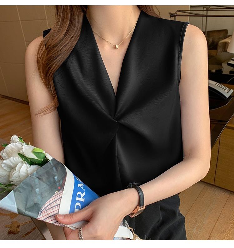 Compre Top de Cetim Sem Mangas para Mulheres 2025 Verão Novo Estilo Transpassado Decote V Solto e Estiloso Cobre a Barriga Camisa de Chiffon Estilo Coreano no atacado no Joom.pro