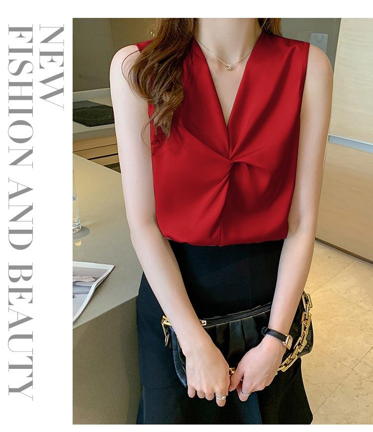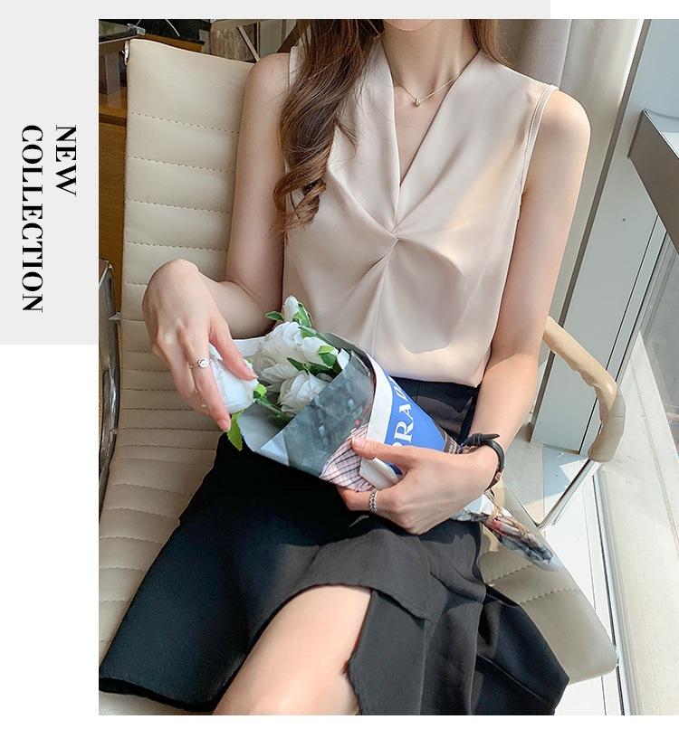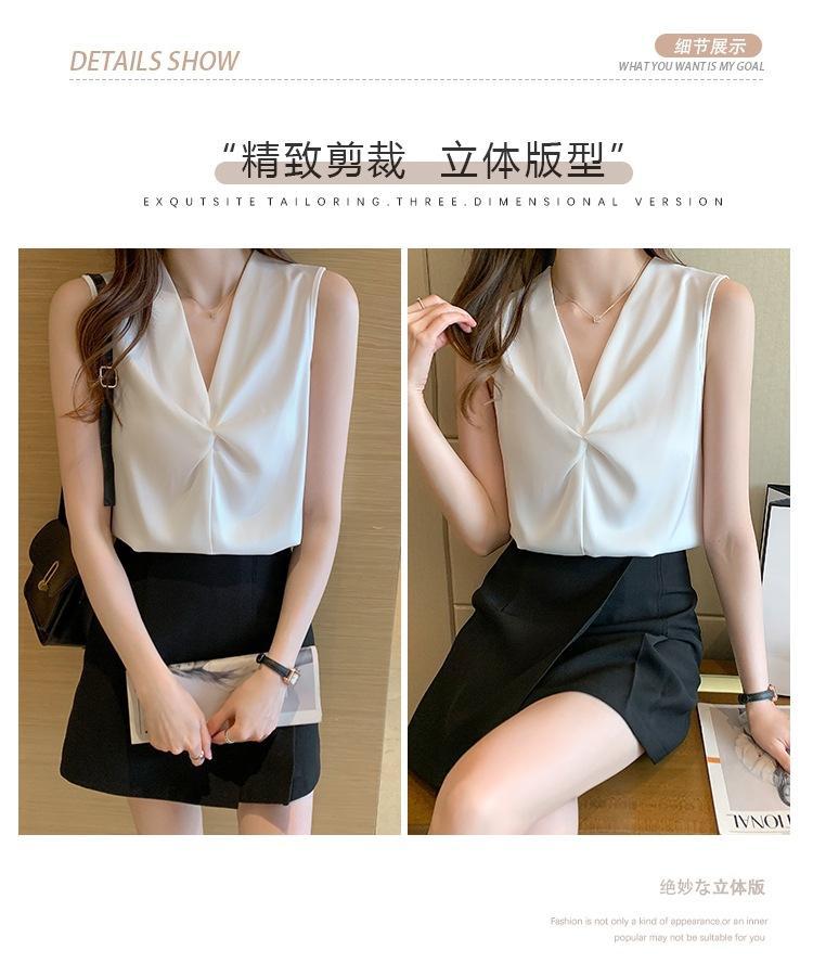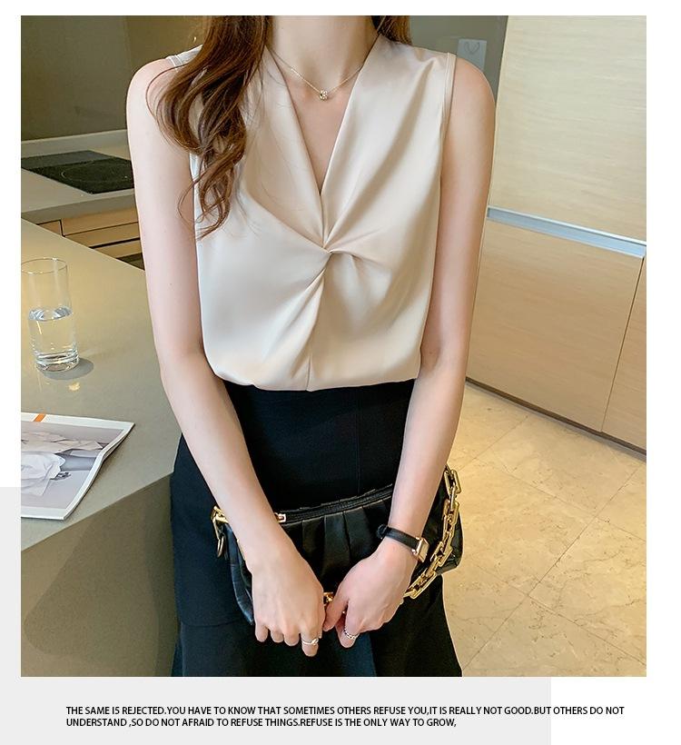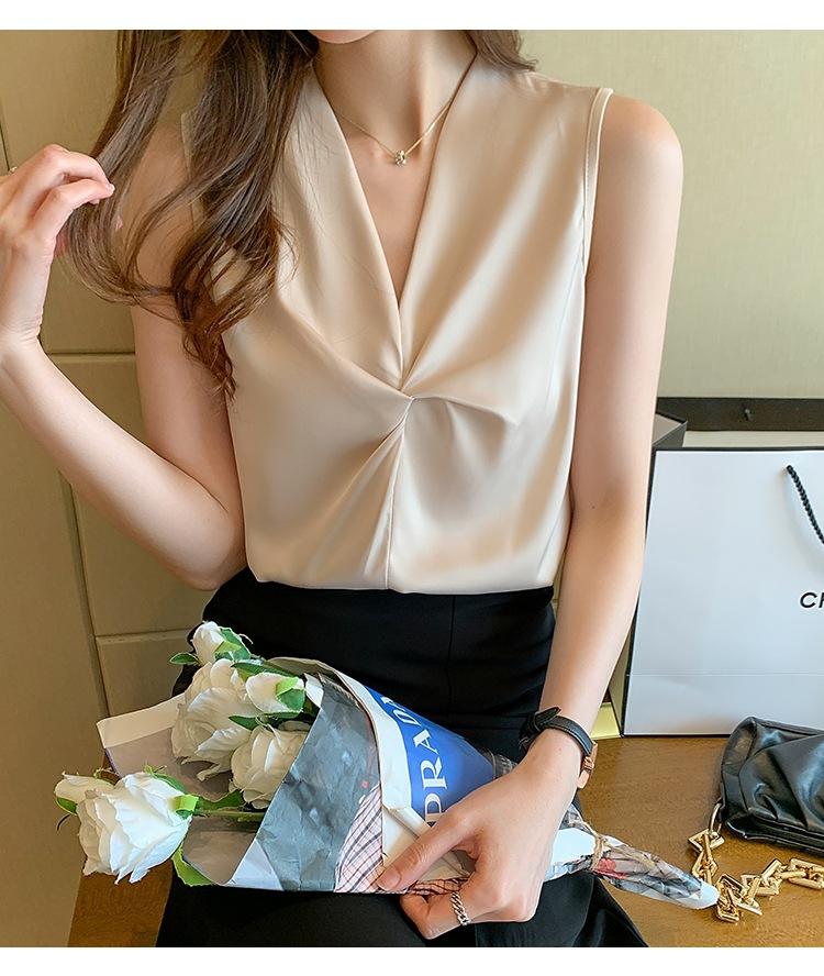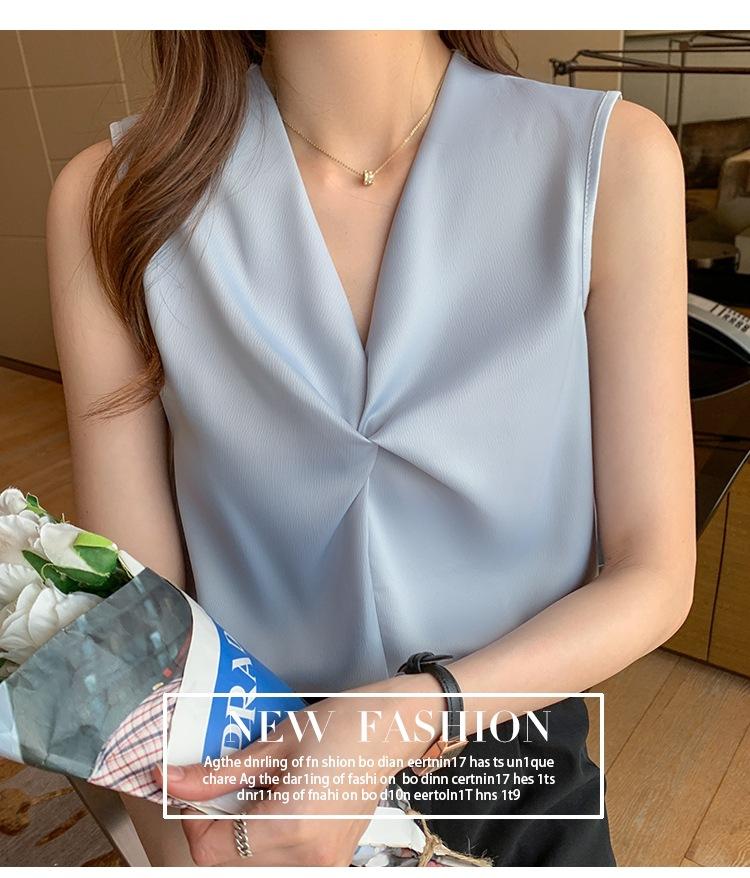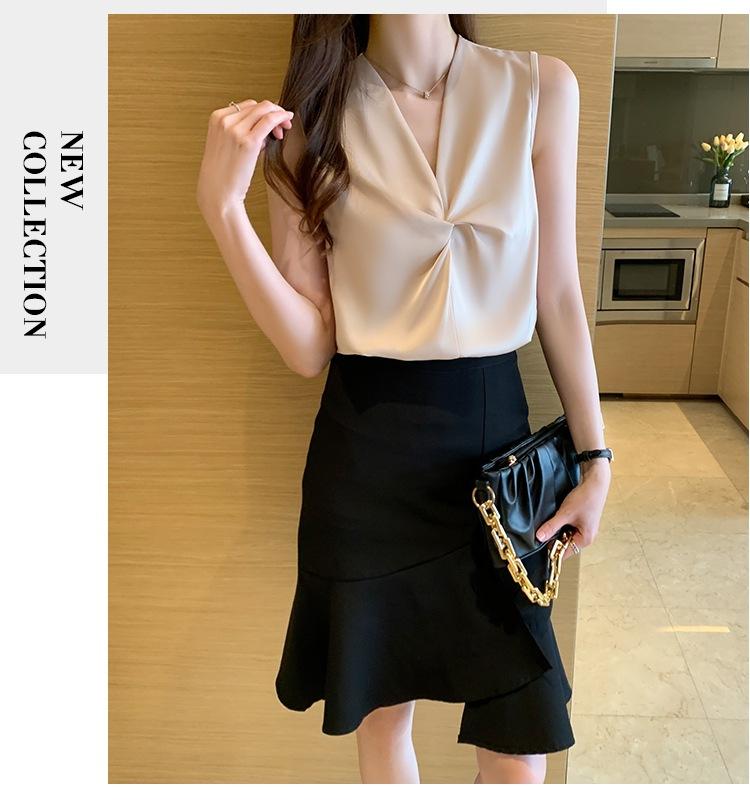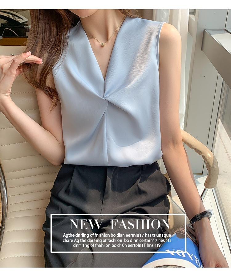 Compre Top de Cetim Sem Mangas para Mulheres 2025 Verão Novo Estilo Transpassado Decote V Solto e Estiloso Cobre a Barriga Camisa de Chiffon Estilo Coreano no atacado no Joom.pro