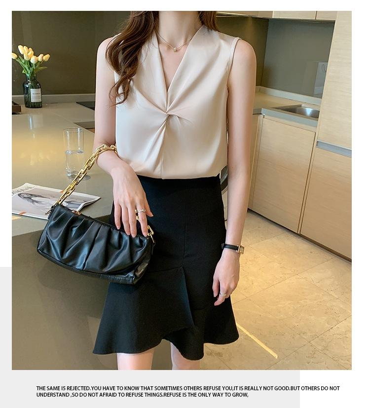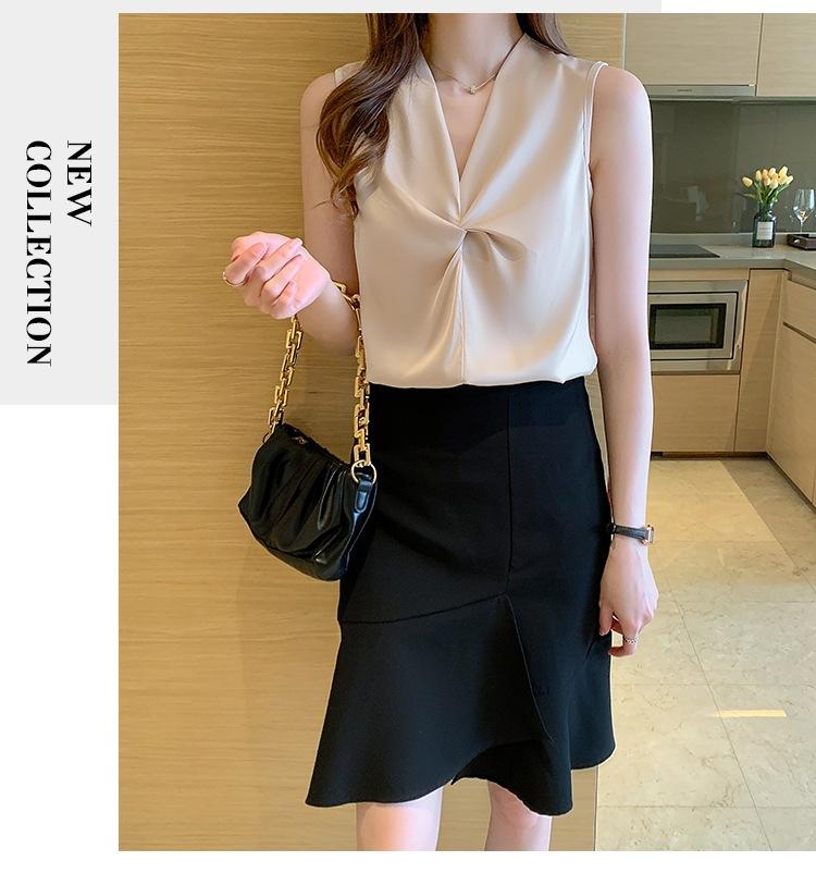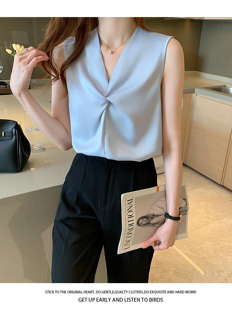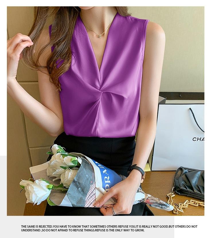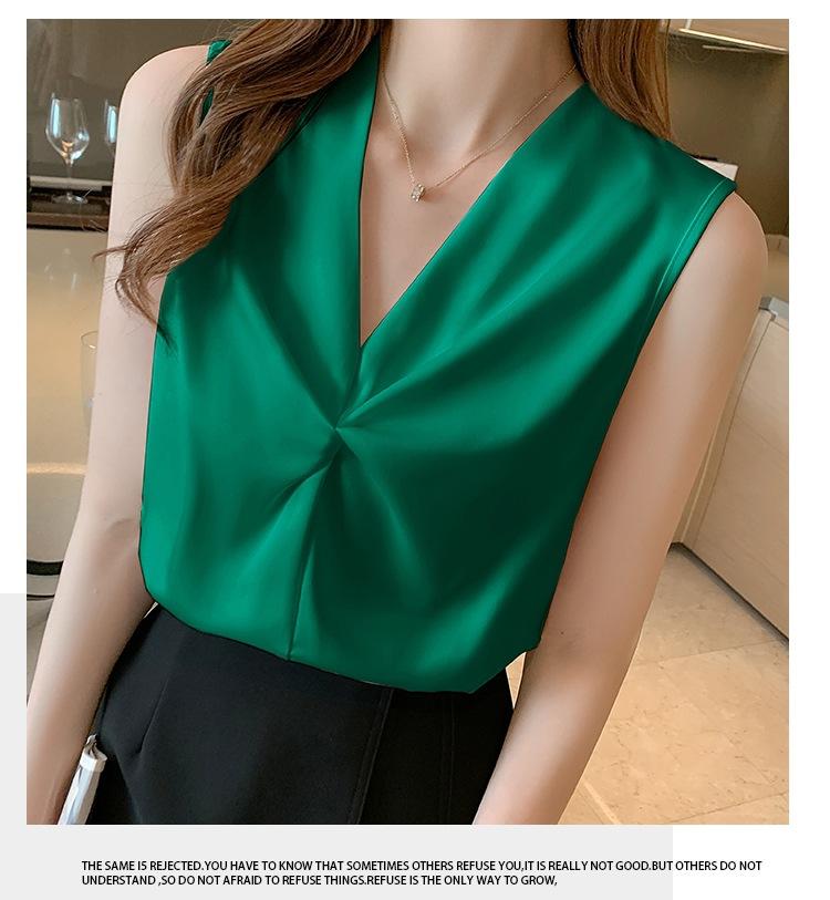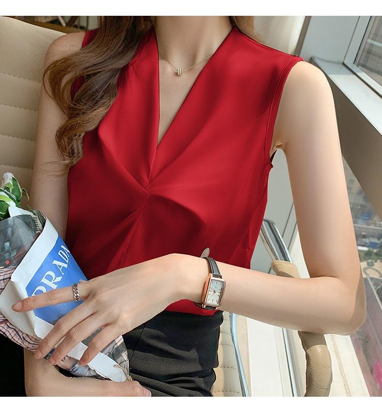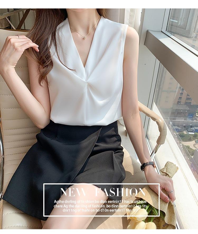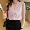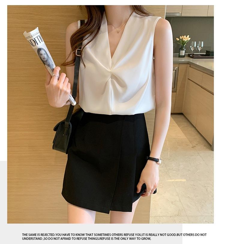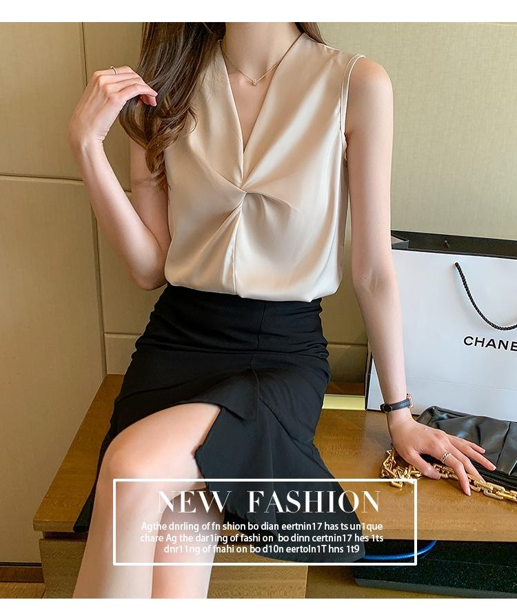 Compre Top de Cetim Sem Mangas para Mulheres 2025 Verão Novo Estilo Transpassado Decote V Solto e Estiloso Cobre a Barriga Camisa de Chiffon Estilo Coreano no atacado no Joom.pro