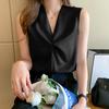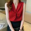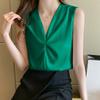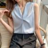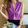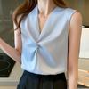 Top de Cetim Sem Mangas para Mulheres 2025 Verão Novo Estilo Transpassado Decote V Solto e Estiloso Cobre a Barriga Camisa de Chiffon Estilo Coreano