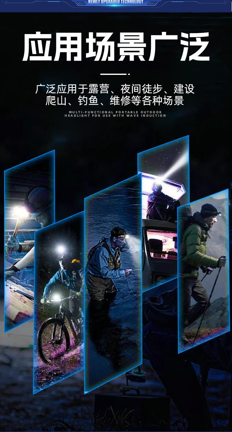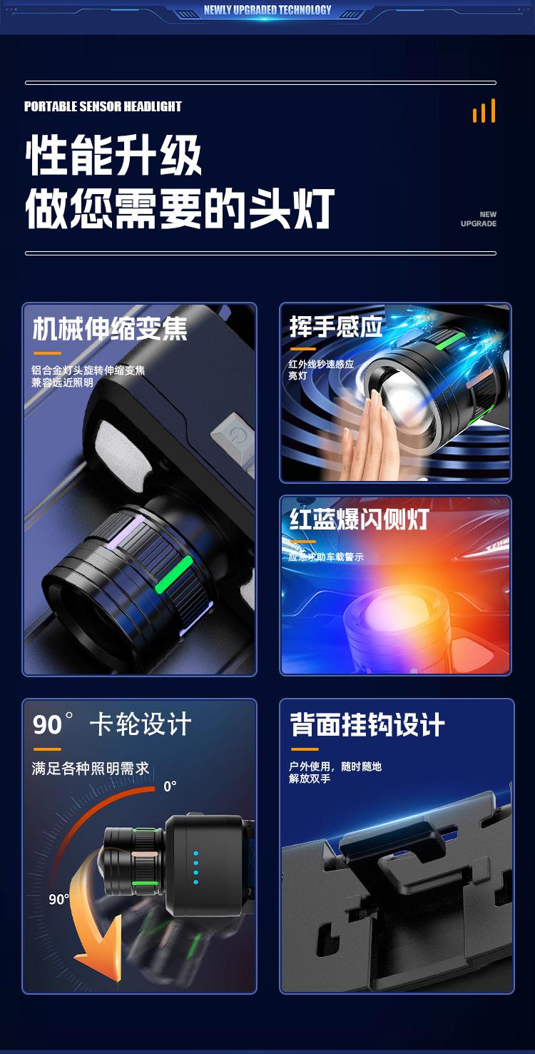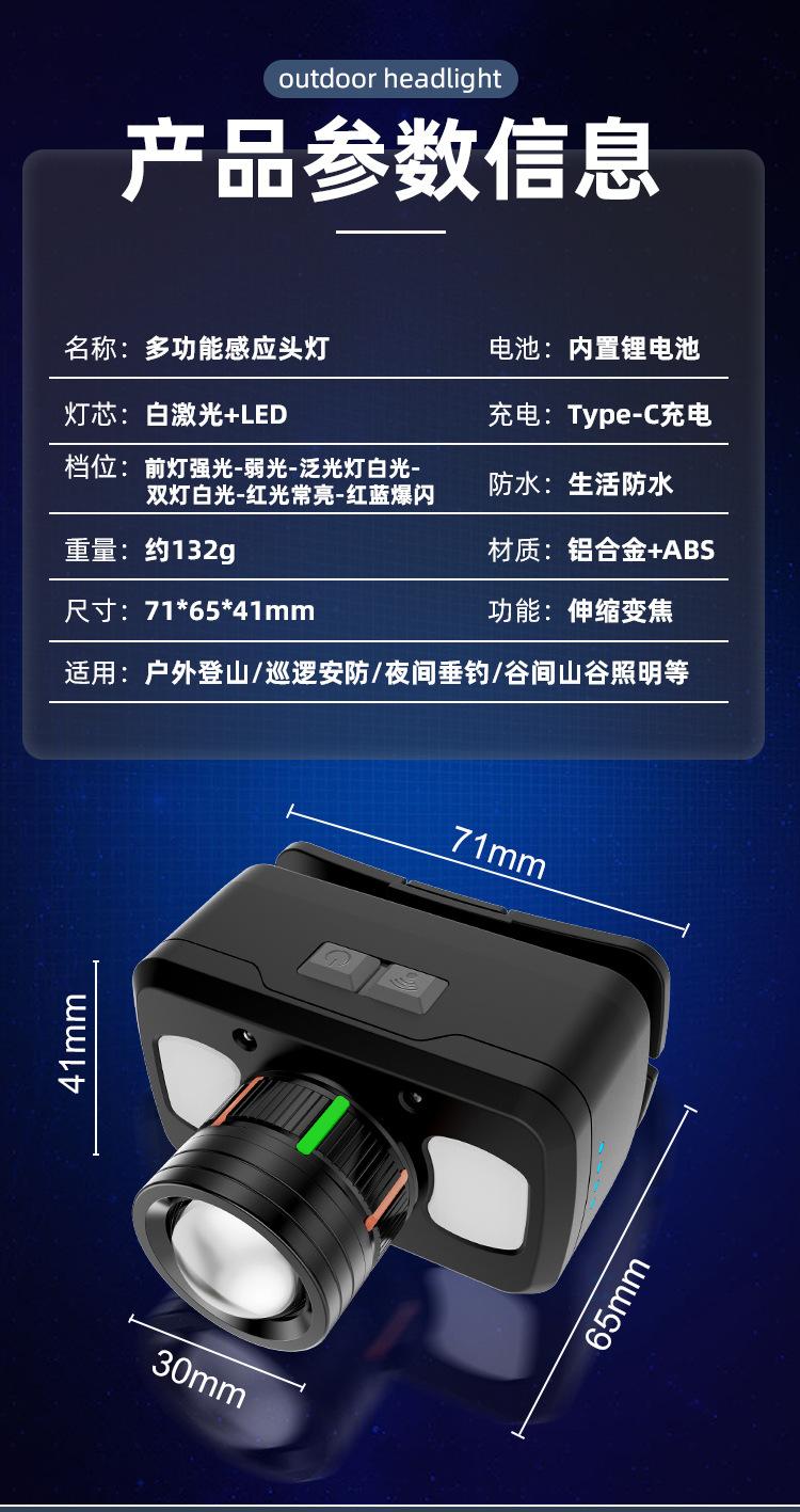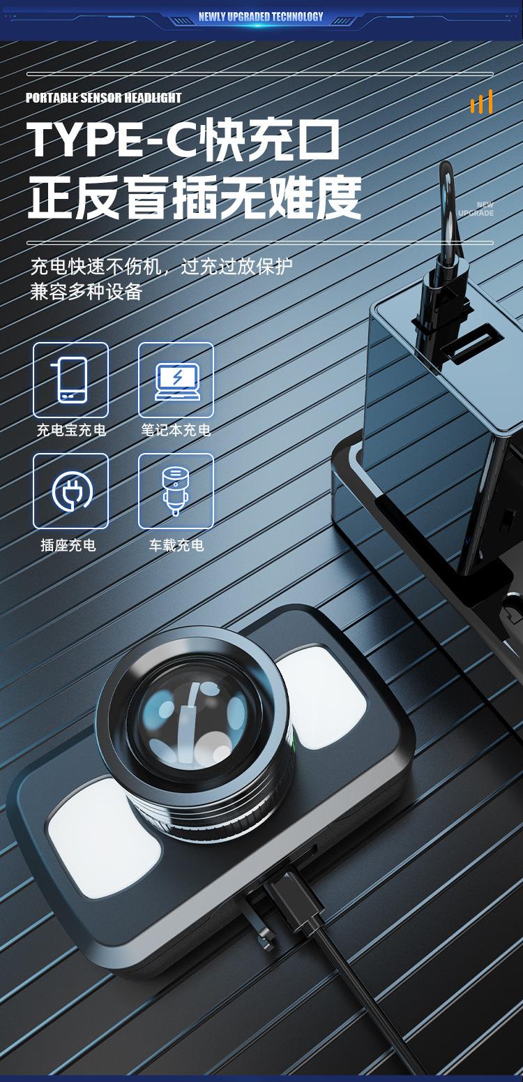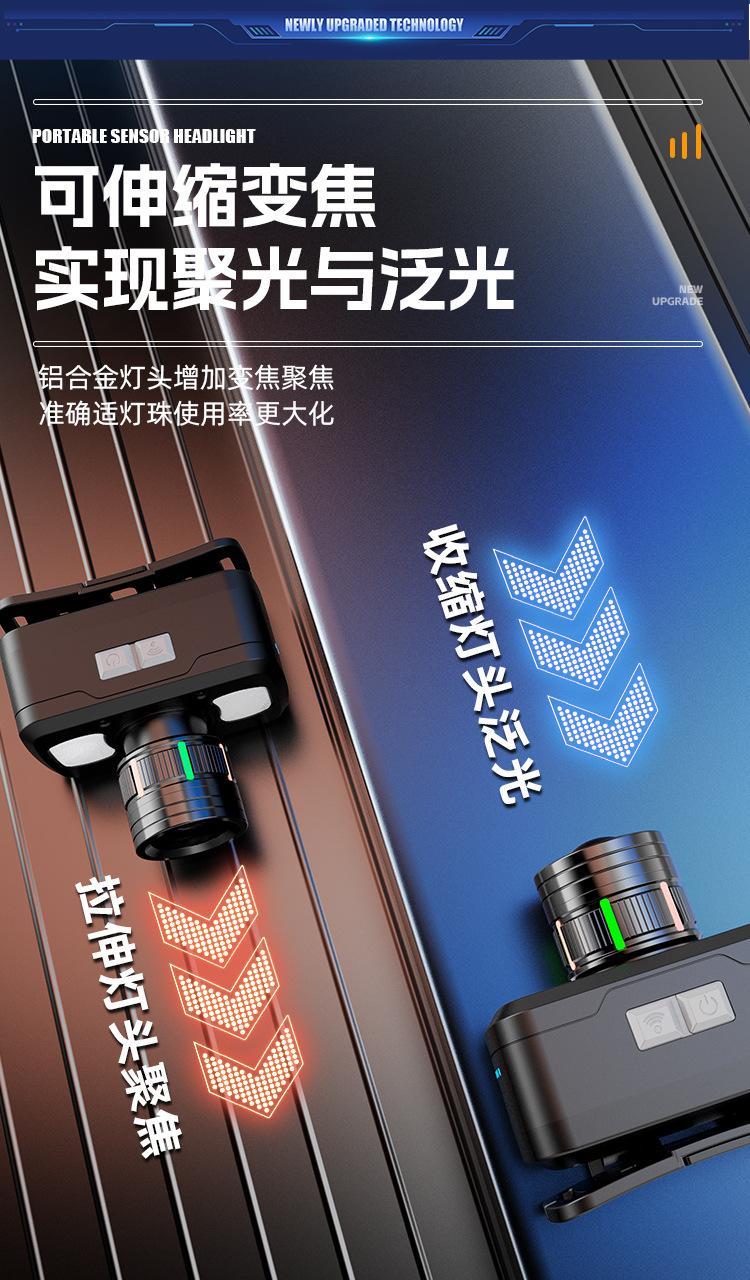 Novo farol de LED com zoom de indução de longo alcance, carregamento USB, luz forte, pesca noturna ao ar livre, à prova d'água, multifuncional, farol pequeno