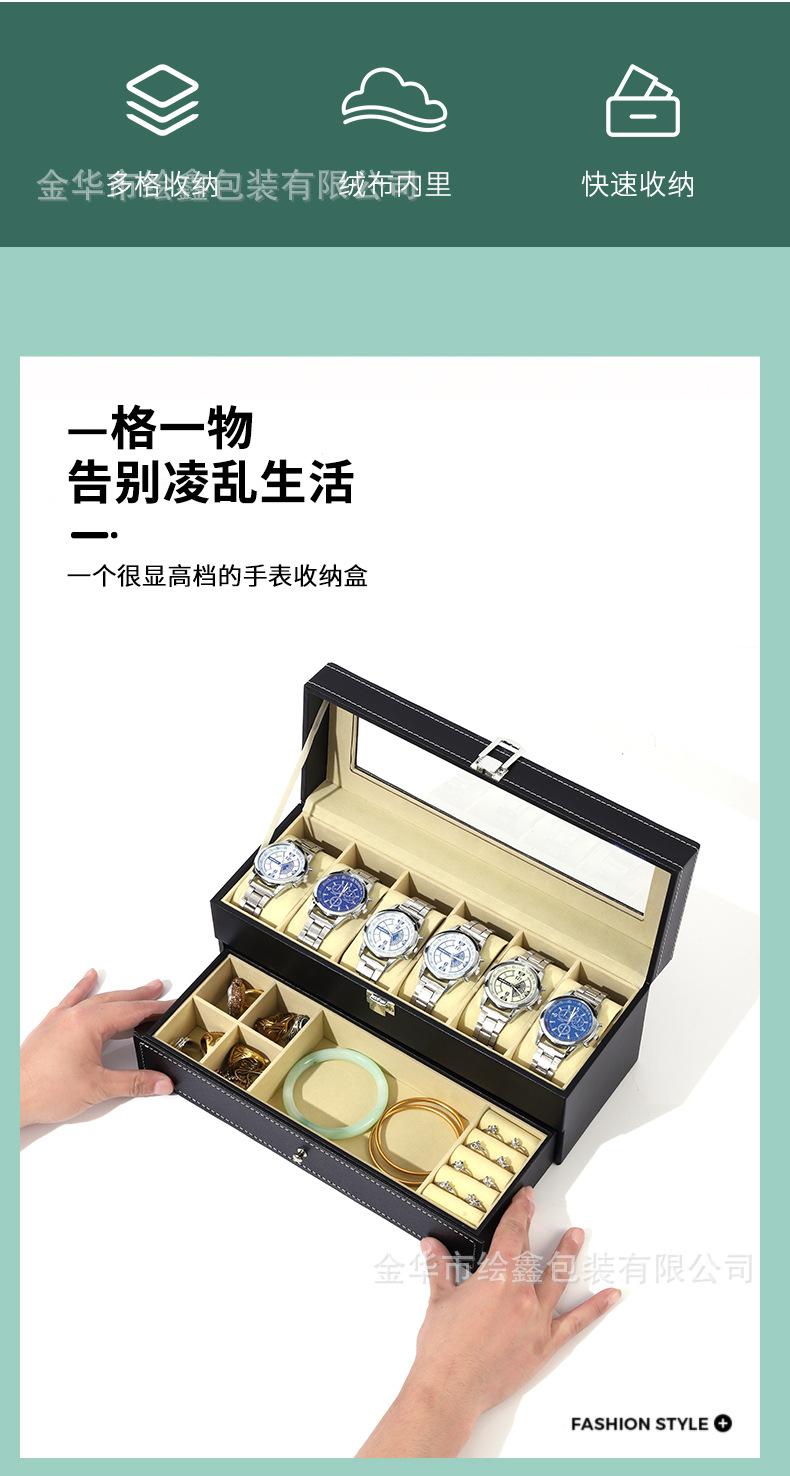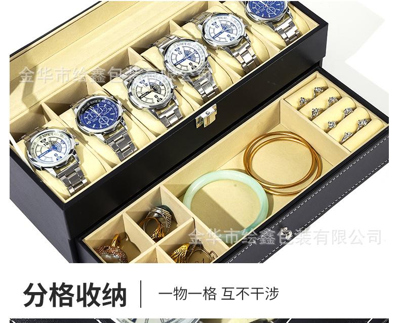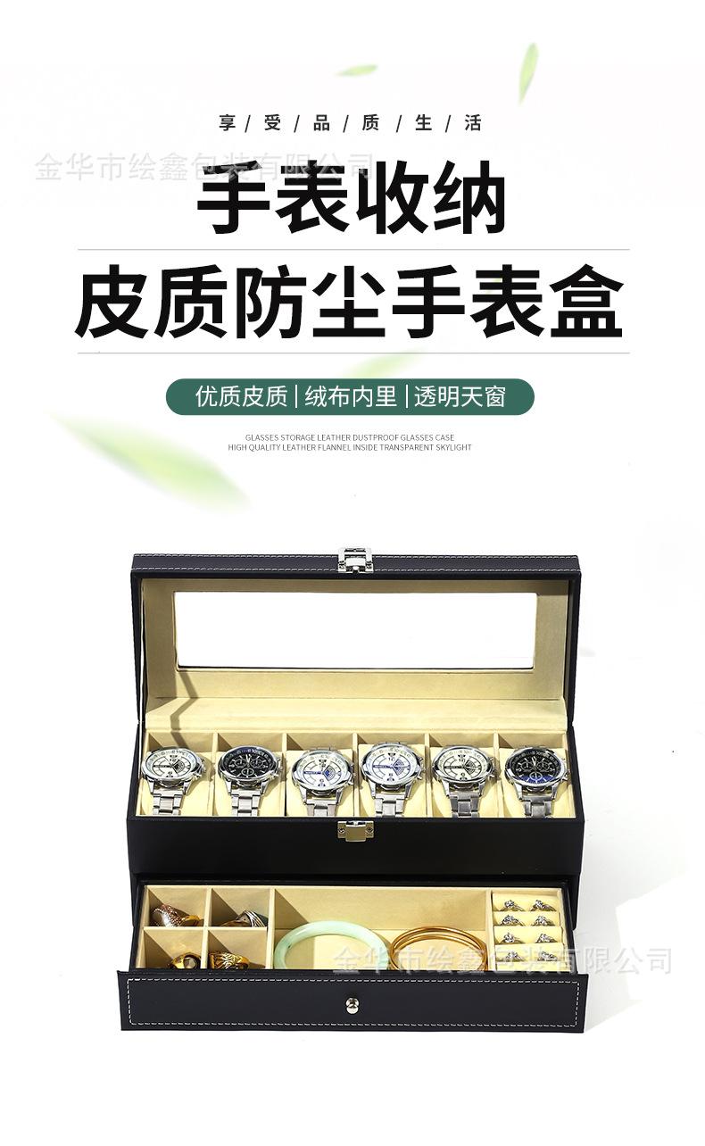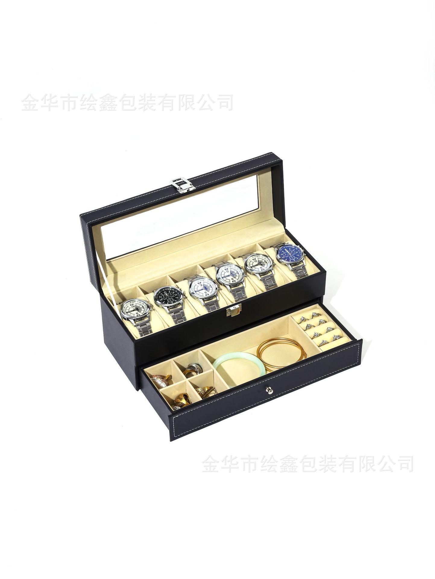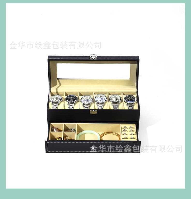 Nome do Produto: Caixa de Armazenamento de Relógios e Joias de Couro PU de Camada Dupla com 6 Compartimentos