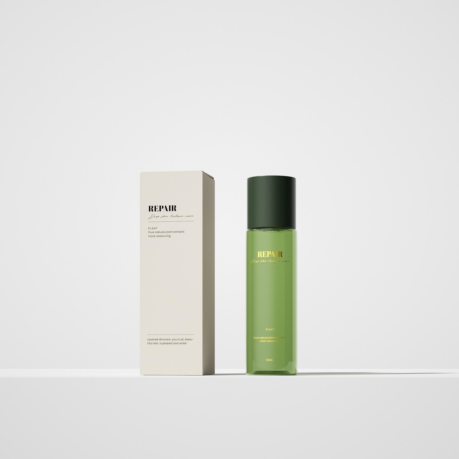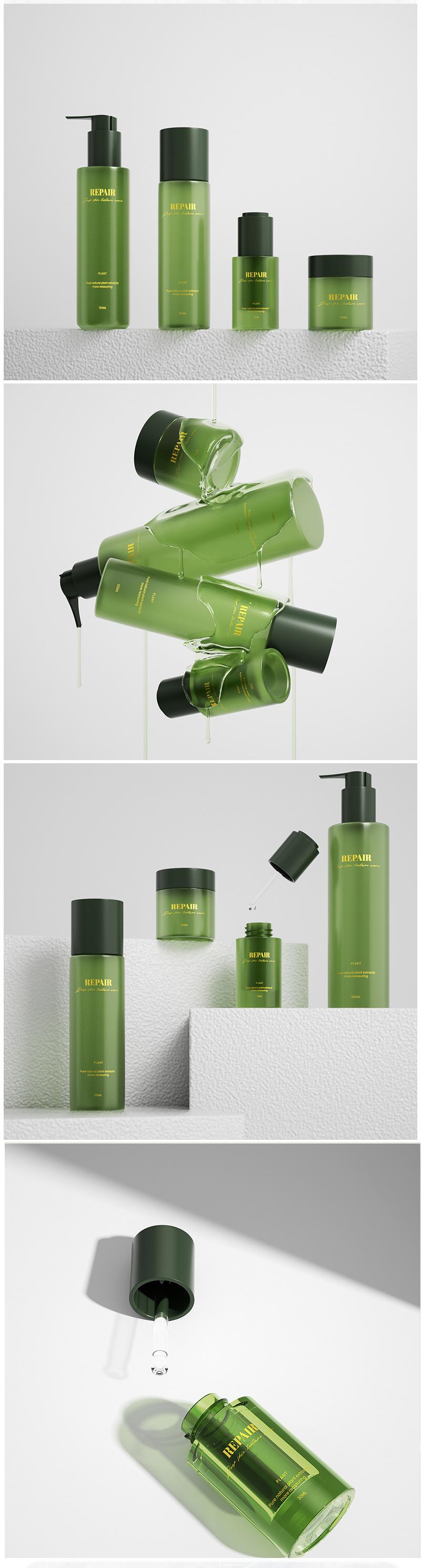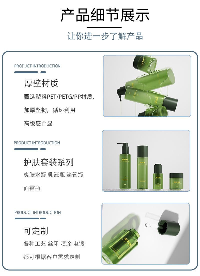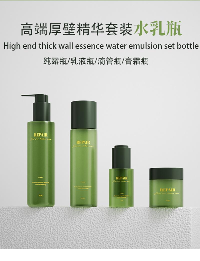 Nova embalagem verde de alta qualidade para cuidados com a pele, frasco de creme de base espessa 50g, frasco de loção com pump 120ml, frasco de essência