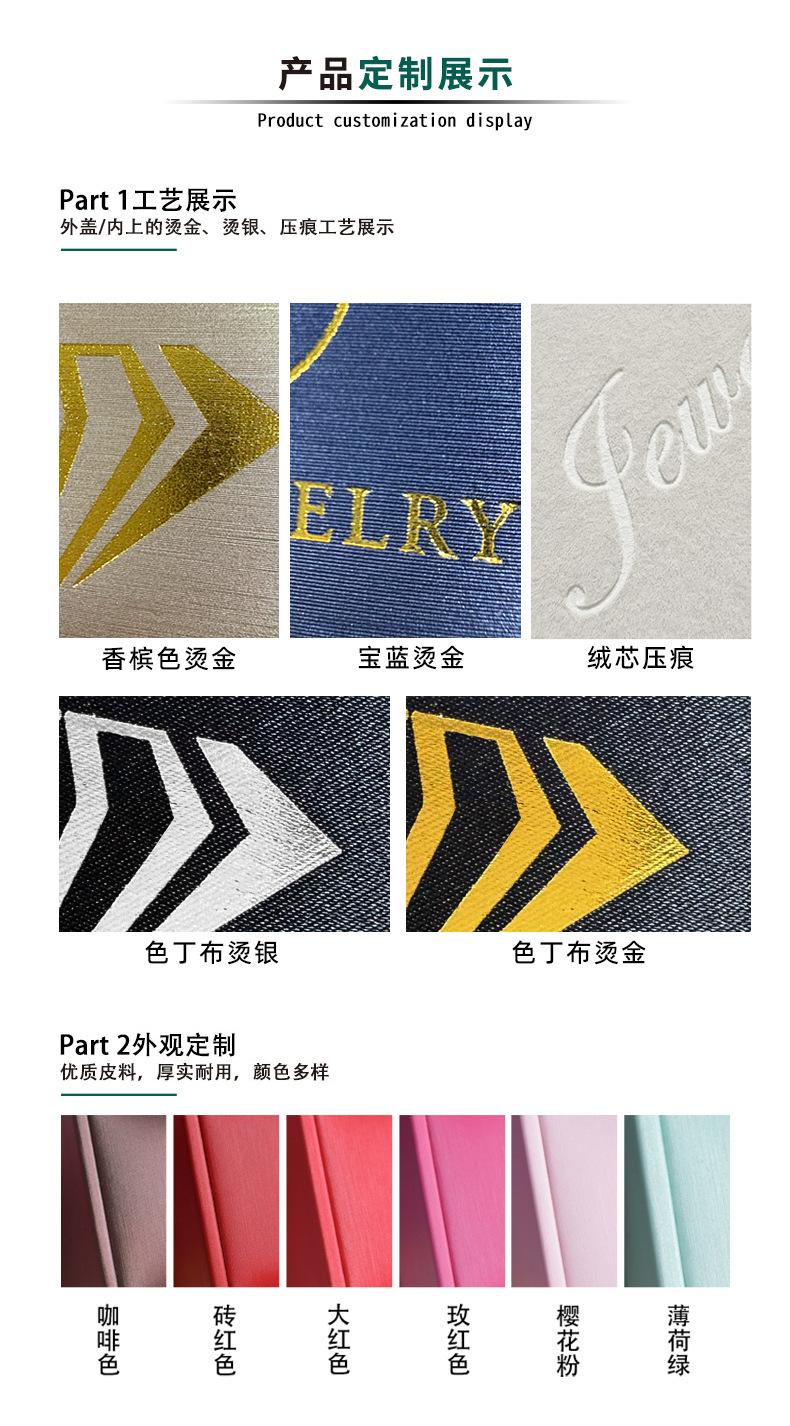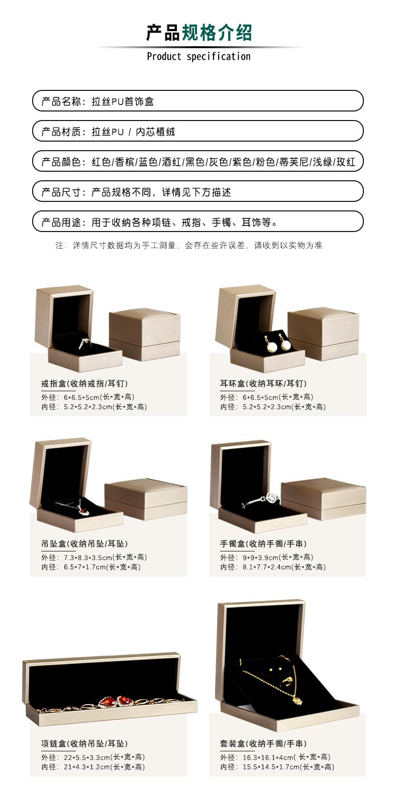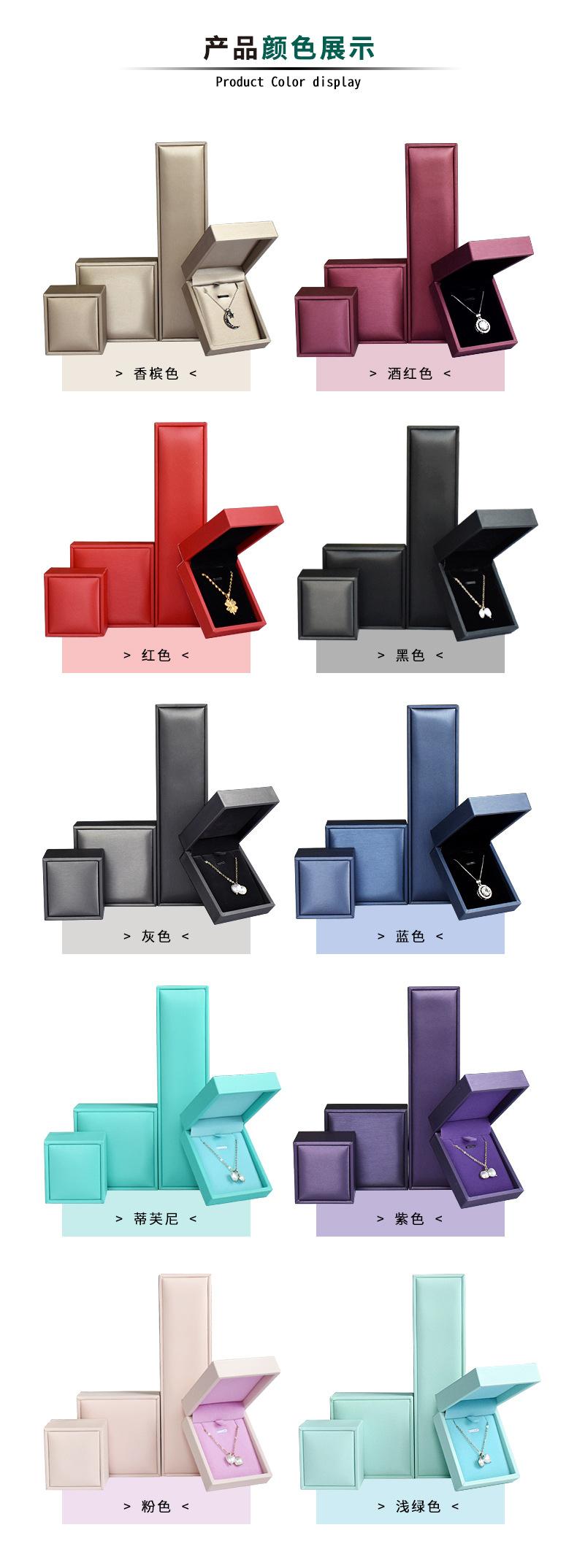 Bracelet box 9*9*4cm, Ring box 6*6.5*5cm, Earring box 6*6.5*5cm, Necklace box 22*5.6*3.5cm, Pendant box 7.4*8.4*3.7cm