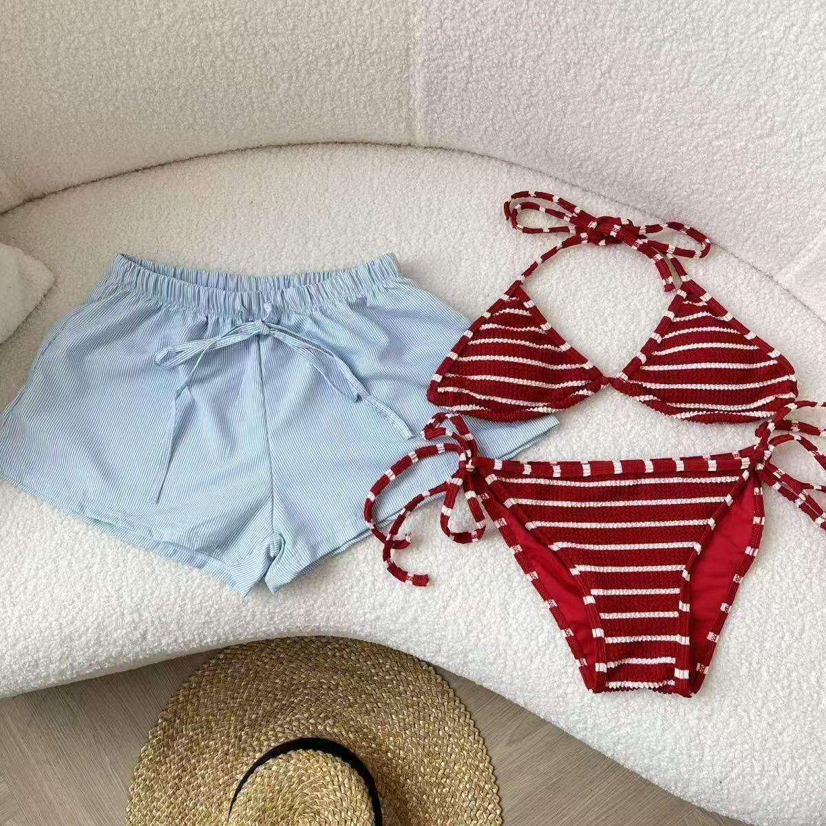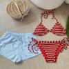 Maiô Novo Estilo Dividido Simples Listrado de Amarrar Triângulo Bolsa Biquíni com Bojos Sexy Maiô de Praia para Mulheres