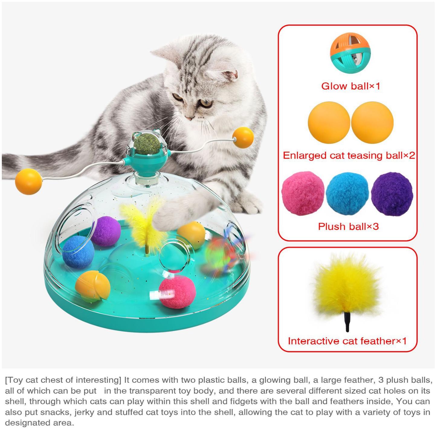 Nosso produto consiste em um corpo base transparente, um brinquedo elástico rotativo para gatos e uma bola grande de catnip.. O brinquedo vem com: (2 bolas de tênis de mesa grandes), (1 bola luminosa grande), (4 bolas de pelúcia), e (1 pena grande de pelúcia com base). Os usuários também podem colocar várias penas, petiscos, carne seca, pequenos bichos de pelúcia para gatos, etc.. no corpo transparente do brinquedo por si mesmos. Quando um gato tem este brinquedo, é equivalente a ter mais de 99% dos brinquedos para gatos no mercado. Adequado para gatos de diferentes idades e raças. Adiciona uma ampla variedade de prazeres aos gatos.