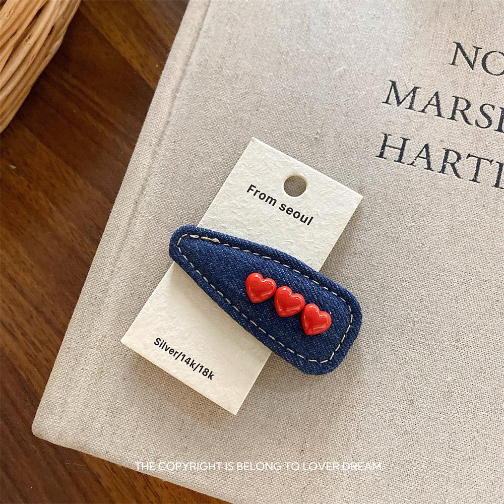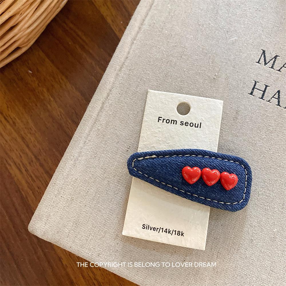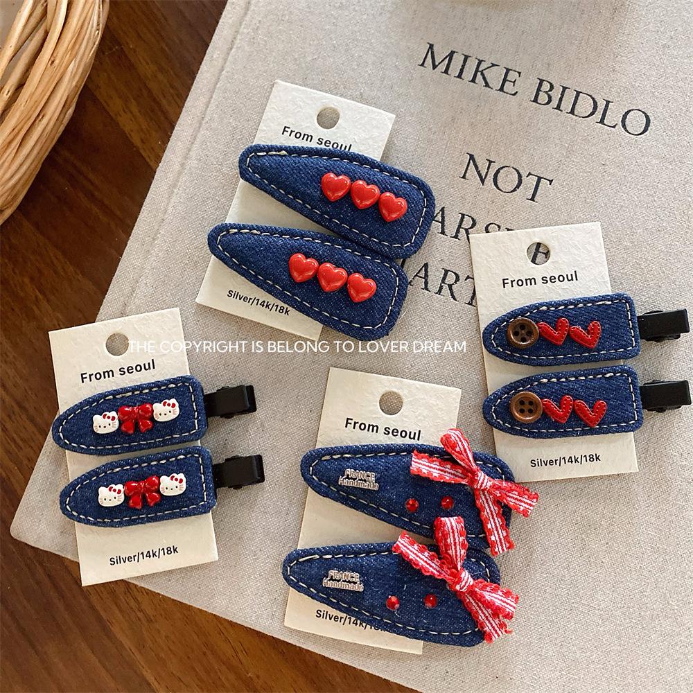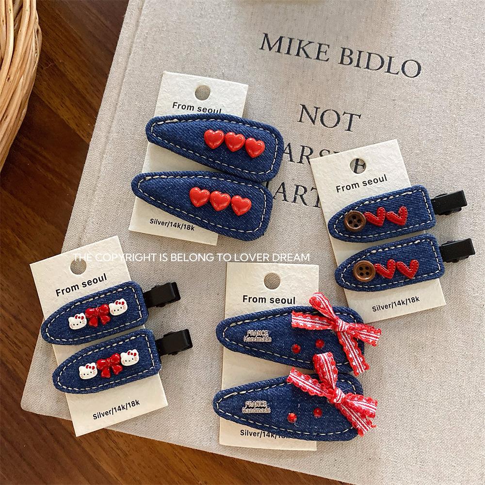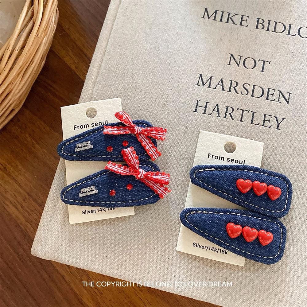 Compre Coreano Ins Novo Coração Vermelho Laço Presilha de Cabelo Jeans Design Doce Franja Clipe Lateral Acessórios de Cabelo no atacado no Joom.pro