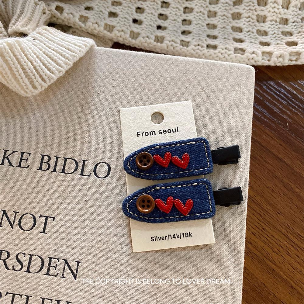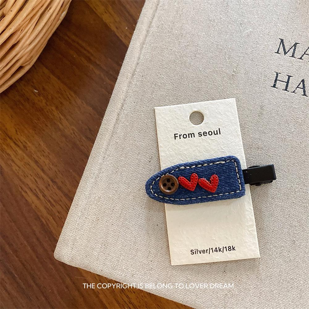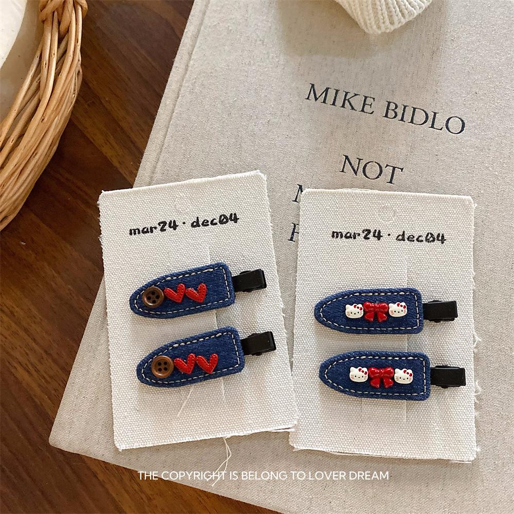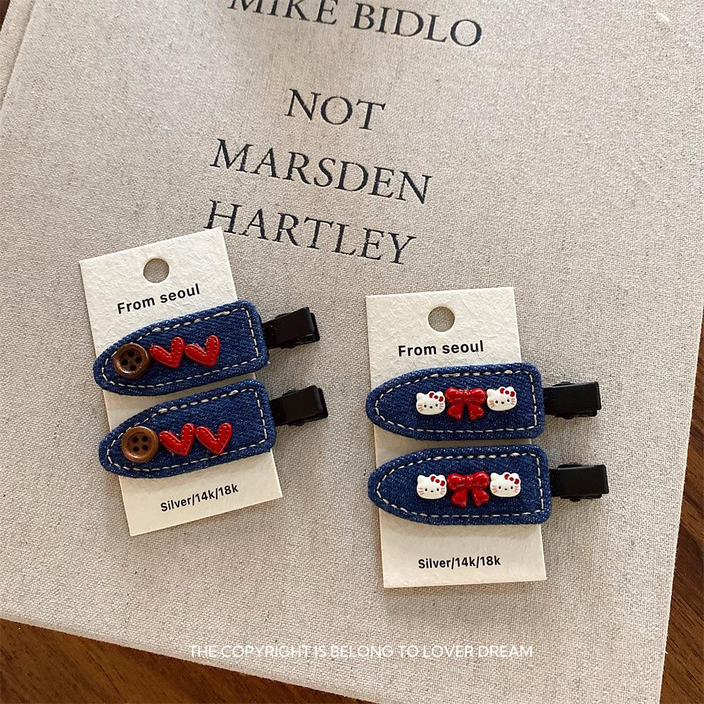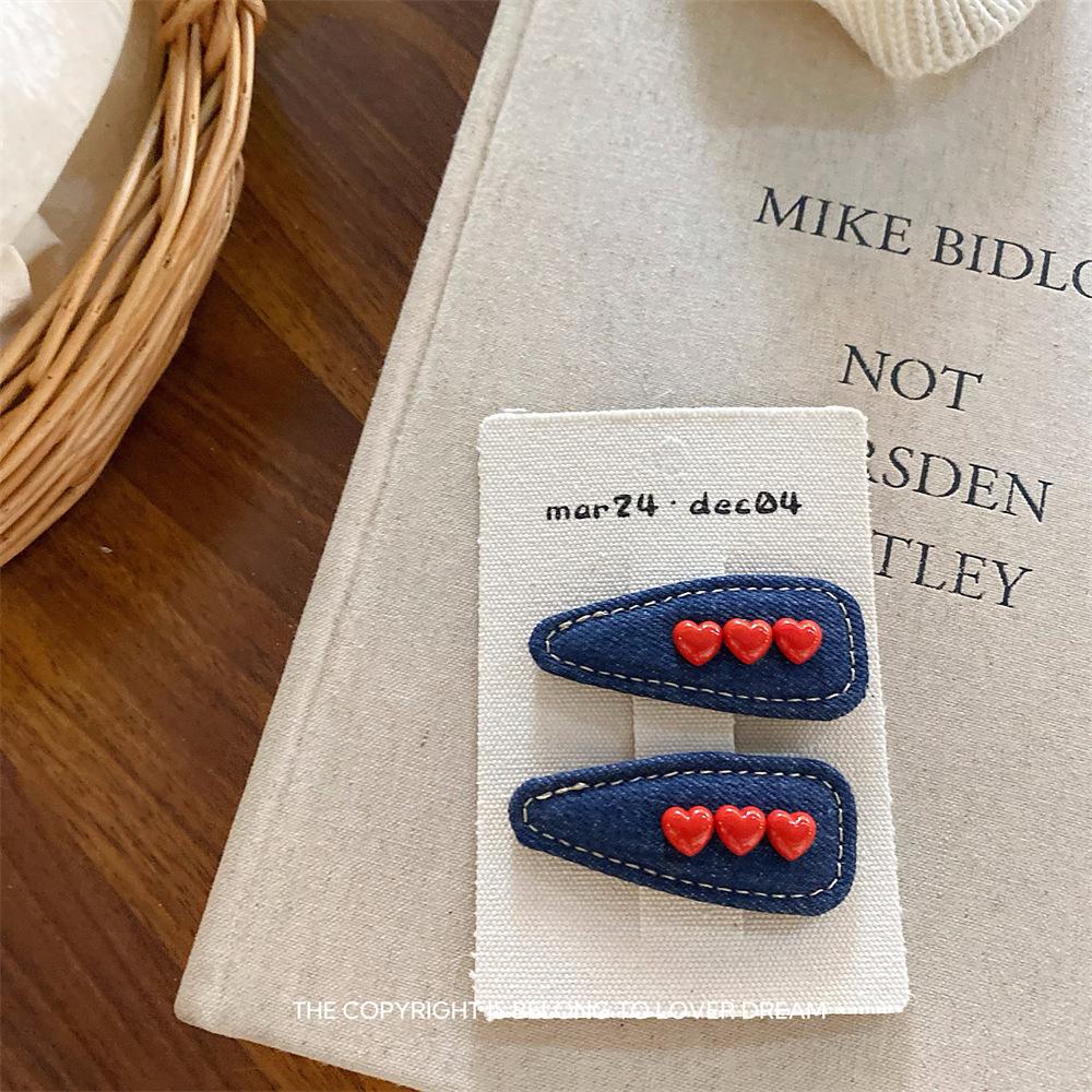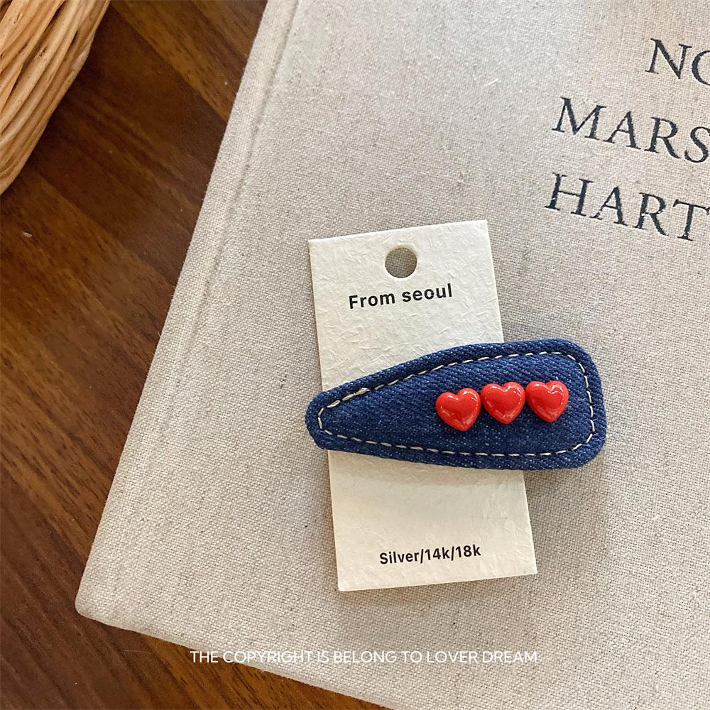 Compre Coreano Ins Novo Coração Vermelho Laço Presilha de Cabelo Jeans Design Doce Franja Clipe Lateral Acessórios de Cabelo no atacado no Joom.pro