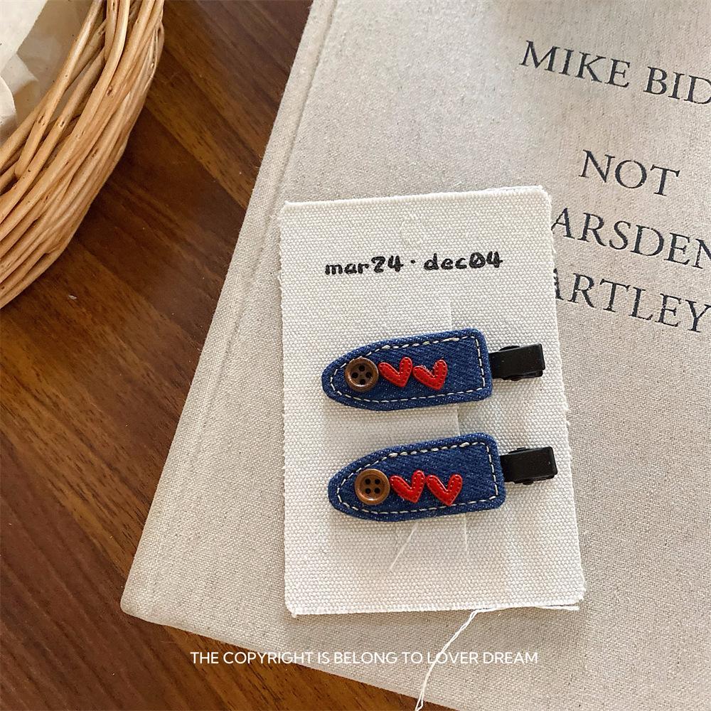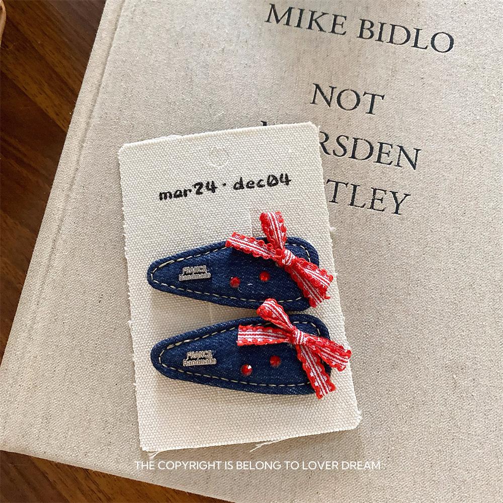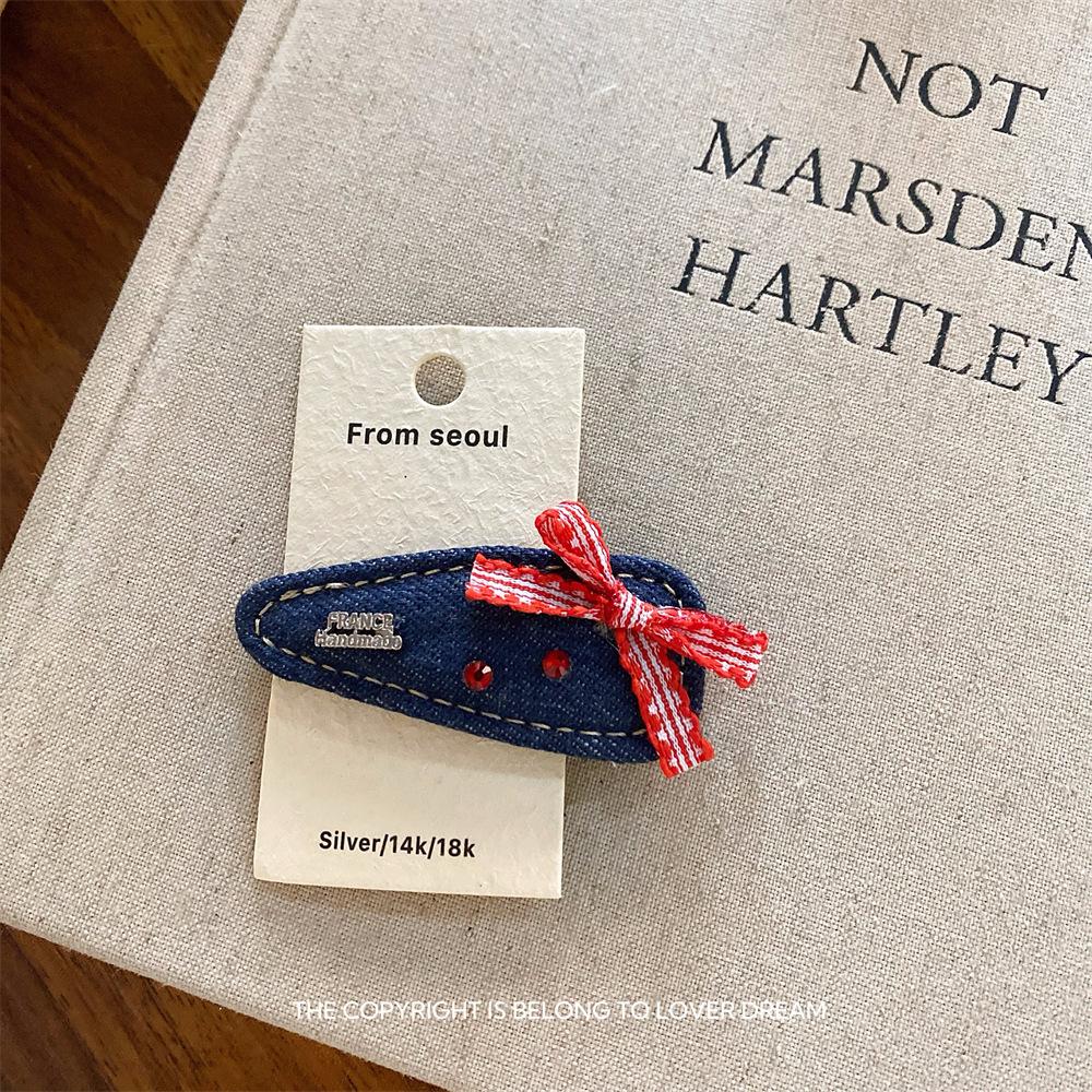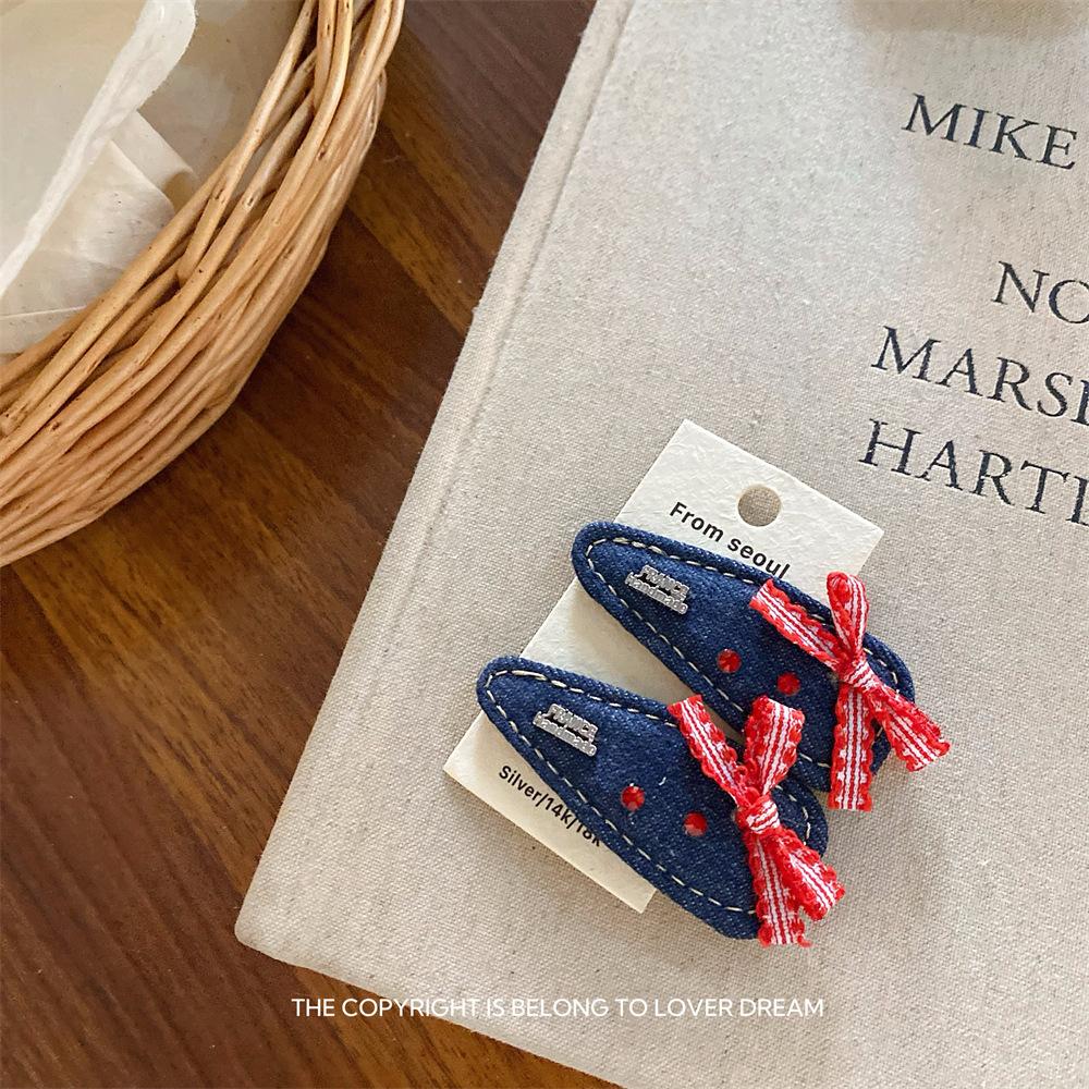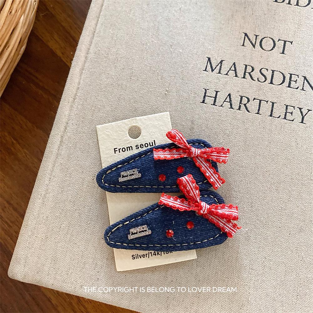 Compre Coreano Ins Novo Coração Vermelho Laço Presilha de Cabelo Jeans Design Doce Franja Clipe Lateral Acessórios de Cabelo no atacado no Joom.pro