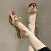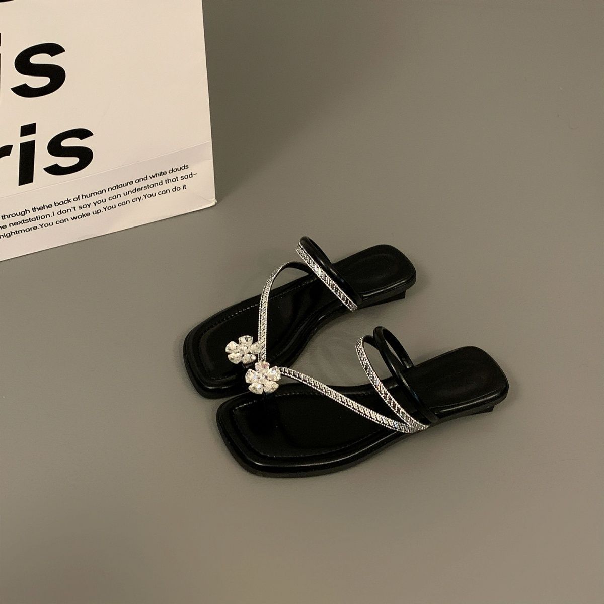 Chinelos franceses de salto baixo estilo fada 2025 novo verão slides de strass femininos para exterior de uma tira slides populares