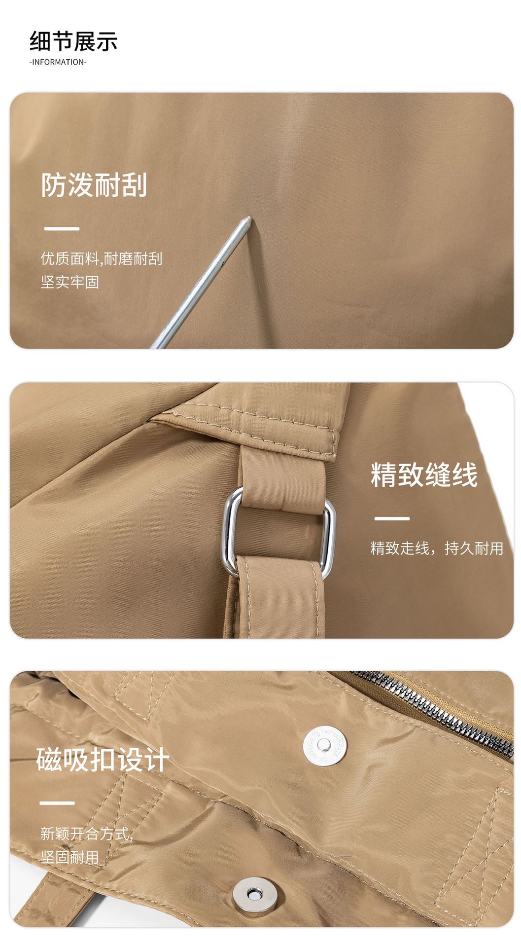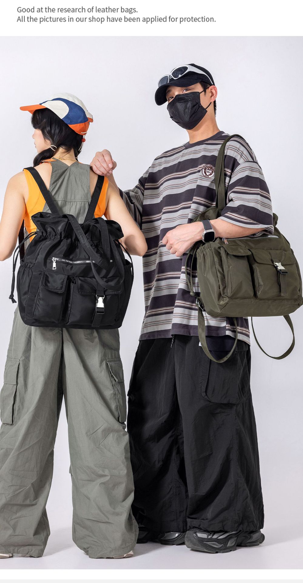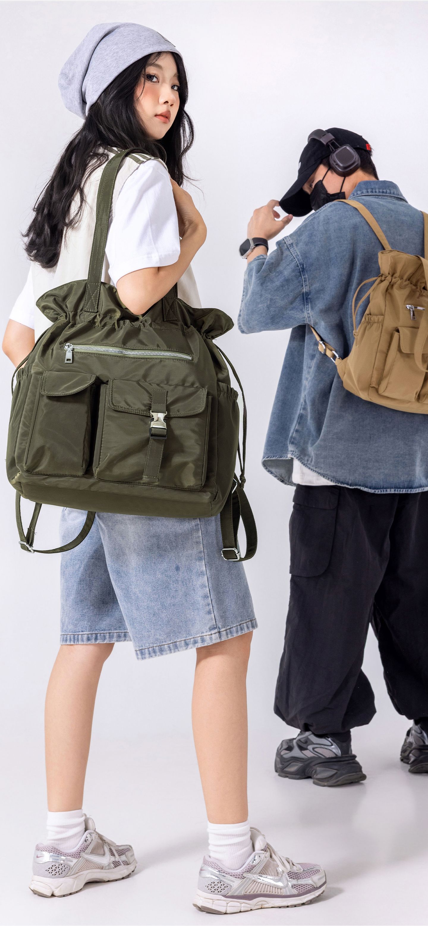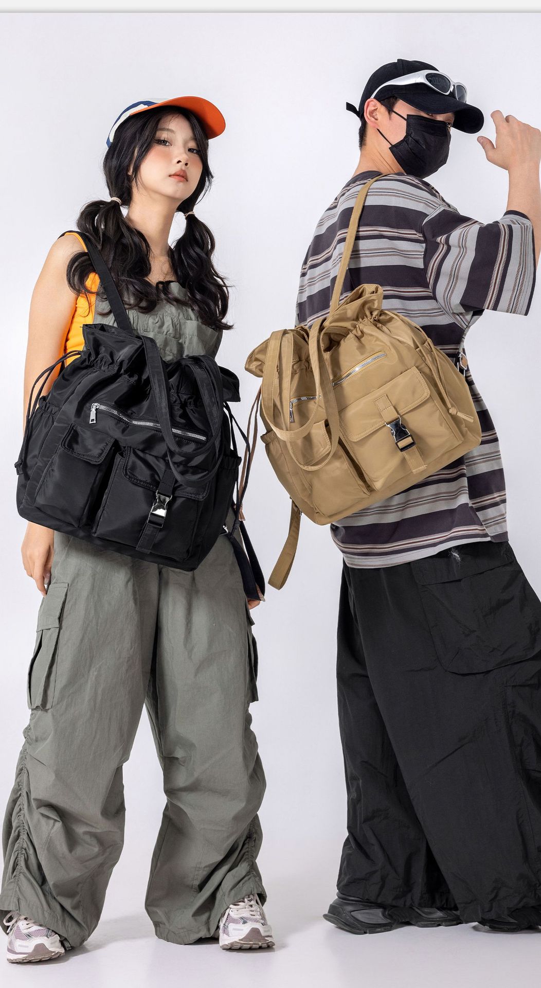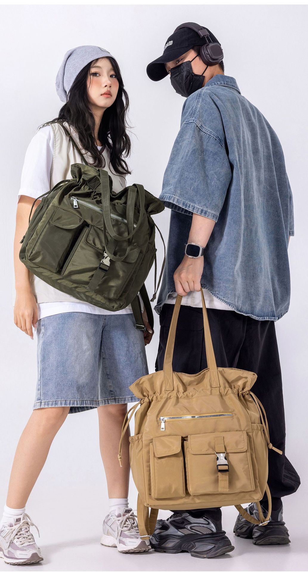 Bolsa de Ombro de Nylon com Cordão e Grande Capacidade para Mulheres, Mochila Simples com Vários Bolsos para Estudantes, Bolsa de Mão Casual Versátil para Mulheres
