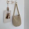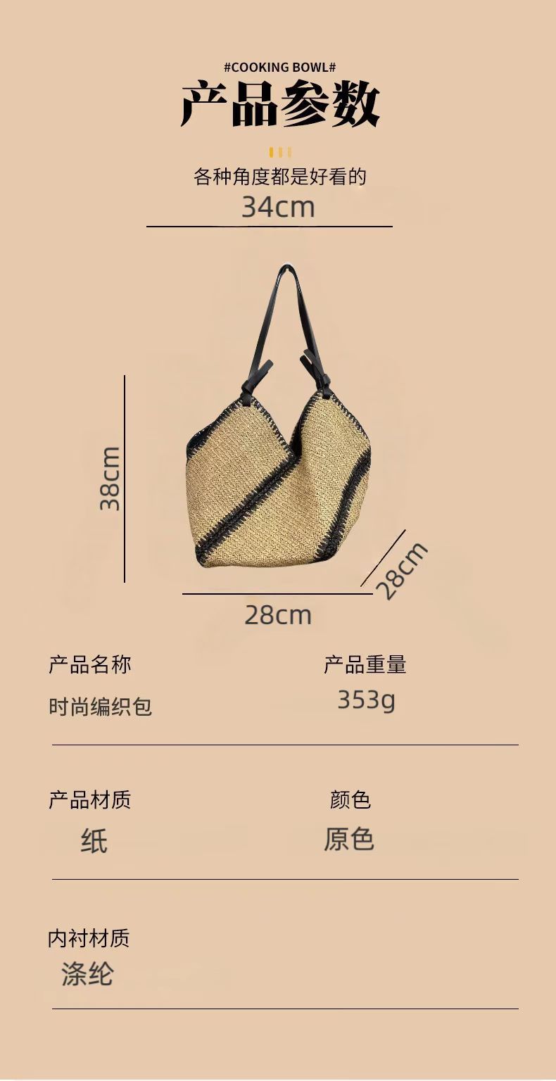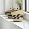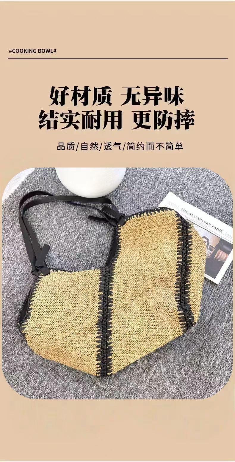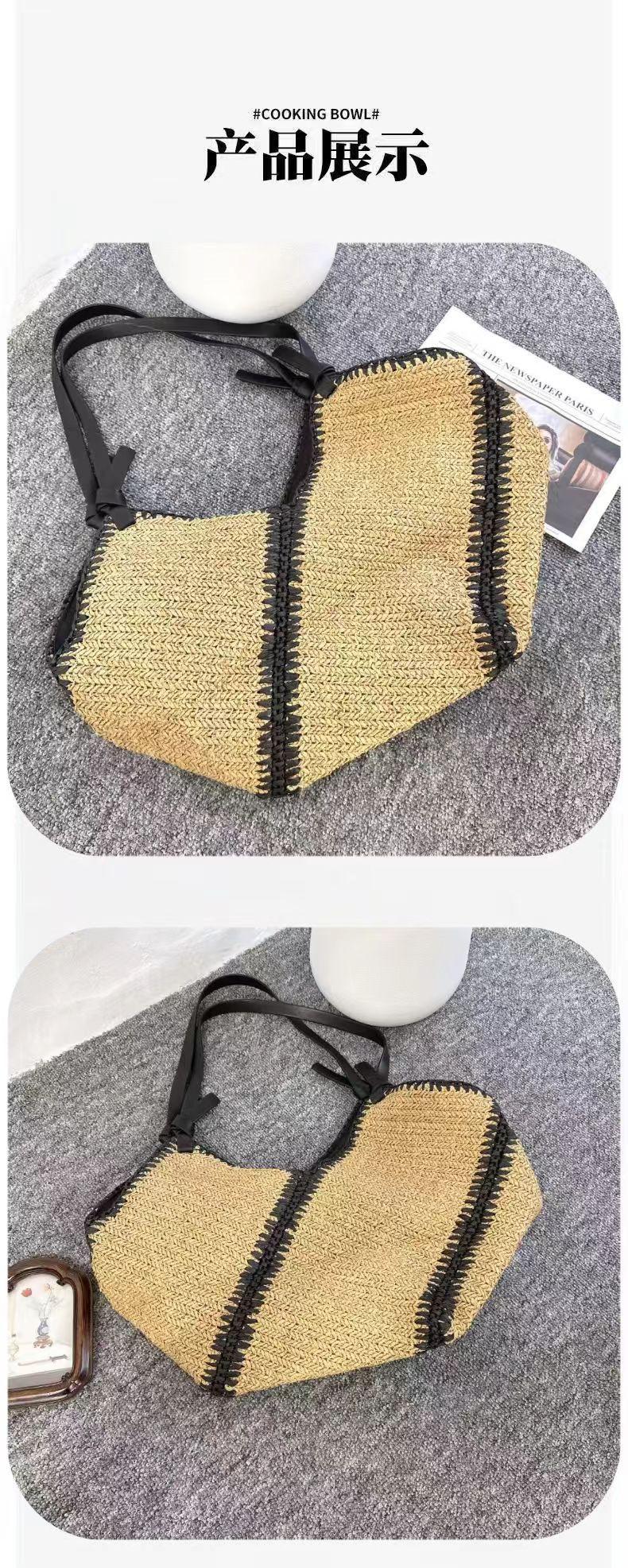 Bolsa de Palha Listrada de Ombro Único Corcunda Nova Casual com Borda Preta Bolsa de Mão Bolsa Tecida Férias à Beira-Mar Bolsa de Praia