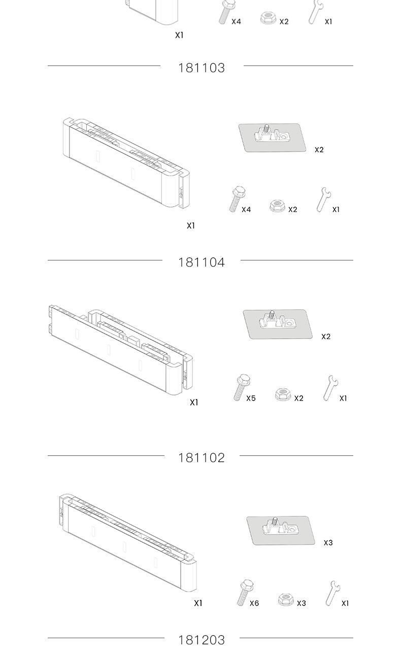 Short single frame 181103, Medium single grid 181104, Long extension 181102, Long double grid 181203