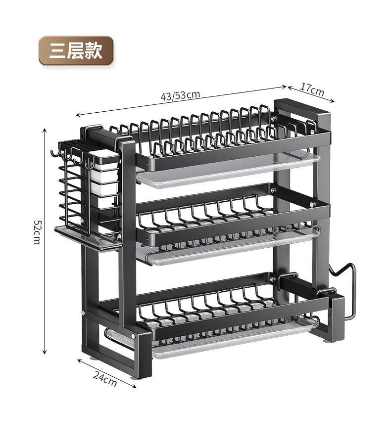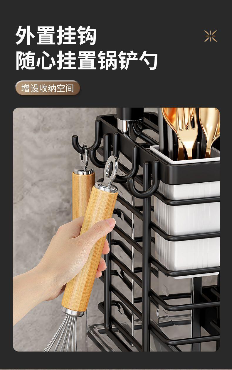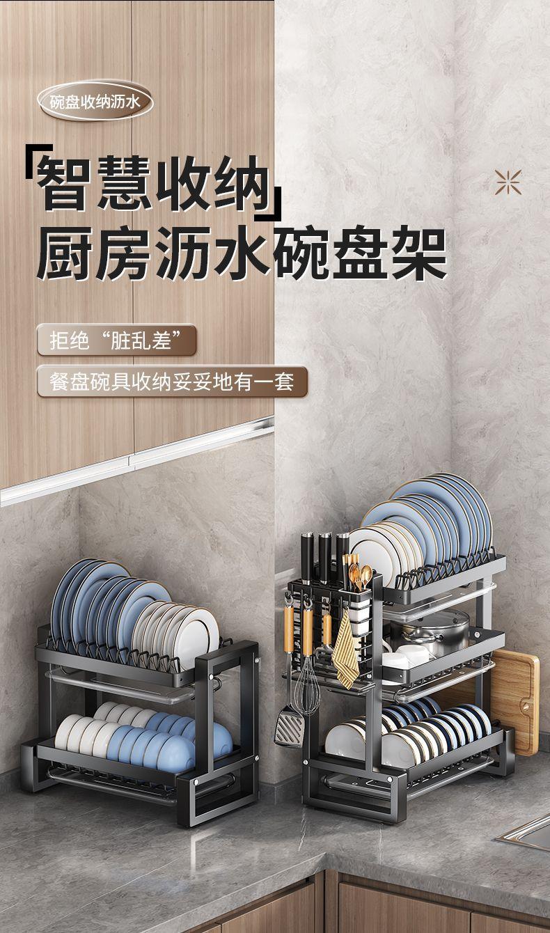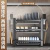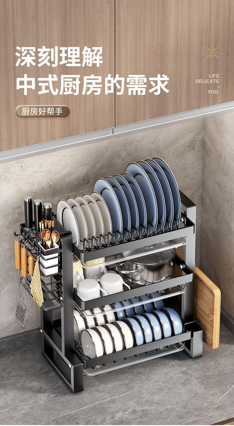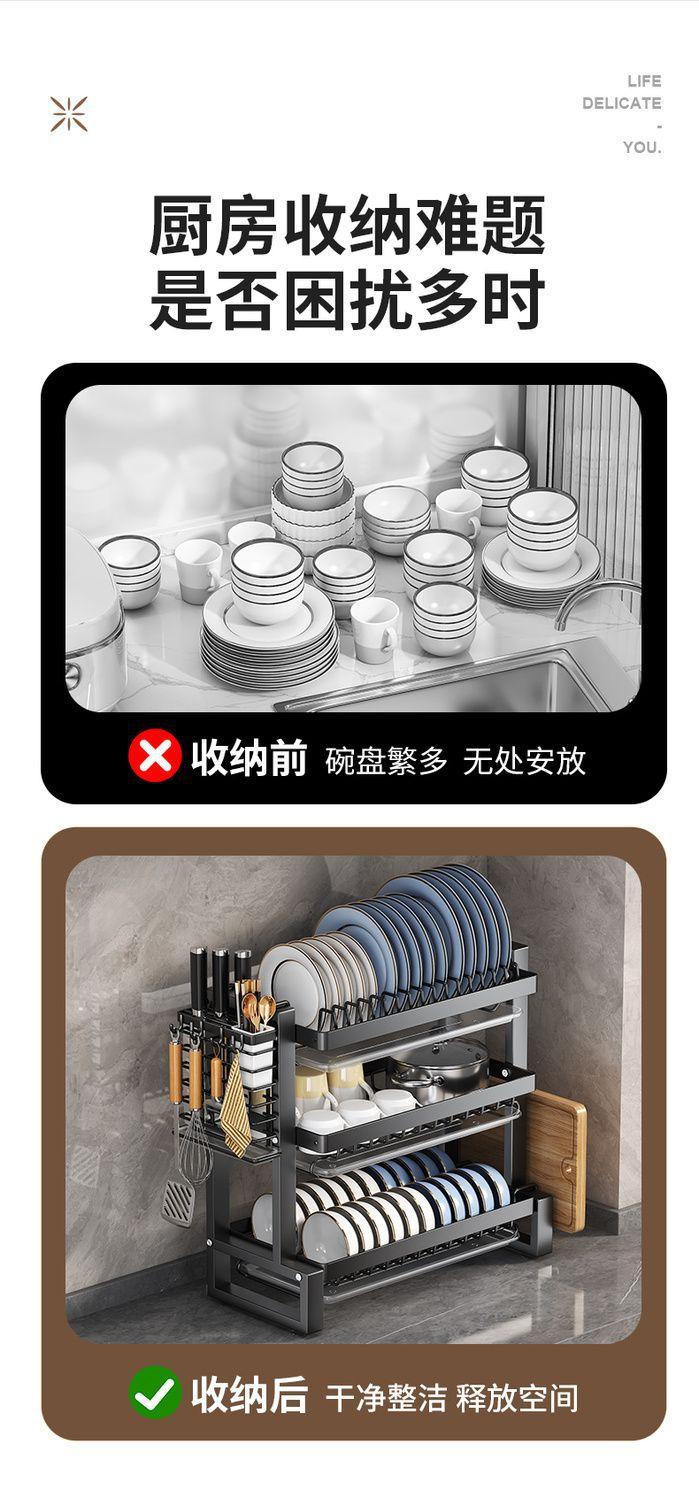 Electric black [high-quality dish rack] upgraded thickened steel - double-layer 43cm main rack with integrated knife and chopstick hook rack - cutting board rack