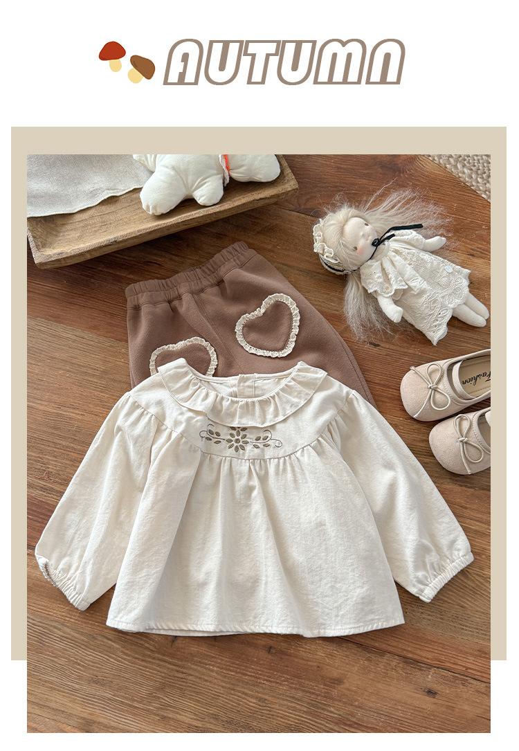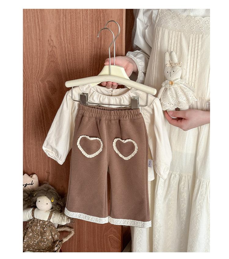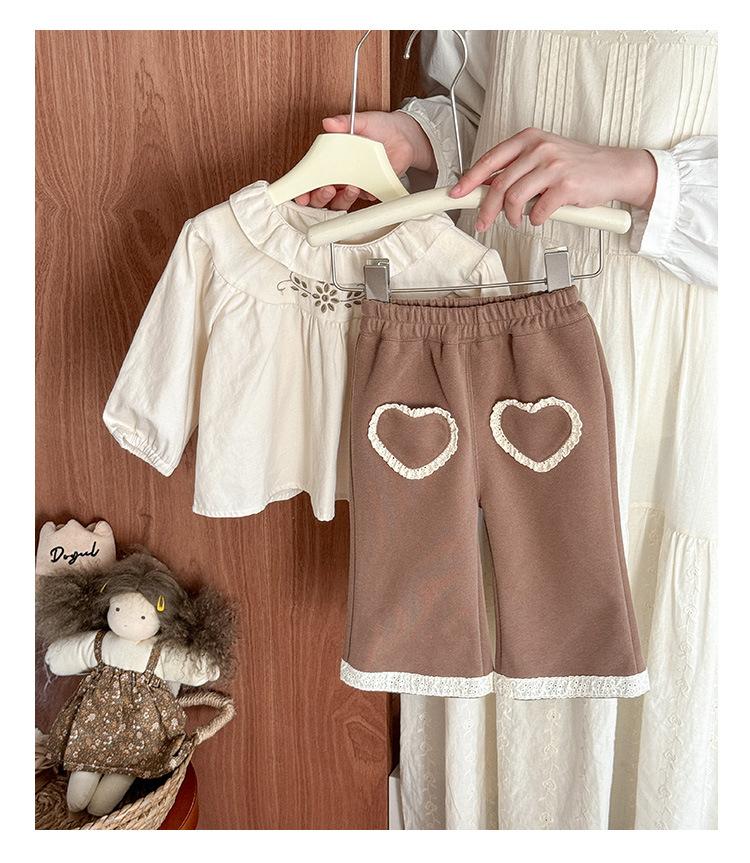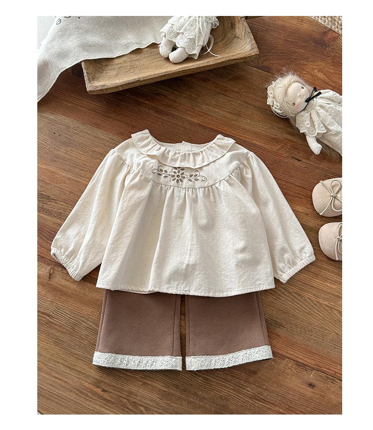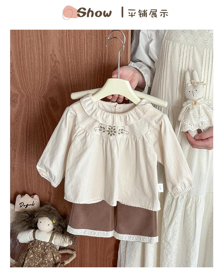 Conjunto Infantil Feminino Outono Novo Estilo Bebê Menina Gola de Renda Camisa de Boneca Manga Longa Top Infantil Calças Conjunto de Duas Peças Classe A