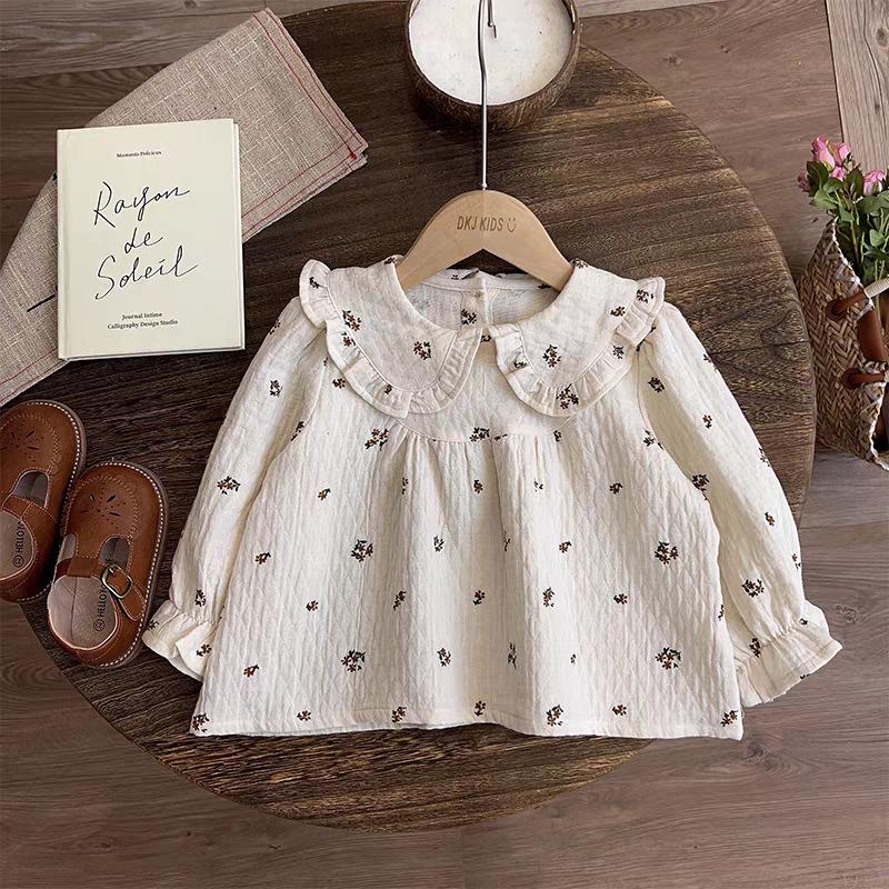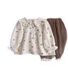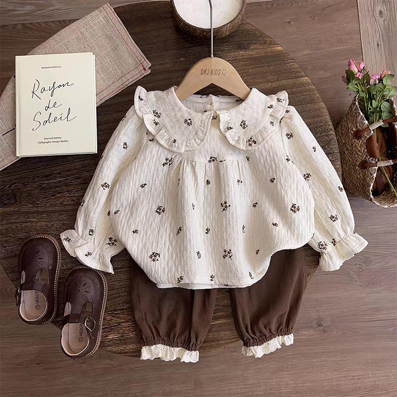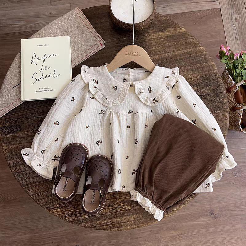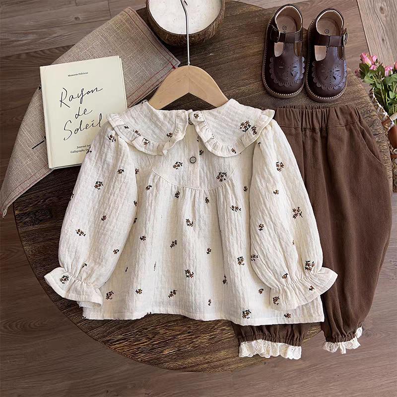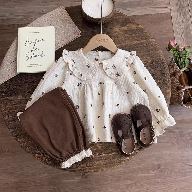 Roupas Infantis Outono 2025 Novas para Meninas Estilo Mori Bebê Menina Floral Boneca Camisa Top e Calças Compridas Conjunto de Duas Peças